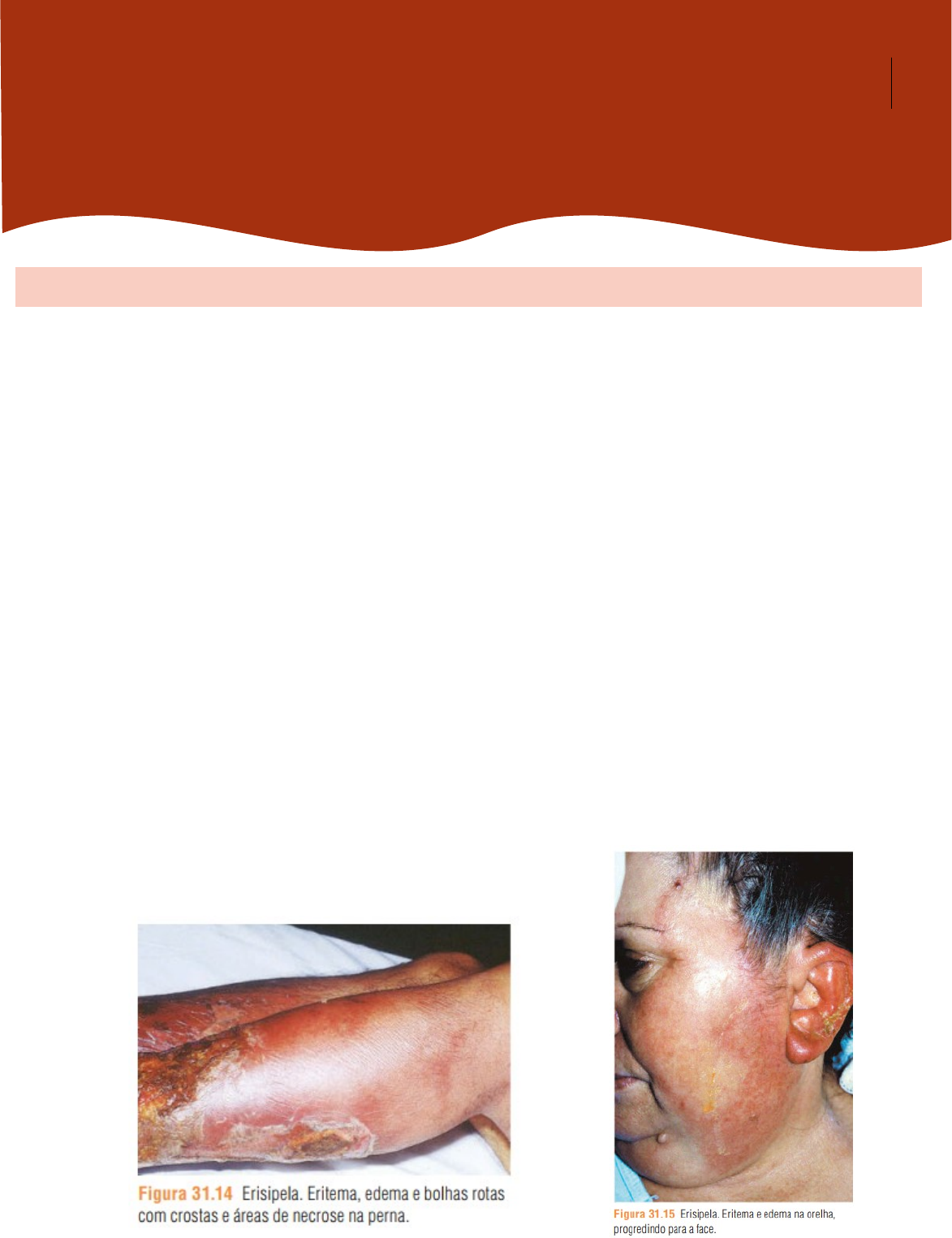 Matheus dos Santos Correia UniFG – Medicina (Dermatologia) 15 Erisipela x Celulite erisipela A erisipela é denominada como a forma aguda e superficial de uma celulite. Por ser mais superficial a sua apresentação clínica pode se distinguir da celulite a principal entidade clínica que estabelece diagnóstico diferencial. A erisipela é causada pelo Streptococos pyogens ou pelo Sthaphyloccocus aureus, não apresentando nenhuma prevalência sobre algum grupo etário. Tais bactérias causa a infecção através da presença de soluções de continuidade (úlceras ou abrasões na pele) com o organismo. Sendo assim, o principal local de acometimento são os membros inferiores, seguido da região cervical e malar. Cabe destacar que algumas condições fisiológicas favorecem o surgimento desse tipo de infecção, por exemplo, presença de estase sanguínea o sistema imunológico suprimido. A apresentação clínica dos pacientes com erisipela se dá pela presença de uma lesão eritematosa com rápida progressão, presença de bordas bem definidas (semelhantes a projeções de pseudópodes), acompanhada de dor, adenomegalia reacional, febre e calor no local. Em alguns casos pode apresentar bolhas (erisipela bolhosa). Cabe destacar que como se tratada de uma infecção mais superficial, a erisipela pode complicar e se transformar em uma celulite (infecção profunda da pele) ou até mesmo uma faceite necrotizante, causando repercussões sistêmicas. O diagnóstico é clínico, sendo ele feito com base na apresentação clínica com as demais entidades: eczemas (sem febre e desvio à esquerda) e celulite (lesão mais profunda, com bordas não delimitas e sem a presença de forma bolhosa). Caso a lesão persista com o tratamento iniciado podemos lançar mão de uma cultura com antibiograma. O tratamento é utilizado penicilina, podendo ser ela a penicilina cristalina (evitar recorrência) ou a amoxicilina (tto domiciliar). O período do tratamento é de 02 semanas a fim de diminuir a chance de recorrência. Cabe destacar que devido o acometimento reacional da cadeia linfática podemos ter a presença da forma recorrente da erisipela a qual demora um pouco mais de tratar. Caso o comprometimento da pele seja mais profundo, podemos utilizar cefalosporina ou macrolídeos. Lembrando que como o acometimento é maior nos membros inferiores devemos sempre orientar os pacientes quanto ao repouso, elevação dos membros e uso de compressas frias. celulite A celulite é caracterizar por uma lesão infecciosa de origem bacteriana mais profunda, acometendo geralmente os membros inferiores, fácia e músculo. Os agentes infecciosos podem ser os mesmos causadores de erisipela (lembrar que uma erisipela pode dar origem a um quadro de celulite). Entretanto, a celulite pode ser causada por outros agentes e pode apresentar origem diferente da infecção. A manifestação clínica mais comum é dor no local com presença de eritema com bordas mal definidas que acomete a derme e hipoderme. A presença de necrose com ulcerações e abscessos também são frequentes e são complicações da celulite. O diagnóstico aqui é clínico podendo em alguns casos complicados haver a necessidade de solicitar uma cultura. Os pacientes neste caso geralmente se apresentam mais toxemiados o que justifica a internação hospitalar e administração de antibióticos por via parenteral.Os acometimentos submandibular e cervical (angina de Ludwig), muitas vezes associados a abscessos dentários, podem ter dor importante e risco de obstrução de vias aéreas e/ou disseminação para o mediastino, sendo por isso uma urgência médica. O tratamento pode ser realizado por cefalosporinas e quinolonas, principalmente o ciprofloxacino. Em casos de pacientes diabéticos podemos associar com clindamicina. Pacientes denominados de alto risco (dor desproporcional, lesões hemorrágicas, bolhar, áreas de anestesia, crepidação e toxemia) devem ser internados e tratados com oxacilina. Devemos ainda sempre avaliar a necessidade de drenagem e desbridamento.