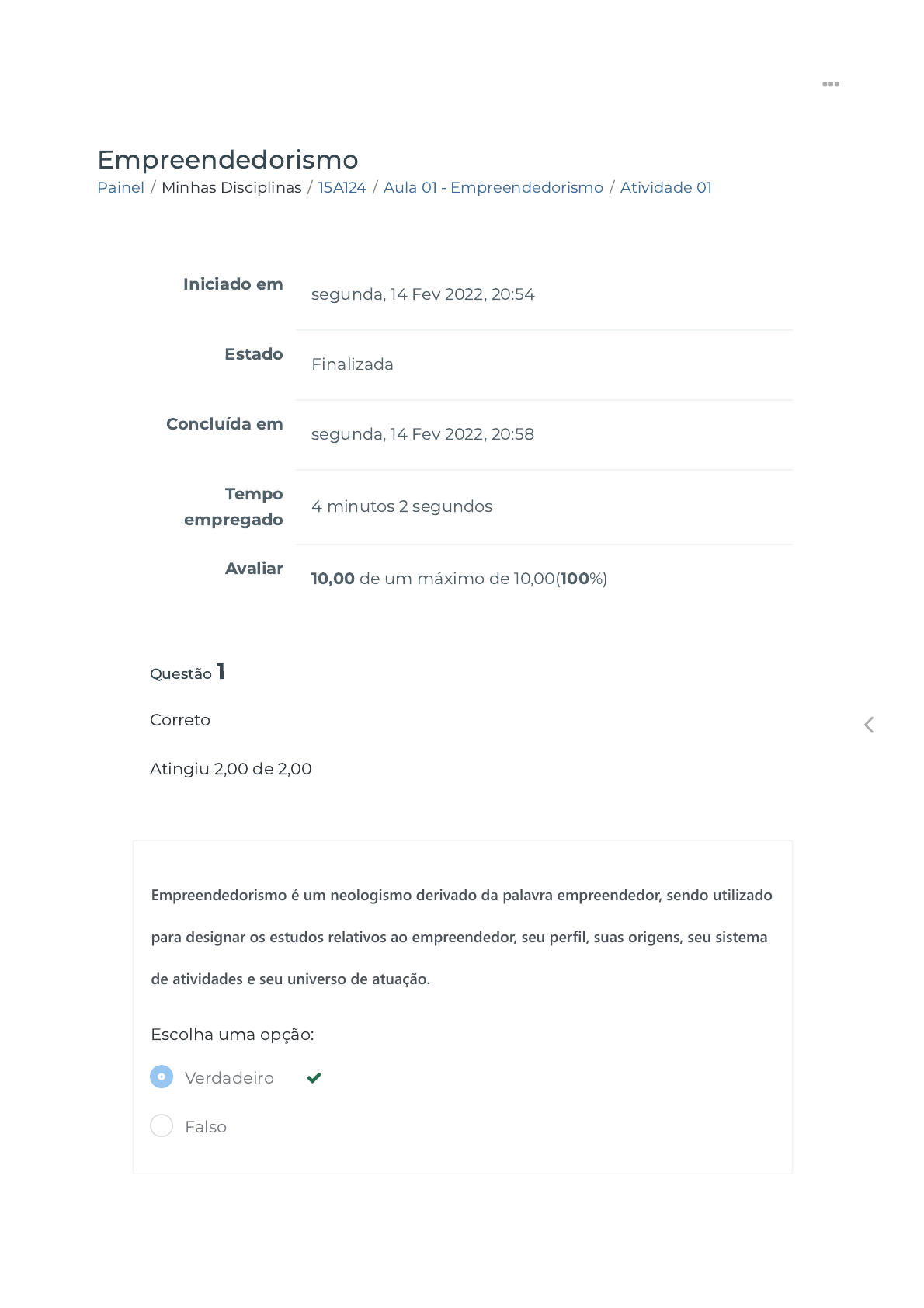 14/02/2022 20:58 Atividade 01 https://ava.politecnicabr.com.br/mod/quiz/review.php?attempt=2640355 1/5 Painel / Minhas Disciplinas / 15A124 / Aula 01 - Empreendedorismo / Atividade 01 Empreendedorismo Iniciado em segunda, 14 Fev 2022, 20:54 Estado Finalizada Concluída em segunda, 14 Fev 2022, 20:58 Tempo empregado 4 minutos 2 segundos Avaliar 10,00 de um máximo de 10,00(100%) Questão 1 Correto Atingiu 2,00 de 2,00 Empreendedorismo é um neologismo derivado da palavra empreendedor, sendo utilizado para designar os estudos relativos ao empreendedor, seu perfil, suas origens, seu sistema de atividades e seu universo de atuação. Escolha uma opção: Verdadeiro Falso https://ava.politecnicabr.com.br/my/ https://ava.politecnicabr.com.br/course/view.php?id=883 https://ava.politecnicabr.com.br/course/view.php?id=883#section-2 https://ava.politecnicabr.com.br/mod/quiz/view.php?id=29022 https://ava.politecnicabr.com.br/ 14/02/2022 20:58 Atividade 01 https://ava.politecnicabr.com.br/mod/quiz/review.php?attempt=2640355 2/5 Questão 2 Correto Atingiu 2,00 de 2,00 Atualmente, o empreendedorismo é visto como um ramo da administração de empresas e, no Primeiro Mundo, as escolas de administração não conseguiram ter um setor, grupo ou área de pesquisa em empreendedorismo. Isso só ser dar atualmente. Escolha uma opção: Questão 3 Correto Atingiu 2,00 de 2,00 O termo empreendedor foi associado ao homem de negócios: Escolha uma opção: Verdadeiro Falso a. bem-sucedido b. Lucrativo c. diferente d. Inovador https://ava.politecnicabr.com.br/ 14/02/2022 20:58 Atividade 01 https://ava.politecnicabr.com.br/mod/quiz/review.php?attempt=2640355 3/5 Questão 4 Correto Atingiu 2,00 de 2,00 Vesper (1980), propôs uma classi�cação dos empreendedores baseada nos diversos modos de operação, chegando a quantos tipos possíveis? Escolha uma opção: a. 9 b. 13 c. 11 d. 10 e. 7 https://ava.politecnicabr.com.br/ 14/02/2022 20:58 Atividade 01 https://ava.politecnicabr.com.br/mod/quiz/review.php?attempt=2640355 4/5 Questão 5 Correto Atingiu 2,00 de 2,00 De forma sintética, podemos agrupar as teorias ou escolas do empreendedorismo em quatro grandes correntes,quais são elas? Escolha uma opção: a. Escola biológica, sociológica, econômica e psicológica b. Escola de desenvolvimento econômico, sociais, biológica e psicológica c. Escola de desenvolvimento econômico, sociais, família e étnicos Entre em Contato https://www.politecnicabr.com.br 0800 084 2627 indisponível devido a pandemia de COVID-19, use outro canal! 0800 084 2627 comercial@politecnicabr.com.br Links Úteis Dicas da nossa Diretora Acadêmica Planner de Estudos Declaração de Matrícula Orientações do AVA Abertura de Ticket Fale com o Tutor Cronograma de Estudos Manual de Estágio https://www.politecnicabr.com.br/ mailto:comercial@politecnicabr.com.br https://soundcloud.com/user-501638417/sets/escola-politecnica-brasileira https://storage.googleapis.com/sirius-pubstore/semestre_plannerdeestudo%20poli.pdf https://storage.googleapis.com/sirius-pubstore/declaracao_matricula.pdf https://storage.googleapis.com/sirius-pubstore/orientacoes_ava.pdf https://storage.googleapis.com/sirius-pubstore/abertura_ticket.pdf https://storage.googleapis.com/sirius-pubstore/fale_com_tutor.pdf https://storage.googleapis.com/sirius-pubstore/cronograma_estudos.pdf https://storage.googleapis.com/sirius-pubstore/manual_estagio.pdf https://ava.politecnicabr.com.br/ 14/02/2022 20:58 Atividade 01 https://ava.politecnicabr.com.br/mod/quiz/review.php?attempt=2640355 5/5 © 2020 - Escola Politécnica Brasileira Manual de Competência Siga-nos nas redes sociais https://ava.politecnicabr.com.br/mod/quiz/0 https://storage.googleapis.com/sirius-pubstore/manual_competencia.pdf https://www.facebook.com/politecnicabr https://www.instagram.com/politecnicabr_oficial https://ava.politecnicabr.com.br/