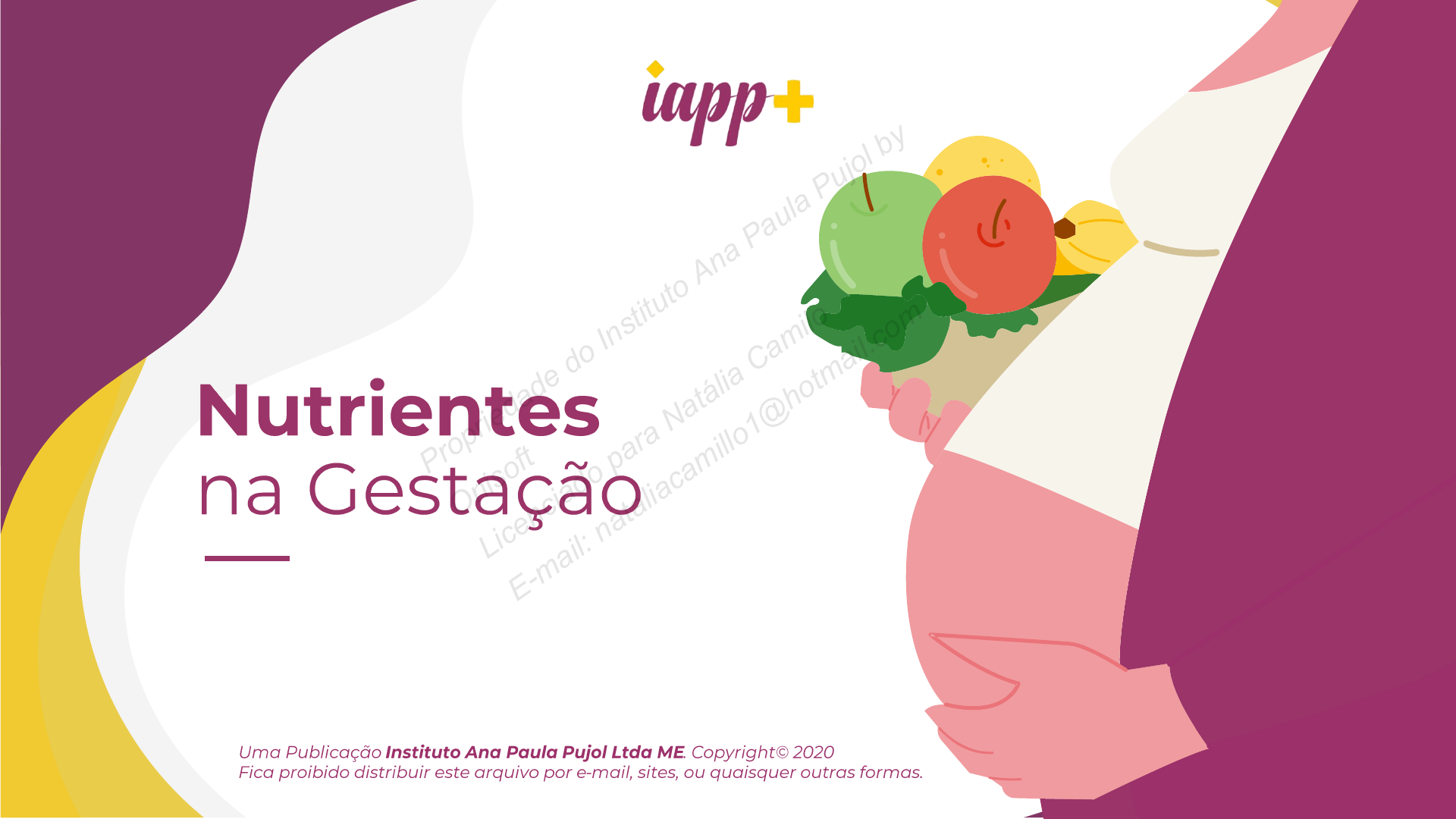 Pro pri ed ad e d o I ns titu to An a P au la Pu jol by On iso ft Lic en cia do pa ra Na tál ia Ca mi lo E-m ail: na tal iac am illo 1@ ho tm ail. co m Pro pri ed ad e d o I ns titu to An a P au la Pu jol by On iso ft Lic en cia do pa ra Na tál ia Ca mi lo E-m ail: na tal iac am illo 1@ ho tm ail. co m Pro pri ed ad e d o I ns titu to An a P au la Pu jol by On iso ft Lic en cia do pa ra Na tál ia Ca mi lo E-m ail: na tal iac am illo 1@ ho tm ail. co m Pro pri ed ad e d o I ns titu to An a P au la Pu jol by On iso ft Lic en cia do pa ra Na tál ia Ca mi lo E-m ail: na tal iac am illo 1@ ho tm ail. co m Pro pri ed ad e d o I ns titu to An a P au la Pu jol by On iso ft Lic en cia do pa ra Na tál ia Ca mi lo E-m ail: na tal iac am illo 1@ ho tm ail. co m Pro pri ed ad e d o I ns titu to An a P au la Pu jol by On iso ft Lic en cia do pa ra Na tál ia Ca mi lo E-m ail: na tal iac am illo 1@ ho tm ail. co m Semana gestacional Baixo peso (BP) IMC ≤ Adequado (A) IMC entre Sobrepeso (S) IMC entre Obesidade (O) IMC ≥ 6 19,9 20,0 24,9 25,0 30,0 30,1 8 20,1 20,2 25,0 25,1 30,1 30,2 10 20,2 20,3 25,2 25,3 30,2 30,3 11 20,3 20,4 25,3 25,4 30,3 30,4 12 20,4 20,5 25,4 25,5 30,3 30,4 13 20,6 20,7 25,6 25,7 30,4 30,5 14 20,7 20,8 25,7 25,8 30,5 30,6 15 20,8 20,9 25,8 25,9 30,6 30,7 16 21,0 21,1 25,9 26,0 30,7 30,8 17 21,1 21,2 26,0 26,10 30,8 30,9 18 21,2 21,3 26,1 26,2 30,9 31,0 19 21,4 21,4 26,2 26,3 30,9 31,0 20 21,5 21,6 26,3 26,4 31,0 31,1 21 21,7 21,8 26,4 26,5 31,1 31,2 22 21,8 21,9 26,6 26,7 31,2 31,3 23 22,0 22,1 26,8 26,9 31,3 31,4 24 22,2 22,3 26,9 27,0 31,5 31,6 25 22,4 22,5 27,0 27,1 31,6 31,7 26 22,6 22,7 27,2 27,3 31,7 31,8 27 22,7 22,8 27,3 27,4 31,8 31,9 28 22,9 23,0 27,5 27,6 31,9 32,0 29 23,1 23,2 27,6 27,7 32,0 32,1 30 23,3 23,4 27,8 27,9 32,1 32,2 31 23,4 23,5 27,9 28,0 32,2 32,3 32 23,6 23,7 28,0 28,1 32,3 32,4 33 23,8 23,9 28,1 28,2 32,4 32,5 34 23,9 24,0 28,3 28,4 32,5 32,6 35 24,1 24,2 28,4 28,5 32,6 32,7 36 24,2 24,3 28,5 28,6 32,7 32,8 37 24,4 24,5 28,7 28,8 32,8 32,9 38 24,5 24,6 28,8 28,9 32,9 33,0 39 24,7 24,8 28,9 29,0 33,0 33,1 40 24,9 25,0 29,1 29,2 33,1 33,2 41 25,0 25,1 29,2 29,3 33,2 33,3 42 25,0 25,1 29,2 29,3 33,2 33,3 Pro pri ed ad e d o I ns titu to An a P au la Pu jol by On iso ft Lic en cia do pa ra Na tál ia Ca mi lo E-m ail: na tal iac am illo 1@ ho tm ail. co m Pro pri ed ad e d o I ns titu to An a P au la Pu jol by On iso ft Lic en cia do pa ra Na tál ia Ca mi lo E-m ail: na tal iac am illo 1@ ho tm ail. co m Estado nutricional inicial (IMC) Ganho de peso (Kg) total no 1º trimestre Ganho de peso (Kg) semanal médio no 2º e 3º trimestre Ganho de peso (Kg) total na gestação Baixo peso (BP) 2,3 0,5 12,5 – 18,0 Adequado (A) 1,6 0,4 11,5 – 16,0 Sobrepeso (S) 0,9 0,3 7,0 – 11,5 Obesidade (O) - 0,3 7,0 Pro pri ed ad e d o I ns titu to An a P au la Pu jol by On iso ft Lic en cia do pa ra Na tál ia Ca mi lo E-m ail: na tal iac am illo 1@ ho tm ail. co m Pro pri ed ad e d o I ns titu to An a P au la Pu jol by On iso ft Lic en cia do pa ra Na tál ia Ca mi lo E-m ail: na tal iac am illo 1@ ho tm ail. co m Pro pri ed ad e d o I ns titu to An a P au la Pu jol by On iso ft Lic en cia do pa ra Na tál ia Ca mi lo E-m ail: na tal iac am illo 1@ ho tm ail. co m Pro pri ed ad e d o I ns titu to An a P au la Pu jol by On iso ft Lic en cia do pa ra Na tál ia Ca mi lo E-m ail: na tal iac am illo 1@ ho tm ail. co m Pro pri ed ad e d o I ns titu to An a P au la Pu jol by On iso ft Lic en cia do pa ra Na tál ia Ca mi lo E-m ail: na tal iac am illo 1@ ho tm ail. co m Pro pri ed ad e d o I ns titu to An a P au la Pu jol by On iso ft Lic en cia do pa ra Na tál ia Ca mi lo E-m ail: na tal iac am illo 1@ ho tm ail. co m Pro pri ed ad e d o I ns titu to An a P au la Pu jol by On iso ft Lic en cia do pa ra Na tál ia Ca mi lo E-m ail: na tal iac am illo 1@ ho tm ail. co m Pro pri ed ad e d o I ns titu to An a P au la Pu jol by On iso ft Lic en cia do pa ra Na tál ia Ca mi lo E-m ail: na tal iac am illo 1@ ho tm ail. co m Gênero/ faixa etária AI*/RDA Gestantes e lactantes 14 – 18 anos 450 mg* Gestantes e lactantes 19 – 30 anos 450 mg* Gestantes e lactantes 31 – 50 anos 450 mg* Nutriente Gestantes Colina ND Gênero/ faixa etária UL Gestantes e lactantes 14 – 18 anos 3 g Gestantes e lactantes 19 – 30 anos 3,5 g Gestantes e lactantes 31 – 50 anos 3,5 g Pro pri ed ad e d o I ns titu to An a P au la Pu jol by On iso ft Lic en cia do pa ra Na tál ia Ca mi lo E-m ail: na tal iac am illo 1@ ho tm ail. co m Pro pri ed ad e d o I ns titu to An a P au la Pu jol by On iso ft Lic en cia do pa ra Na tál ia Ca mi lo E-m ail: na tal iac am illo 1@ ho tm ail. co m Gênero/ faixa etária AI*/RDA Gestantes e lactantes 14 – 18 anos 1300mg Gestantes e lactantes 19 – 30 anos 1000mg Gestantes e lactantes 31 – 50 anos 1000mg Nutriente Gestantes Cálcio 2.016 mg Gênero/ faixa etária UL Gestantes e lactantes 14 – 18 anos 3000mg Gestantes e lactantes 19 – 30 anos 2500mg Gestantes e lactantes 31 – 50 anos 2500mg Cálcio quelato Cálcio quelato taste free Cálcio D glucarato Pro pri ed ad e d o I ns titu to An a P au la Pu jol by On iso ft Lic en cia do pa ra Na tál ia Ca mi lo E-m ail: na tal iac am illo 1@ ho tm ail. co m Gênero/ faixa etária AI*/RDA Gestantes e lactantes 14 – 18 anos 400 mg Gestantes e lactantes 19 – 30 anos 350 mg Gestantes e lactantes 31 – 50 anos 360 mg Nutriente Gestantes Magnésio 350 mg Gênero/ faixa etária UL Gestantes e lactantes 14 – 18 anos 350 mg Gestantes e lactantes 19 – 30 anos 350 mg Gestantes e lactantes 31 – 50 anos 350 mg Magnésio quelato (mais comum, excelente biodisponibilidade) Magnésio chelazome (altamente biodisponível, sem competição iônica) Magnésio dimalato (para fadiga e dor muscular) Magnésio L-treonato (para atividade cognitiva e saúde cerebral) Magnésio inositol (para insônia) Pro pri ed ad e d o I ns titu to An a P au la Pu jol by On iso ft Lic en cia do pa ra Na tál ia Ca mi lo E-m ail