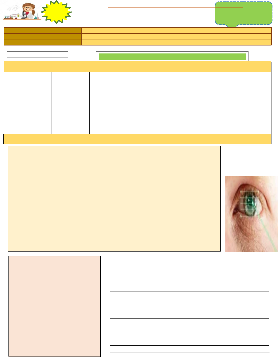 ( 3 y 4 SEC . ) ( Bienvenidos estimados estudiantes a este nuevo año de aprendizajes 2021. )EVALUACIÓN DIAGNÓSTICA DE ENTRADA CIENCIA Y TECNOLOGÍA 1. DATOS GENERALES: I.E. : SAN MIGUEL GRADO Y SECCIÓN : ALUMNO : PROF. Delia Castro Garrido. SITUACIONES SIGNIFICATIVAS PROPUESTA POR EL MINEDU ¿Cómo nos afecta la iluminancia de la luz? COMPETENCIA: · Indaga mediante métodos científicos para construir conocimientos. · Explica el mundo físico basándose en conocimientos sobre los seres vivos, materia y energía, biodiversidad, Tierra y universo. CAPACIDADES: · Problematiza situaciones para hacer indagación. · Evalúa las implicancias del saber y el quehacer científico y tecnológico. PROPÓSITO: · Explicar acerca de los valores de iluminancia registrados y las características de la luz y de otras ondas electromagnéticas a partir de los resultados de la indagación y de nuevos conocimientos incluidos. · evaluar las implicancias en la salud de las personas debido a la exposición a las diferentes ondas electromagnéticas RETO: · Comunicar a la comunidad cómo medir la iluminancia dentro de sus hogares y qué acciones puede tomar para evitar daños a la salud de las personas, debido a la exposición de diferentes tipos de ondas electromagnéticas. EVIDENCIA: · Texto de difusión que permita comunicar a la comunidad cómo medir la iluminancia dentro de sus hogares y qué acciones puede tomar para evitar daños a la salud de las personas, debido a la exposición de diferentes tipos de ondas electromagnéticas PRODUCTO DEL PROYECTO: · Elaboran el texto de difusión. EXPLORAMOS ( SITUACIÓN SIGNIFICATIVA Cuando miras una pantalla o estás cerca de una lámpara, esta tiene una cierta iluminancia (cantidad de luz que emite una fuente e ilumina una determinada superficie, la cual se mide en lux o lumen/m2). En la actualidad, a causa de la pandemia hay un aumento significativo del uso de dispositivos eléctricos y electrónicos, y, por tanto, una mayor exposición a la iluminancia de pantallas de computadoras, televisores, laptops, focos, lámparas o incluso la luz solar, calculada aproximadamente en unas 6 horas al día; pero ¿sabías que si la iluminación es inadecuada puedes tener problemas que afecten a la retina? Varios estudios indican que diferentes fuentes de luz irradian su iluminancia a nuestros ojos, provocando un leve calentamiento en la superficie de nuestros ojos y, con esto, una sequedad. Esta sequedad, acompañada del esfuerzo de acomodar el ojo para ver un objeto, puede ser perjudicial. Por eso existen niveles de iluminancia recomendados para el interior de una casa; por ejemplo, en un dormitorio la iluminancia que llega a tus ojos debería tener valores entre 100 y 200 lux, pero se requiere unos 500 lux si vas a leer, y un espacio más limitado como una sala de estar o un cuarto pequeño, debería tener unos 100 lux; pero si allí vas a ver televisión requerirás de 50 a 70 lux. Para saber más sobre la luz proveniente de diferentes fuentes luminosas, puedes medir su iluminancia usando un aplicativo que se encuentra en los teléfonos. ) ( Para responder a estos cuestionamientos: Indagaremos sobre los factores que afectan la iluminancia proveniente de una fuente de luz, planteando preguntas e hipótesis, proponiendo estrategias para comprobarlas, experimentando registrando información para analizarla y, luego, elaborar una conclusión. Sustentaremos, usando la información y los resultados observados, qué características tiene la luz y otras ondas electromagnéticas, y daremos una opinión con respecto a las implicancias del uso de fuentes que emiten ondas electromagnéticas en el ambiente y en la sociedad. ) ( Respondemos: ¿Qué iluminancia tienen diferentes fuentes de luz? ¿Cómo se puede indagar sobre la iluminancia que llega a nuestros ojos? ¿Cómo afectan al ambiente y a la sociedad el uso de otras fuentes de esta y otras ondas electromagnéticas? ¿Qué factores hacen que la iluminancia que llega a nuestros ojos sea mayor o menor y cómo podemos estudiarlos? _ ) ( I.E. SAN MIGUEL ) ( Prof. Delia Castro Garrido ) ( Formulamos nuestra hipótesis: . ) ( Variable interviniente: Tipo de foco, tipo de luxómetro. ) ( Variable pendiente: Iluminancia ) ( Variable independiente: Distancia a la fuente de luz, la potencia de la fuente. ) ( PROCEDIMINETO Cómo van a manipular la variable independiente, medir la variable dependiente y controlar las variables intervinientes; por ejemplo, mencionen qué luxómetro van a utilizar (hay 10 o 15 aplicativos disponibles de forma gratuita en los teléfonos inteligentes), A qué distancias distintas a la fuente o en cuántas fuentes diferentes se va a medir la iluminancia, cuántas repeticiones van a hacer para la obtención de cada dato (podrían ser 3 o 4), qué medidas de seguridad van a considerar (por ejemplo, usar lentes oscuros) y cuánto tiempo va a tomar la experiencia completa. Pregunta de indagación: ¿En qué medida influye la distancia de medición en la iluminancia del foco? ) ( ELABORAMOS NUESTRAS HIPÓTESIS ) ( REGISTRAMOS NUESTROS RESULTADOS AQUÍ ) Iluminancia (lux) Distancia a la fuente (±0,5 cm) Prueba 1 Prueba 2 Prueba 3 Prueba 4 Media Incertidumbre 10,0 20,0 30,0 40,0 50,0 60,0 70,0 ( IMPORTANTE: Inicien la toma de datos y presenten, de preferencia, evidencias del proceso a través de fotos o vídeos muy cortos en los que se les vea tomando datos a menos que la actividad se haga en clase. SI NO CUENTAS CON UN EQUIPO PUEDES TOMAR EN CUENTA ESTA TABLA ) ( Fuente: foco LED, luz cálida, 24 W Distanciaalafuente: 10±0,5cm, Iluminancia (lux):2985, 2708,3400y3535 Distanciaalafuente: 20±0,5cm, Iluminancia (lux):938,1195,1084y1104 Distanciaa la fuente: 30 ± 0,5 cm, Iluminancia (lux): 712, 730, 723 y 750 Distanciaalafuente: 40 ±0,5 cm, Iluminancia (lux): 611,551, 620 y 612 Distanciaa la fuente: 50 ± 0,5 cm, Iluminancia (lux): 498, 480, 534 y 478 Distancia a la fuente: 60 ± 0,5 cm, Iluminancia (lux): 40