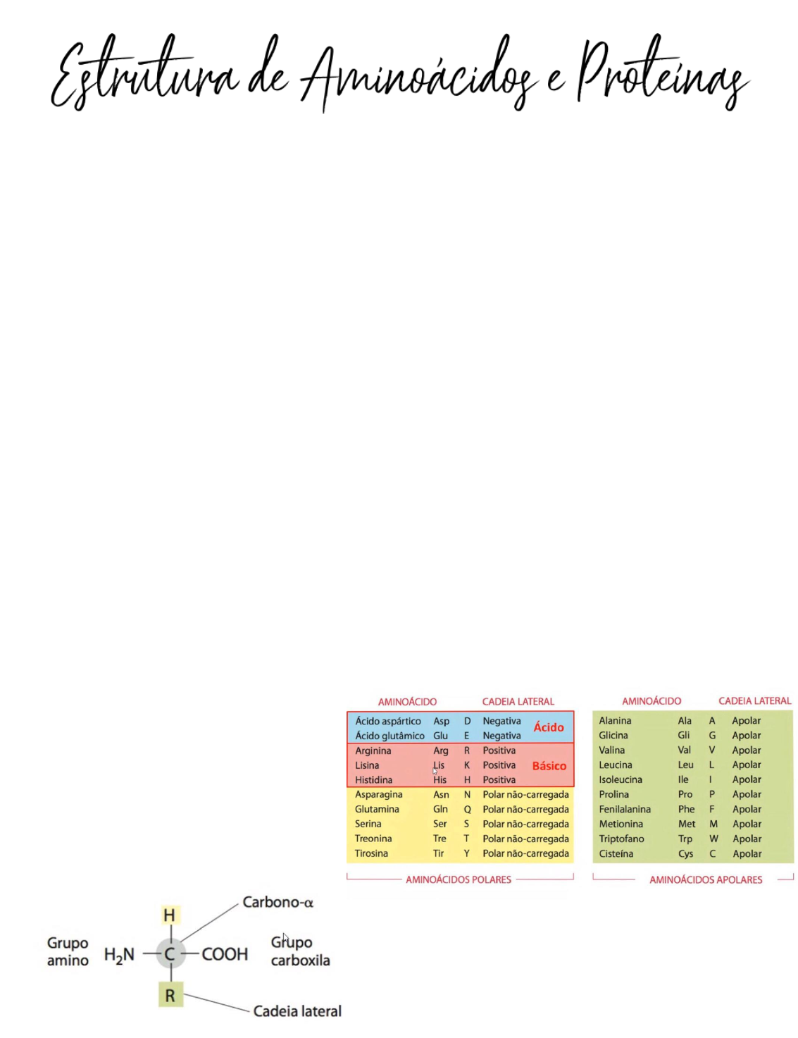 As diferentes proteínas que compõem o nosso organismo são polímeros de 21 aminoácidos, denominados comuns, e muitas vezes também aminoácidos modificados a partir de alguma reação enzimática. Os diferentes aminoácidos têm propriedades ácido-base e cargas que determinam as suas atividades biológicas. A estrutura primária de uma proteína compreende a sua estrutura covalente, que inclui a sequência de resíduos de aminoácidos. A partir desta estrutura outras estruturas geradas não covalentemente formam outros níveis de organização das proteínas, tais como, estrutura secundária, terciária e quaternária. A estrutura secundária refere-se ao dobramento local do esqueleto polipeptídico, enquanto a estrutura terciária refere-se à estrutura tridimensional do polipeptídio e a quaternária refere-se à associação não covalente de subunidades polipeptídicas de uma proteína de múltiplas subunidades (portanto nem toda proteína possui estrutura quaternária). O conjunto de todas as estruturas de uma proteína define as suas propriedades químicas e biológicas e, portanto, são fundamentais para o entendimento de suas funções no organismo. OBJETIVOS: reconhecer a estrutura básica dos aminoácidos e proteínas; conhecer as propriedades químicas e físicas dos aminoácidos Estrutura básica dos aminoácidos: - O aminoácido é uma molécula formada por um carbono alfa, um grupo amino (NH2), um grupo carboxílico (COOH) e uma cadeia lateral (R é comumente uma das 20 cadeias laterais diferentes). Tem a capacidade de ter tanto o grupo amino quanto o grupo carboxila ionizados em um pH próximo ao neutro (7) Obs: Aminoácidos polares tem sua cadeia lateral de preferência sem anel aromático, porém se tiver um anel aromático e uma ligação de hidrogênio é polar também, a menos que a ligação de hidrogênio esteja dentro do anel aromático (acontece com N e S), se tornando apolar Obs2: Aminoácido livre é chamado de aminoácido. Porém geralmente o aa tem perdas no caminho (de hidrogênio, etc), então quando ocorreu perda ao se ligar com alguém é chamado resíduo de aa - Existem aminoácidos que são monômeros de cadeias polipeptídicas, proteínas; temos um N- terminal e um C-terminal, onde ocorre as ligações peptídicas (metionina, asparagina, leucina, tirosina). - Características: sólidos, cristalizáveis, incolores - Funções: monômeros das proteínas e peptídeos; precursores hormonais (tiroxina, serotonina, auxinas); intermediários do metabolismo (sinalizam reações de metabolismo ou fazem parte do metabolismo; podendo ser quebrados para fornecer energia ou sintetizados); precursores de nucleotídeos - Classificação conforme a ocorrência: proteicos (mais frequentes; fazem parte de proteínas- 20 aminoácidos padrão); não proteicos derivados dos aminoácidos proteicos (raros; cisteína-cisteína; lissina-N-metisilada; podem ter função de sinalização ou estrutural); também há os não proteicos que não são derivados dos proteicos Obs: Para representar sequências de aa em proteínas, abreviaturas de três letras e de uma letra para os aminoácidos comuns são usadas - Classificação conforme cadeia lateral: ácido (cadeia lateral negativa; tem mais de um O), básico (cadeia lateral positiva; tem NH3), polar não carregado (cadeia lateral polar sem nenhuma carga), apolar (cadeia lateral apolar). Quando esses aminoácidos forem ser monômeros de proteínas, essas cadeias laterais vão influenciar decisivamente na característica de um Julia Jordão- TXXII determinado domínio proteico ou até de toda a proteína e sua funcionalidade, dependendo dessa organização Os aminoácidos podem ser classificados em essenciais (são necessários serem adquiridos pela alimentação, não são sintetizados no corpo) e não essenciais (são sintetizados no corpo) -Dica: essenciais são todos com letra L, H, V e M. não essenciais com letra G, A, P, S - O leite materno é constituído por grane parte de aminoácidos essenciais, por isso é extremamente importante para o desenvolvimento humano Propriedades dos aminoácidos: isomeria óptica - O carbono alfa é assimétrico, o que permite duas formas especulares isômeras (ou estereoisômeros) - Os aminoácidos podem se apresentar na sua forma levógira ou dextrógira, o carbono assimétrico permite essas duas formas de isômeros - Aminoácidos que fazem parte de proteínas são os L-aminoácidos, enquanto os D-aminoácidos não são proteicos, relacionados a outras funções do organismo - A vantagem de isômeros é que, se o aminoácido não for usado para constituir a proteína, ele poderá ter função sinalizadora Propriedades iônicas dos aminoácidos - Os aminoácidos, quando estão em solução aquosa, estão ionizados e podem atuar como ácidos ou como bases (anfoteria); - Carga elétrica varia conforme a composição do meio - Em meio ácido, pH baixo, há disponibilização de H+ que se ligará a carboxila, gerando uma forma protonada (uma porção com carga neutra e uma porção com carga positiva). Em meio alcalino, pH alto, há retirada de H+ do grupo amino, formando uma forma desprotonada (uma porção neutra e uma porção negativa). No pH neutro há uma carga resultante=0 (carboxila e amina ionizadas, que se anulam) - Conforme você modula o pH de um meio, o aminoácido vai se comportar como ácido ou base, sendo na forma protonada ou desprotonada Propriedades ópticas dos aminoácidos: forma iônica da leucina - pK: constante de equilíbrio de ionização (medida da tendência dos grupos a ceder prótons) quando os aminoácidos estão livres no meio, se comportando como ácido ou base - pK1: COOH: 50%COO dissociado e 50%COO não dissociado - pK2: 50%NH3 não dissociado e 50%NH2 dissociado - pI (ponto isoelétrico): corresponde ao pH em que 100% das moléculas encontram-se com carga neutra (isoelétrica/isoiônica) - Conforme diminui o pH, disponibiliza H+ no meio, e as glicinas receb