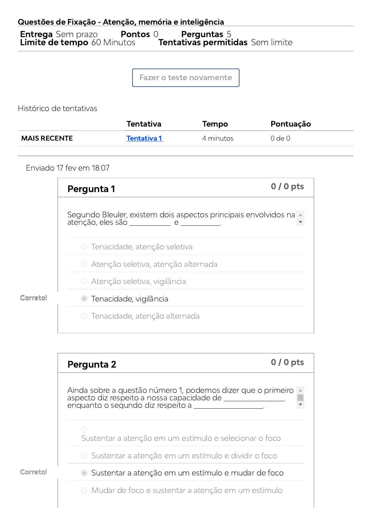 17/02/2022 18:07 Questões de Fixação - Atenção, memória e inteligência: Psiquiatria - Módulo 1 https://sanar.instructure.com/courses/593/quizzes/1278 1/3 Questões de Fixação - Atenção, memória e inteligência Entrega Sem prazo Pontos 0 Perguntas 5 Limite de tempo 60 Minutos Tentativas permitidas Sem limite Histórico de tentativas Tentativa Tempo Pontuação MAIS RECENTE Tentativa 1 4 minutos 0 de 0 Enviado 17 fev em 18:07 Fazer o teste novamente 0 / 0 ptsPergunta 1 Segundo Bleuler, existem dois aspectos principais envolvidos na atenção, eles são e . Tenacidade, atenção seletiva Atenção seletiva, atenção alternada Atenção seletiva, vigilância Tenacidade, vigilância Correto!Correto! Tenacidade, atenção alternada 0 / 0 ptsPergunta 2 Ainda sobre a questão número 1, podemos dizer que o primeiro aspecto diz respeito a nossa capacidade de enquanto o segundo diz respeito a . Sustentar a atenção em um estímulo e selecionar o foco Sustentar a atenção em um estímulo e dividir o foco Sustentar a atenção em um estímulo e mudar de foco Correto!Correto! Mudar de foco e sustentar a atenção em um estímulo https://sanar.instructure.com/courses/593/quizzes/1278/history?version=1 https://sanar.instructure.com/courses/593/quizzes/1278/take?user_id=42221 17/02/2022 18:07 Questões de Fixação - Atenção, memória e inteligência: Psiquiatria - Módulo 1 https://sanar.instructure.com/courses/593/quizzes/1278 2/3 Mudar de foco e dividir a atenção 0 / 0 ptsPergunta 3 Na Doença de Alzheimer é comum que o paciente apresente uma perda de memória relacionadas a eventos, narrativas. Esse tipo de memória é chamado de: Memória episódica Correto!Correto! Memória de trabalho Memória de procedimento Memória narrativa Memória semântica 0 / 0 ptsPergunta 4 Quando solicito que o paciente nomeie um objeto qual o tipo de memória estou tentando avaliar? Memória episódica Memória narrativa Memória de procedimento Memória semântica Correto!Correto! Memória de trabalho 0 / 0 ptsPergunta 5 Você atende no teleambulatório o paciente J, sexo masculino, 16 anos, que repetiu 3 vezes o sexto ano. A família conta que J tem um comportamento pueril e que ás vezes não entende o sentido de metáforas ou provérbios. A família conta que não houve nenhum atraso no DNPM de J e que o paciente é capaz de manipular dinheiro e utilizar meios de transporte sem ajuda 17/02/2022 18:07 Questões de Fixação - Atenção, memória e inteligência: Psiquiatria - Módulo 1 https://sanar.instructure.com/courses/593/quizzes/1278 3/3 de manipular dinheiro e utilizar meios de transporte sem ajuda de terceiros. Se baseando na descrição acima, é possível afirmar que, em relação à inteligência, J: Possui DI moderado ocê respondeuocê respondeu Possui DI moderado com atraso na aquisição de fala Possui DI leve com atraso na aquisição de fala Possui DI leve esposta corretaesposta correta Possui DI grave