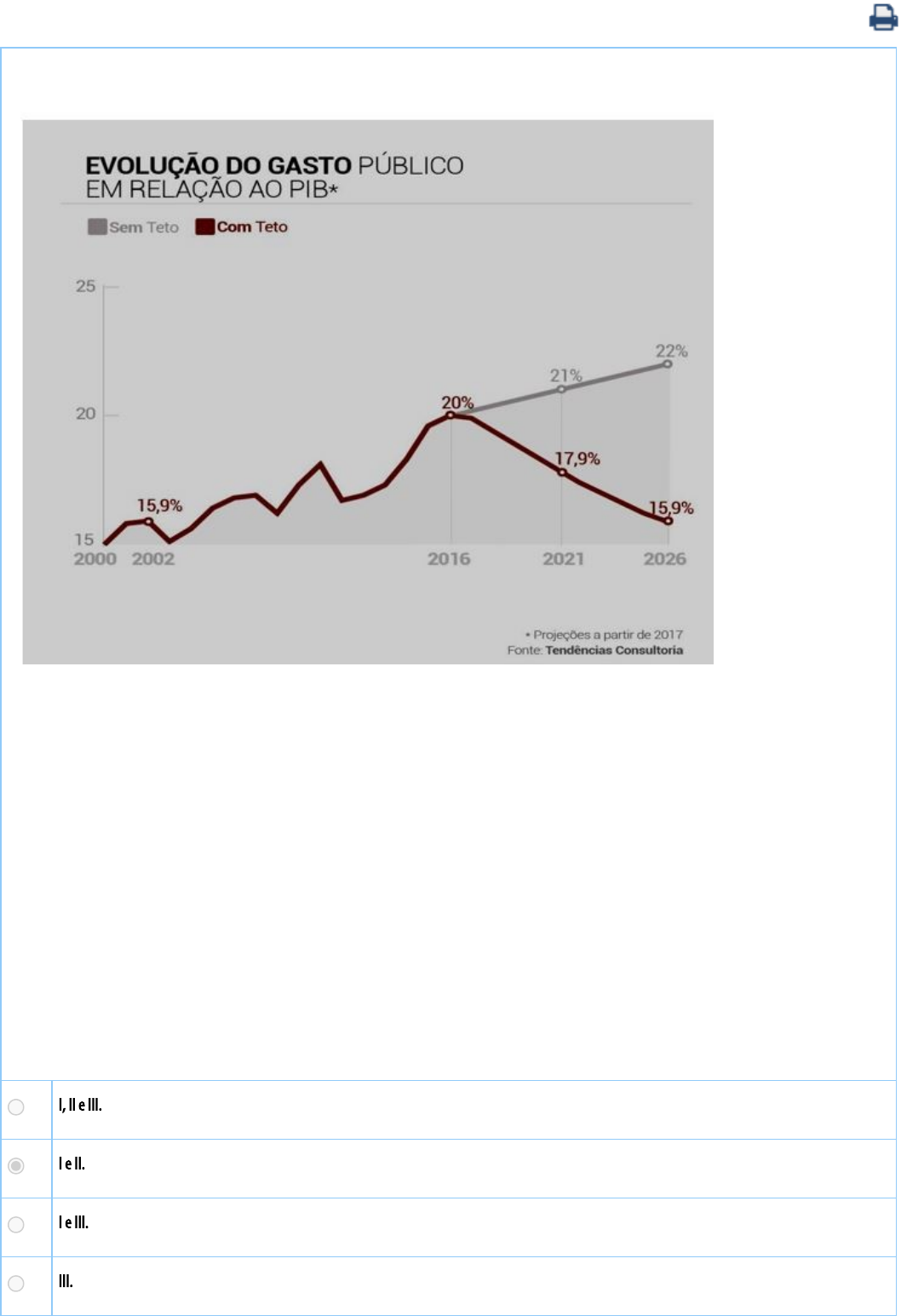 Veja o infográ�co abaixo: Trajetória de crescimento da despesa pública e projeções futuras com e sem a PEC 241 Disponível em: <http://especiais.g1.globo.com/economia/2016/pec241-umtetoparaosgastospblicos/data/PEC-TETO_VA5_src.jpg>. Acesso em: 06 jun de 2017. Analise as a�rmativas a seguir: I Em 2016, o gasto público federal chegou a 20% do PIB e, mantendo-se o teto de gastos, pode-se prever que em 10 anos a despesa pública federal recuará para 15,9%. II A leitura que se pode fazer do comportamento de evolução dos gastos públicos em relação ao PIB até 2016 é a de que existe uma situação de descontrole por parte do governo desde 2002, já que se observa uma elevação quase constante do índice, desde então. III Ao que tudo indica, somente em 2026 alcançaremos um índice de gastos públicos parecido com o índice de 2002, quando o mesmo retornará a marca histórica de 17,9%. É correto o a�rmado em A I, II e III. B I e II. C I e III. D III. E II e III. Você já respondeu e acertou esse exercício. A resposta correta é: B.