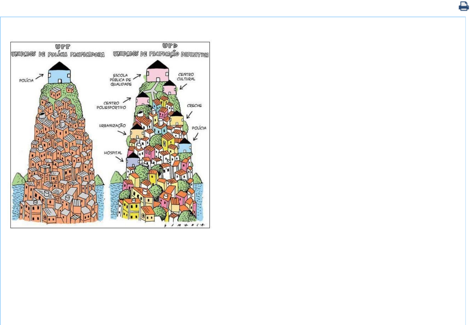 Veja a charge e leia o texto a seguir: Disponível em: <http://urbecarioca.blogspot.com.br/2013/07/semana-24062013-28062013.html>. Acesso em: 4 jun de 2017 Cabe ao Estado a obrigação de criar condições objetivas para o efetivo acesso ao serviço de segurança pública. Entretanto, é importante notar que as relações sociais evoluem diariamente e que as instituições policiais, para poderem acompanhar a sociedade, devem aprimorar-se e evoluir em consonância com ela, humanizando-se e racionalizando recursos �nanceiros, tecnológicos e materiais a �m de melhorar a prestação de serviço de segurança pública à coletividade. Assim, percebe-se, na atualidade, um enorme esforço do governo para a conquista da paci�cação social em favelas. Para atingir esse objetivo adotou-se, na prática, uma nova estratégia de segurança pública: a ocupação permanente das favelas por Unidades de Polícia Paci�cadora, as chamadas UPP´s. Agora, analise as a�rmativas abaixo: I A charge faz uma dura crítica às UPP´s, Unidades de Polícia Paci�cadora, na medida em que aponta o seu pouco ou nenhum envolvimento com o progresso e o bem-estar da sociedade e mostra um modelo um ideal, através da UPD´s (Unidades de Paci�cação De�nitiva). II Nas UPD´s (Unidades de Paci�cação De�nitiva), a polícia é tida como elemento central no quadro de ações sociais, capaz de promover o bem-estar e a qualidade de vida da coletividade. III A charge identi�ca as UPP´s (Unidades de Polícia Paci�cadora) e as UPD´s (Unidades de Paci�cação De�nitiva) como estruturas similares, que atuam visando ao mesmo propósito. Está incorreto o a�rmado em A I, II e III. B I e II. C I e III. D II e III. E III. Você já respondeu e acertou esse exercício. A resposta correta é: D.