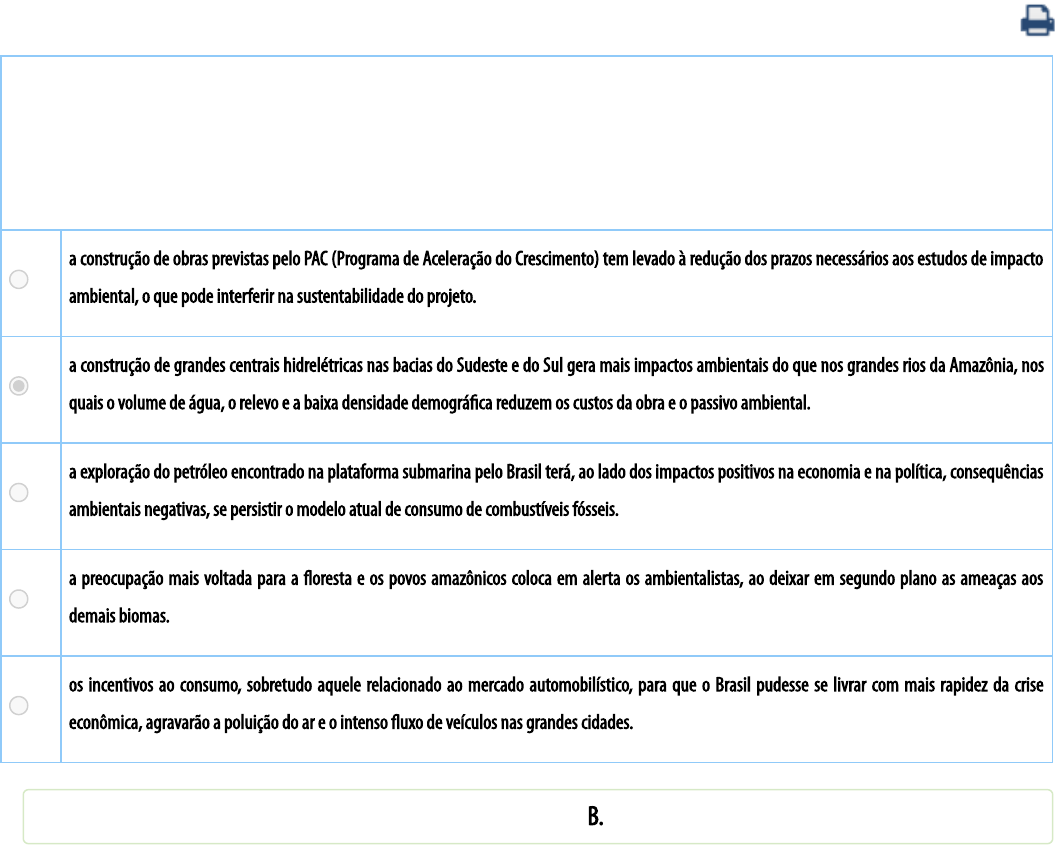 O Brasil tem assistido a um debate que coloca frente a frente, como polos opostos, o desenvolvimento econômico e a conservação ambiental. Algumas iniciativas merecem considerações, porque podem agravar ou desencadear problemas ambientais de diferentes ordens de grandeza. Entre essas iniciativas e suas consequências, é INCORRETO a�rmar que A a construção de obras previstas pelo PAC (Programa de Aceleração do Crescimento) tem levado à redução dos prazos necessários aos estudos de impacto ambiental, o que pode interferir na sustentabilidade do projeto. B a construção de grandes centrais hidrelétricas nas bacias do Sudeste e do Sul gera mais impactos ambientais do que nos grandes rios da Amazônia, nos quais o volume de água, o relevo e a baixa densidade demográ�ca reduzem os custos da obra e o passivo ambiental. C a exploração do petróleo encontrado na plataforma submarina pelo Brasil terá, ao lado dos impactos positivos na economia e na política, consequências ambientais negativas, se persistir o modelo atual de consumo de combustíveis fósseis. D a preocupação mais voltada para a �oresta e os povos amazônicos coloca em alerta os ambientalistas, ao deixar em segundo plano as ameaças aos demais biomas. E os incentivos ao consumo, sobretudo aquele relacionado ao mercado automobilístico, para que o Brasil pudesse se livrar com mais rapidez da crise econômica, agravarão a poluição do ar e o intenso �uxo de veículos nas grandes cidades. Você já respondeu e acertou esse exercício. A resposta correta é: B.