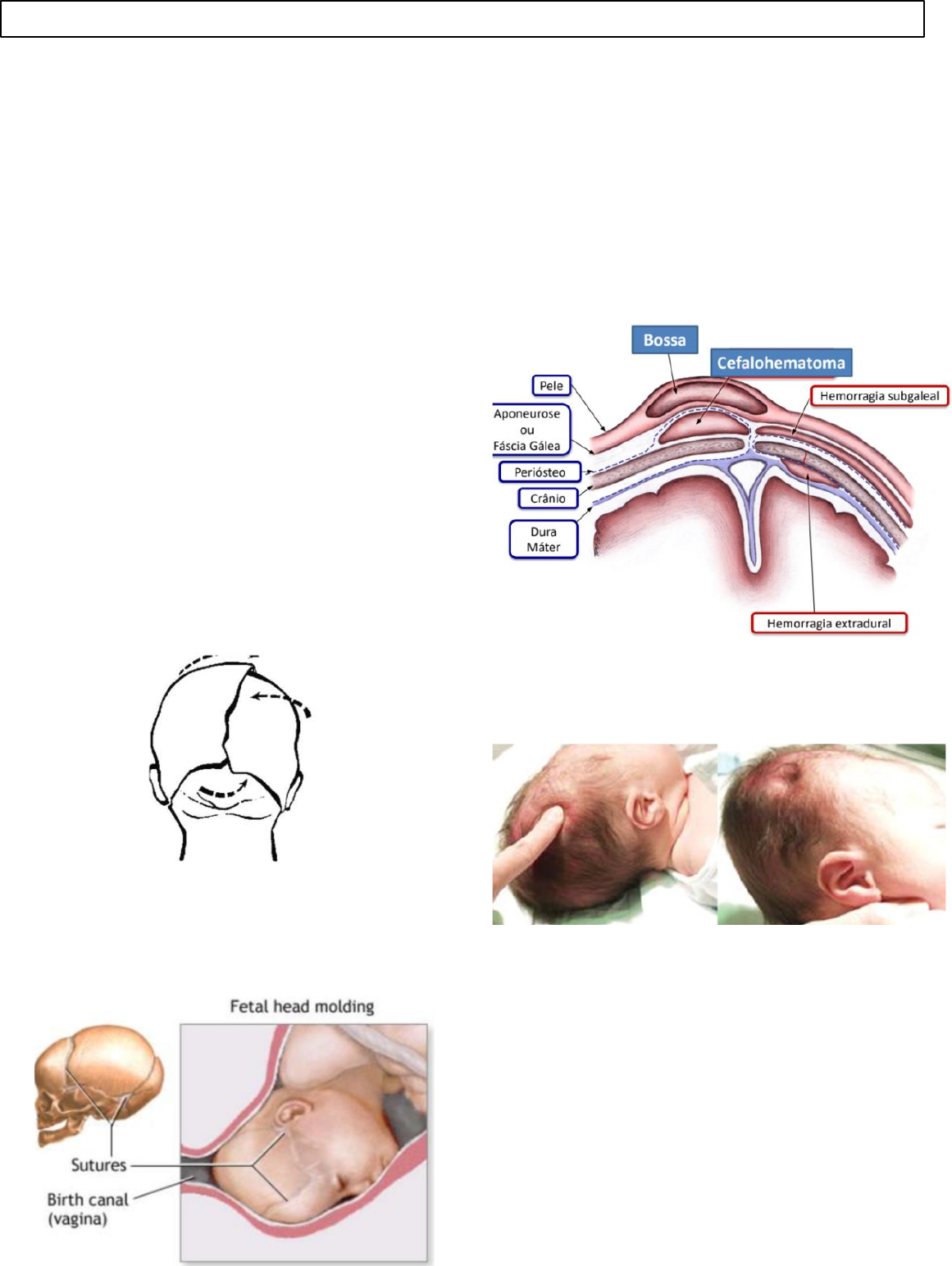 Fenômenos Plásticos do Parto Introdução • Mecanismos de adaptação da cabeça fetal à forma e dimensões da bacia; • São dois fenômenos plásticos fisiológi- cos: - Cavalgamento (acavalamento); - Bossa serosanguínea: é diagnóstico di- ferencial de duas patologias, meningoence- falocele e cefaloematoma. Cavalgamento (acavalamento) • É a diminuição dos diâmetros ântero- posterior e transverso da cabeça fetal; • Reduz cerca de 1,0 a 1,5cm da cabeça do RN; • Os ossos frontal e occipital estão posicio- nados sob os parietais, diminuindo princi- palmente o diâmetro anteroposterior; • A sobreposição dos parietais é mais difícil de ocorrer; • O lambda desaparece durante esse pro- cesso, sendo percebido o Sinal do Com- passo de Varnier (união dos ossos, for- mando a linha óssea). Bossa serossanguínea • É uma infiltração serossanguínea do te- cido celular subcutâneo entre o couro ca- beludo e a aponeurose que recobre os os- sos; • Clínica: - Tumefação violácea; - Amolecida; - Pastosa; - Não flutuante; - Extensão variável: pode recobrir as su- turas, sem uma delimitação; - Recobre as suturas; - Presente ao nascimento; • Causas: - Área de menor pressão atmosférica no trajeto do parto: por não estar em contato com a parte óssea da pelve, apresentando Marianne Barone (15A) Obstetrícia – Prof. Fábio Roberto Oliveira da Silva dilatação dos vasos, transudação, exsudato e diapedese; - Parto prolongado; - Vácuo extração (pressão negativa para tracionar a cabeça do feto); • Localização: geralmente faz o diagnós- tico da apresentação; • Tratamento: regressão espontânea entre 48-72h; • Complicação: icterícia (rara). A quanti- dade de elemento figurado que é presente na bossa serossanguínea não é suficiente para causar icterícia (teria que haver o rompi- mento de uma grande quantidade de hemá- cias na região); • Diferencial: meningoencefalocele e cefa- loematoma. Diagnóstico diferencial Bossa Cefaloema- toma Aparecimento Ao nascimento 24-48h após o nascimento Localização Entre pele e aponeurose Entre periósteo e tábua óssea Extensão Cruza suturas (dois hemisfé- rios) Não cruza sutu- ras (osso iso- lado) Absorção 48-72h 1-2 meses Tratamento Nenhum Suporte → • É uma coleção sanguínea entre o periós- teo e o osso (1:250); • Causas: parto traumático; - Ruptura de capilares periostais devido à pressão traumática; - Parto instrumental, pélvico; • Localização: geralmente em um dos pari- etais; • Clínica: - Inchaço/edema da cabeça fetal; - Localizado: não ultrapassa as suturas, por serem bem aderidas; - Bordas precisas; - Surge 24-48h após o nascimento; • Tratamento: - Observação, suporte, transfusão, fotote- rapia; - Regressão: semanas, meses; • Complicação: icterícia (frequente). → • Resulta de um defeito do tubo neural, com herniação do encéfalo e meninges por aber- tura anormal no crânio; • Tosse, choro: aumento da pressão inter- craniana, tensionando a tumefação, com di- agnóstico durante o pré-natal por ser visível na USG.