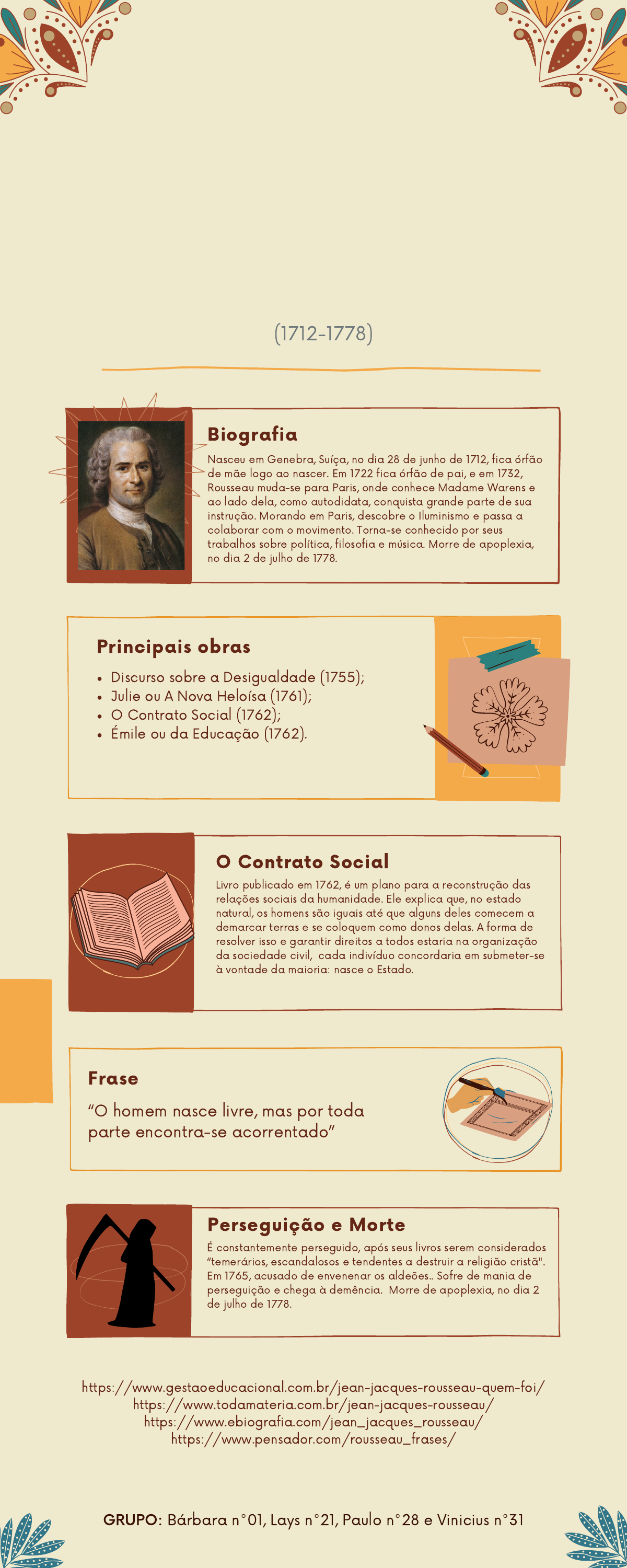 Jean Jacques Rousseau (1712-1778) Biografia Nasceu em Genebra, Suíça, no dia 28 de junho de 1712, fica órfão de mãe logo ao nascer. Em 1722 fica órfão de pai, e em 1732, Rousseau muda-se para Paris, onde conhece Madame Warens e ao lado dela, como autodidata, conquista grande parte de sua instrução. Morando em Paris, descobre o Iluminismo e passa a colaborar com o movimento. Torna-se conhecido por seus trabalhos sobre política, filosofia e música. Morre de apoplexia, no dia 2 de julho de 1778. https://www.gestaoeducacional.com.br/jean-jacques-rousseau-quem-foi/ https://www.todamateria.com.br/jean-jacques-rousseau/ https://www.ebiografia.com/jean_jacques_rousseau/ https://www.pensador.com/rousseau_frases/ Principais obras Discurso sobre a Desigualdade (1755); Julie ou A Nova Heloísa (1761); O Contrato Social (1762); Émile ou da Educação (1762). O Contrato Social Livro publicado em 1762, é um plano para a reconstrução das relações sociais da humanidade. Ele explica que, no estado natural, os homens são iguais até que alguns deles comecem a demarcar terras e se coloquem como donos delas. A forma de resolver isso e garantir direitos a todos estaria na organização da sociedade civil, cada indivíduo concordaria em submeter-se à vontade da maioria: nasce o Estado. Frase “O homem nasce livre, mas por toda parte encontra-se acorrentado” Perseguição e Morte É constantemente perseguido, após seus livros serem considerados “temerários, escandalosos e tendentes a destruir a religião cristã". Em 1765, acusado de envenenar os aldeões.. Sofre de mania de perseguição e chega à demência. Morre de apoplexia, no dia 2 de julho de 1778. GRUPO: Bárbara n°01, Lays n°21, Paulo n°28 e Vinicius n°31 https://www.todamateria.com.br/iluminismo/