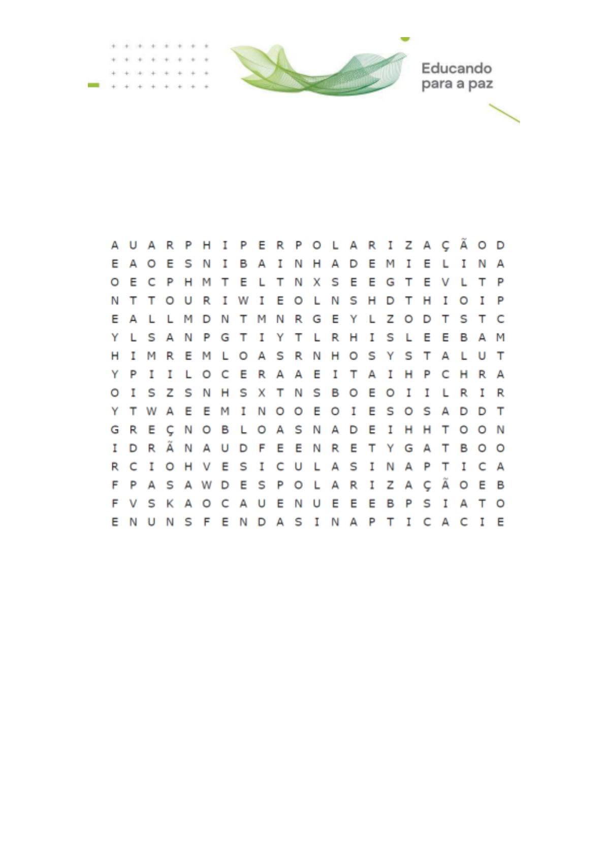 NEUROANATOMIA E NEUROFISIOLOGIA CONCEITOS GERAIS DE NEUROFISIOLOGIA As palavras deste caça palavras estão escondidas na horizontal, vertical e diagonal, sem palavras ao contrário. 1. ÍON RESPONSÁVEL POR ATIVAR O COMPLEXO SNARE NA SINAPSE 2. FASE DO POTENCIAL DE AÇÃO DESENCADEADA PELO INFLUXO DO ÍON SÓDIO 3. FASE DO POTENCIAL DE AÇÃO DESENCADEADA PELO EFLUXO DO ÍON POTÁSSIO 4. LOCAL NO TERMINAL NEURONAL ONDE FICAM ARMAZENADOS OS NEUROTRANSMISSORES DE BAIXO PESO MOLECULAR 5. ESTRUTURA QUE PERMITE AUMENTO DA VELOCIDADE DE CONDUÇÃO DO POTENCIAL DE AÇÃO 6. NOME DO ESPAÇO EXISTENTE ENTRE O NEURÔNIO PRÉ E PÓS SINÁTPICO 7. LOCAL DO NEURÔNIO ONDE OCORRE A PROPAGAÇÃO DO POTENCIAL DE AÇÃO 8. ENZIMAS ENVOLVIDAS COM A EXOCITOSE DO NEUROTRANSMISSOR 9. ESTADO QUE O NEURÔNIO PODE ATINGIR AO FINAL DA REPOLARIZAÇÃO ANTES DE RETORNAR AO REPOUSO 10. NOME DADO AO ESTÍMULO MINIMO CAPAZ DE DESENCADEAR UMA RESPOSTA
