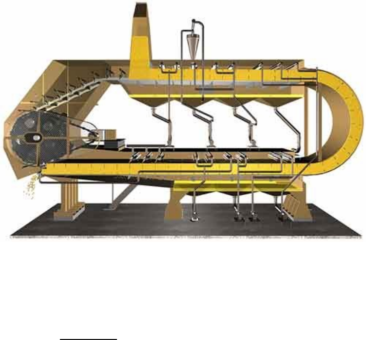 Introdução Extrator Crown Um extrator do tipo percolação opera com drenagem líquida descendente através de um leito de material e através de uma tela que suporta este material – semelhante a um percolador de café. Existem vários projetos básicos de extrator de percolação disponíveis. Este artigo trata da extração por solvente para soja com ênfase no tipo de percolação da Crown, extrator de "leito raso". O projeto do leito raso tem muitas características únicas, sendo útil entender esses recursos para operar o processo de forma mais eficiente. Figura 1: Ilustração da distribuição de miscela (mistura óleo + solvente) sobre o leito de extração. A Crown tem construído 5 projetos de extrator: • Extrator Modelo 1, não mais em produção, foi um projeto construído nos anos 1950 em capacidades de até 50 toneladas por dia. • Extrator Modelo 2 é o primeiro extrator do tipo “loop” com características de projeto modernas. É fornecido para extração de soja com capacidade de 1 até 1.500 toneladas por dia. • Extrator Modelo é o equipamento mais frequentemente fornecido, sendo ofertado em toda a gama de capacidades, de escala laboratorial até 12.000 toneladas por dia. • Extrator Modelo 4 é um extrator de imersão total, frequentemente usado para produtos especiais que não permitem uma boa percolação do líquido. É usualmente fornecido em capacidades de 1 a 50 toneladas por dia. • Extrator Modelo 5 é um extrator de percurso reto, também utilizado para produtos especiais para capacidade pequenas e médias. Os Modelo 2 e Modelo 3 são extratores do tipo percolação de grande capacidade, leito raso e tela estacionária. Eles são o foco deste artigo. Eles são semelhantes em muitos aspectos. A principal diferença é a direção do movimento da corrente. A corrente do Modelo 2 viaja para cima na seção da "cauda" (seção curva onde a corrente muda de direção enquanto permanece cheia de lâminas ou collets). A corrente do Modelo 3 viaja para baixo na seção da cauda. Figura 2: Extrator Crown modelo 3 para extração por solvente em leito raso. Esses extratores operam a maioria das oleaginosas com pouca ou nenhuma mudança para o extrator. A diferença mais frequente é componentes adicionais em aço inoxidável para oleaginosas ou solventes os quais sejam mais corrosivos. Muitos dos fatores importantes para a extração eficiente de soja são muito semelhantes para outras oleaginosas, embora algumas configurações de extração necessitem ser alteradas. Figura 3: Extrator Crown para extração por solvente em leito profundo, modelo deck-simples (direita) e deck-duplo (esquerda). No entanto, as etapas de preparação podem variar consideravelmente para diferentes oleaginosas. Uma das principais diferenças, muitas vezes usada para sementes de alto teor de óleo, como o girassol, é a adição de cozinhadores e prensas ou "pré-presagem" antes do extrator. Esta prensa tipicamente quebra a estrutura celular para melhor liberar o óleo e remove aproximadamente metade desse óleo mecanicamente. O teor reduzido de óleo também permite melhor laminação final de alguns produtos facilitando a extração por solvente para um teor final de óleo menor. Teoria da Extração a) A Teoria Básica: A teoria da extração pode ser colocada de forma muito simples: estamos tentando remover o óleo de pequenas partículas ou lâminas de material com um solvente, geralmente hexano. O solvente tem que penetrar para dentro das partículas, diluir o óleo e, a mistura de óleo e solvente, então, deve sair das partículas e ser lavada com ainda mais solvente. Fazemos a mesma coisa quando limpamos um pincel com solvente. Podemos mergulhar o pincel durante a noite para ganhar penetração ou podemos forçar o caminho do solvente pelo pincel para acelerar o processo. De qualquer forma, para remover todos os vestígios da tinta antiga, precisamos lavar o pincel várias vezes com solvente, enxaguar com solvente e, finalmente, drenar e recuperar qualquer solvente em excesso. Figura 4: Extração por percolação com fluxo de miscela passando através do leito de material. Para obter a remoção efetiva do óleo a partir de sementes oleaginosas usando extração por solvente, temos aos menos CINCO requisitos básicos: • Preparação: Condicionamento em tempo e temperatura adequados para suavizar e romper as células portadoras de óleo, reduzir a geração de finos na laminação e manter o extrator quente. Os materiais corretamente preparados possuem alta porosidade, uma grande área de superfície e laminam finas (ou quebra de células em prensas bem projetadas) permitindo uma rápida penetração pelo solvente e ruptura dos corpúsculos lipídicos para que o solvente possa atingir o óleo. O material também deve permitir uma boa percolação – um fluxo rápido de solvente através do leito e da tela para que o óleo possa ser transportado para fora do leito. • Solvente: Uma taxa de solvente suficientemente alta (a proporção de solvente para sólidos que entram no extrator) e um número suficiente de estágios efetivos de lavagem. Estes estágios devem ser "contracorrente" com a declinação da concentração de óleo até a lavagem final com solvente puro. Uma unidade com mais e melhores estágios pode operar com menos solvente de entrada (uma menor proporção de solvente) e menores custos na destilação. Estágios eficientes mantêm a miscela dos estágios finais no menor teor de óleo possível, de modo que a miscela “presa” nas partículas indo para o DT não contenham muito óleo. • Contato: Isso requer material corretamente preparado e um extrator projetado para ser "flexível" – um projeto que leva à lavagem e drenagem mais eficaz com uma grande variedade de materiais, mesmo com sementes de baixa qualidade ou danificadas. Um leito baixo de laminas ajuda a reduzir o tempo em cada estágio e na drenagem final. Também reduz o peso do leito 