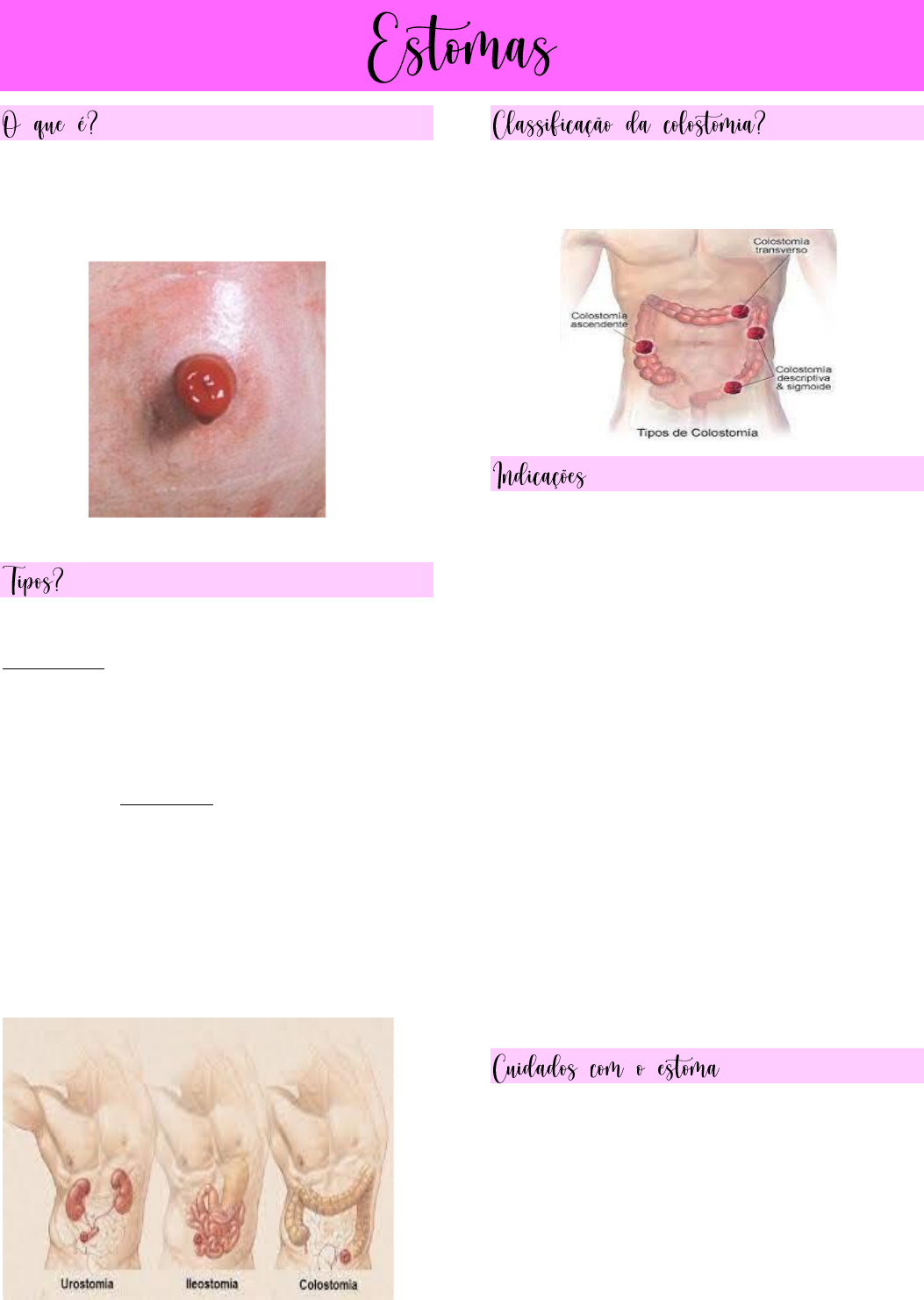 É uma abertura cirúrgica realizada para construção de um novo trajeto localizado no abdômen para saída de fezes e urina. Quando é realizada no intestino grosso, chamamos de COLOSTOMIA. Dependendo do lugar onde é feita, a frequência de evacuações e a consistência das fezes ficam diferentes. Quando a cirurgia é realizada no intestino delgado (fino), chamamos de ILEOSTOMIA. Neste tipo de estomia as fezes são inicialmente líquidas e passam a ser semi- pastosas depois de um período de adaptação. Pode funcionar (sair fezes) várias vezes ao dia. Chamamos de UROSTOMIA quando é colocado um estoma para saída de urina. A urina sai continuamente, ou seja, sem interrupção. A classificação da colostomia e de acordo com a localização da mesma no intestino grosso As estomias podem ser temporárias ou definitivas. As temporárias como o próprio nome já sugerem, tem possibilidades de reversão. Podemos indicar a reconstrução do trânsito intestinal ou fechamento de estomia dependendo da cirurgia anteriormente realizada. Os estomas permanentes, são as estomias confeccionadas de maneira definitiva, sem possibilidades de reversão. Existem várias indicações de estomia definitiva, mas a principal delas é o tumor de reto próximo ao ânus (amputação do reto). Em geral, as estomias intestinais são indicadas no intuito de se desviar o trânsito fecal do local patologicamente comprometido. As principais indicações operatórias são: má formação congênita do intestino, tumores intestinais, doença inflamatória intestinal, traumas abdominais, entre outras. • Observar sempre a cor (deve ser vermelho vivo), o brilho, a umidade, o tamanho e a forma. • A limpeza do estoma deve ser feita delicadamente. Não deve ser esfregado, pois pode sangrar facilmente. • Qualquer alteração ou ausência de saída de fezes por três dias ou mais, deverá ser comunicada imediatamente ao estomaterapeuta.