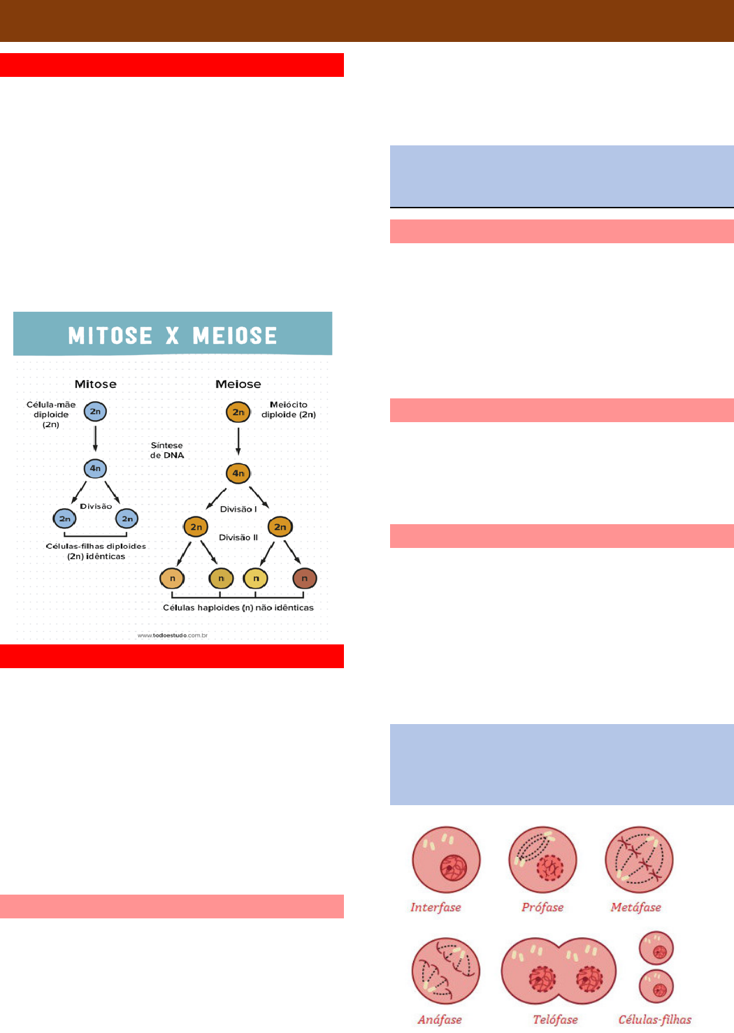 AMANDA FARIA Divisão Celular VISÃO GERAL A divisão celular é o processo de multiplicação de uma célula, esse processo acontece depois da interfase. A divisão pode ser por meio da mitose ou da meiose. Quase todas as células do corpo dividem por mitose, exceto os gametas. Os gametas se dividem por meiose, pois na meiose há a formação de células haploides (n), enquanto na mitose há a formação de células diplóides (2n). Os gametas precisam ser haploides, pois duas células haploides (espermatozoide e óvulo), ao se fundirem na fecundação, formam uma diploide. MITOSE A mitose é o processo pelo qual há produção de células filhas idênticas à célula-mãe. A mitose é um processo que não gera variação genética, mas atua no crescimento, na regeneração etc. Ela possui 4 fases: 1. Prófase; 2. Metáfase; 3. Anáfase; 4. Telófase. PRÓFASE A prófase é a fase em que a carioteca e o núcleo desaparecem. Nessa fase, há a condensação dos cromossomos, ou seja, eles preparam-se para a divisão. Há também uma parada na produção de RNAr e o núcleo começa a se apagar. Outro marco da prófase é a migração dos centríolos para lados opostos da célula, emitindo as fibras do fuso. Essa é a única fase em que é possível visualizar um núcleo e dois centríolos. Alguns medicamentos que são quimioterápicos agem parando a produção do fuso na prófase na mitose, ou seja, impedem a reprodução das células tumorais. METÁFASE Na metáfase, é visto um centríolo de cada lado e os cromossomos permanecem no meio da célula, isso forma a placa equatorial/metafásica. Os cromossomos não são pareados, além disso esse é o momento de maior condensação desses cromossomos, sendo a melhor fase para visualizá-los. ANÁFASE A anáfase é a fase em que as fibras do centríolo recuam e cada cromátide vai para um lado, separando os cromossomos. Há uma divisão igual de cromossomos para cada lado. TELÓFASE A telófase é a fase com formação dos cromossomos simples, que serão duplicados na fase S. O material genético descondensa, formando a cromatina e a produção de RNAr retorna, voltando a ter nucléolo. As partes da carioteca se organizam formando duas cariotecas, um em cada lado da célula circundando os cromossomos. Além disso, há o início da citocinese. A citocinese é a divisão do citoplasma, a qual pode ser centrípeta (de fora para dentro) ou centrífuga (de dentro para fora). A célula animal faz a centrípeta e a célula vegetal faz a centrífuga. AMANDA FARIA MEIOSE A meiose é o processo de divisão em que se gera células-filhas distintas entre si. Essa divisão é feita duas vezes consecutivas, o que aumenta a diversidade genética, sendo que na primeira divisão, os pares são separados e na segunda divisão, as cromátides são separadas, virando cromátides simples. PRÓFASE I Na prófase I, os cromossomos duplicados condensam e o núcleo se apaga. Ocorre a pareação dos pares homólogos e também há a fragmentação da carioteca, migração dos centríolos e emissão das fibras. A prófase I tem 5 subfases: 1. Leptóteno: condensação dos cromossomos; 2. Zigóteno: pareamento; 3. Paquíteno: crossing over/permutação gênica; 4. Diplóteno: formação dos quiasmas; 5. Diacinese: quiasmas vão paras as pontas. O crossing over é fundamental para a variabilidade genética, isso é a troca de partes entre cromátide, gerando diferentes sequências de genes nos cromossomos. METÁFASE I A metáfase I é a fase em que os centríolos estão nos lados opostos. Nessa fase os pares de cromossomos homólogos duplicados são pareados. ANÁFASE I Na anáfase I, há a separação das cromátides, encurtamento das fibras. As cromátides podem se combinar de diferentes formas, gerando variabilidade genética. TELÓFASE I A telófase I é marcada pelo descondensamento dos cromossomos duplicados. O nucléolo reaparece temporariamente e há a formação da carioteca. Inicia-se a citocinese. MEIOSE II A meiose II é dividida em prófase II, metáfase II, anáfase II e telófase II. Esse processo é igual ao da mitose, porém forma-se ao final 4 células, uma vez que na meiose I formaram-se 2 e essas 2 se dividem novamente na meiose II. A intercinese é o tempo entre a meiose I e meiose II.
