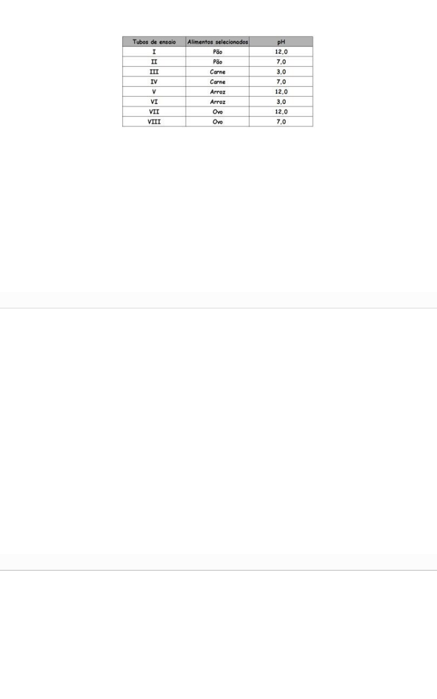Uma determinada enzima, retirada de um órgão do aparelho digestivo de um mamífero, foi distribuída igualmente em 8 tubos de ensaio. O tipo de alimento e o pH de cada tubo estão informados na tabela a seguir. Observe os alimentos e o pH encontrado em cada tubo de ensaio Os tubos de ensaio foram mantidos a 37°C e após 10 horas observou-se digestão do alimento apenas no tubo III. Com base nesses dados, é possível concluir que a enzima utilizada e o órgão de onde foi retirada são, respectivamente: a) amilase pancreática e intestino. b) maltase e estômago. c) tripsina e intestino. d) ptialina e boca. e) pepsina e estômago. Questão 2 (Fuvest-SP) Qual cirurgia comprometeria mais a função do sistema digestório e por quê: a remoção dos vinte e cinco centímetros iniciais do intestino delgado (duodeno) ou a remoção de igual porção do início do intestino grosso? a) A remoção do duodeno seria mais drástica, pois nele ocorre a maior parte da digestão intestinal. b) A remoção do duodeno seria mais drástica, pois nele ocorre a absorção de toda a água de que o organismo necessita para sobreviver. c) A remoção do intestino grosso seria mais drástica, pois nele ocorre a maior parte da absorção dos produtos do processo digestório. d) A remoção do intestino grosso seria mais drástica, pois nele ocorre a absorção de toda a água de que o organismo necessita para sobreviver. e) As duas remoções seriam igualmente drásticas, pois tanto no duodeno quanto no intestino grosso ocorrem digestão e absorção de nutrientes e de água. Questão 3 O intestino grosso é um órgão de aproximadamente 50 cm de comprimento e 7 cm de diâmetro, podendo ser dividido em: ceco, colo e reto. Esse órgão está relacionado com: a) a digestão mecânica do alimento. b) a digestão de gorduras. c) a digestão de proteínas. d) a absorção de água. e) a quebra de amido. Questão 4 O pâncreas e o fígado são glândulas anexas do sistema digestório humano. Entre as funções do fígado, destaca-se a capacidade de produção de uma substância que atua emulsificando gorduras. Essa substância recebe o nome de: a) tripsina. b) pepsina. c) bile. d) amilase. e) lipase pancreática. Questão 5 O sistema digestório é formado por diversos órgãos que atuam juntos para conseguir retirar dos alimentos as substâncias necessárias para o nosso corpo. O amido só pode ser aproveitado após ser quebrado em partículas menores. Marque a alternativa que indica corretamente onde se inicia a digestão do amido. a) boca. b) faringe. c) estômago. d) intestino delgado. e) intestino grosso. Questão 6 O processo de digestão inicia-se na boca, onde o alimento sofre a ação dos dentes e também de substâncias químicas. Os dentes são responsáveis por triturar, amassar e cortar os alimentos, um processo conhecido como: a) digestão química. b) digestão enzimática. c) digestão proteica. d) digestão estrutural. e) digestão mecânica. Questão 7 Após sofrer a ação dos dentes e se misturar à saliva, o alimento passa a ser chamado de: a) quimo. b) quilo. c) bolo alimentar. d) amido. e) fezes. Questão 8 Marque a alternativa que indica corretamente o nome do órgão muscular que apresenta cerca de 25 cm de comprimento e garante que o alimento siga da faringe em direção ao estômago. a) Traqueia. b) Laringe. c) Intestino grosso. d) Intestino delgado. e) Esôfago. Questão 9 Das secreções citadas abaixo, marque aquela que não é lançada no intestino delgado. a) Suco pancreático. b) Bile. c) Suco entérico. d) Suco intestinal. e) Suco gástrico. Questão 10 As fezes são formadas em que porção do sistema digestório? a) Intestino delgado. b) Estômago. c) Esôfago. d) Intestino grosso. e) Pâncreas. Questão 11 (PUC-SP) Uma pessoa apresenta uma rara doença que provoca alterações significativas em suas funções hepáticas. Assinale o mecanismo abaixo que poderia ser diretamente afetado no organismo dessa pessoa. a) Digestão de proteínas no estômago. b) Digestão de carboidratos no duodeno. c) Produção de suco pancreático. d) Produção de bile. e) Produção de suco gástrico. Questão 12 (Fatec) Um dado preocupante, quando se analisa o hábito alimentar da população brasileira, principalmente nos grandes centros urbanos, é que em geral se verifica uma baixa ingestão de alimentos ricos em fibras. As fibras estão presentes em maior quantidade em vários alimentos de origem vegetal, tais como verduras, legumes, frutas e cereais integrais. A ingestão dos alimentos ricos em fibras é importante porque: a) estimula a produção de enzimas gástricas. b) facilita a ação da bile na digestão das proteínas. c) fornece a energia necessária às atividades vitais. d) acelera a passagem do bolo fecal pelo intestino. e) permite a absorção da celulose pelo corpo.