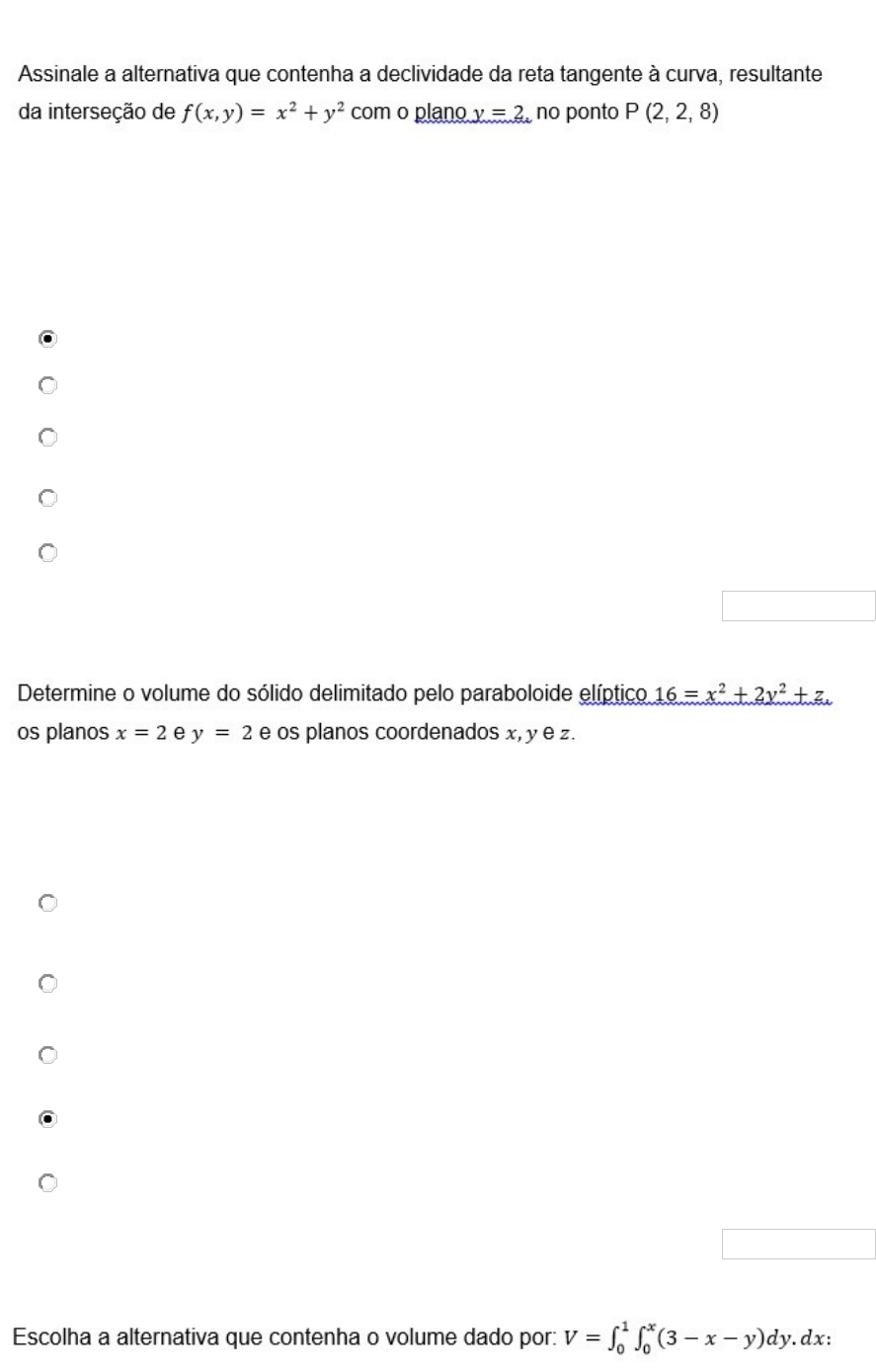 PERGUNTA 1 1. a. 4. b. 5. c. 2. d. 12. e. 8. 0,175 pontos PERGUNTA 2 1. a. 25 unidades de volume. b. 54 unidades de volume. c. 36 unidades de volume. d. 48 unidades de volume. e. 66 unidades de volume. 0,175 pontos PERGUNTA 3 1. a. 3. b. 4. c. 2. d. 5. e. 1.