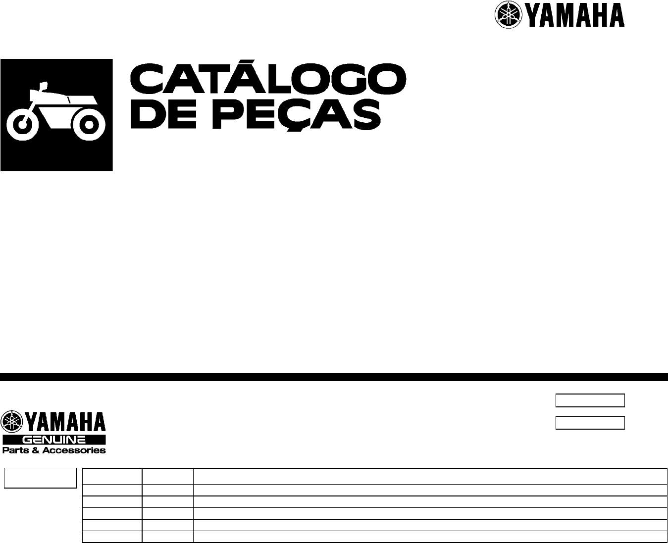 1H4D8-280P1 ( ) XTZ250X (4D82) BRASIL 04/3/2011 DATA Mar. 31 , 2009 Mar. 26 , 2010 Fev. 28 , 2011 Fev. 28 , 2011 Mar. 11 , 2011 NEWS NO. PE7-MC-110019 COMENTÁRIO MOD: XTZ250X (4D82/ 4D85) - CILINDRO MESTRE DIANTEIRO - INFORMAR CORREÇÃO DA ILUSTRAÇÃO (FIG. 32) PE6-MC-090003 MOD: XTZ250X (4D82) - TRANSMISSÃO - CORREÇÃO DA DESCRIÇÃO DA PEÇA (FIG. 15) PE6-MC-090010 MOD: XTZ250/XTZ250X (4B41/ 4B42/ 4B43/ 4D81/ 4D82) - ADMISSÃO - INFORMAR DESMEMBRAMENTO DE PEÇAS (FIG. 09) PE7-MC-110006 MOD: XTZ250 (4B41/ 4B42/ 4B43/ 4B46/ 4D81/ 4D82) - AMORTECEDOR TRASEIRO - INFORMAR CORREÇÃO DA ILUSTRAÇÃO (FIG. 22) PE7-MC-110017 MOD: XTZ250X (4D81/ 4D82) - GARFO DIANTEIRO - INFORMAR CORREÇÃO DO CÓDIGO (FIG. 24) XTZ250X CATÁLOGO DE PEÇAS ©2008, Yamaha Motor do Brasil Ltda. 1a edição, Novembro 2008 Todos os direitos reservados. É proibida expressamente toda e qualquer reimpressão ou utilização sem a autorização por escrita da Yamaha Motor do Brasil Ltda. Impresso no Brasil. PREFÁCIO Este Catálogo de Peças se refere as Peças dos modelos relacionados na capa. Quando for solicitar peças de reposição para estes Modelos, recorra a este Catálogo de Peças e especi- fique corretamente os códigos e Nomes das Peças. 1. As Modificações ou adições que tenham sido efetuadas após a publicação deste Catá- logo de Peças, serão comunicadas a Rede de Concessionárias através das informa- ções de Modificação de Peças (Parts News). 2. Abreviaturas Seguem abaixo as abreviaturas utilizadas neste Catálogo de Peças: “UR” Uso Restrito para o Código da Peça “UN” Uso Necessário “AP” Peça Alternativa “LM” Fabricação Local (A peça pode ser pedida localmente) “F#” No. de Série do Chassi (Aplicação do Número de Série) “O/S” Tamanho Maior 3. Peças componentes de conjuntos • As peças que são fornecidas dentro de conjuntos estão listadas com um ponto de identificação (.)como segue abaixo. • O número que aparece a direita da descrição da Peça indica o número de Peças usado em cada Conjunto Individual. 4. Os gráficos que são Aplicados em Peças Coloridas estão representados na coluna “OB- SERVAÇÕES”, como segue abaixo. 5. Observe que as ilustrações são referentes apenas a indicação dos códigos das peças, e não para montagem. Para montagem, por favor utilize o Manual de Montagem apro- priado. 6. O asterisco (*) antes do Número de referência da peça indica a modificação ocorrida após a primeira edição. No. PEÇA DESCRIÇÃO QTDE OBSERVAÇÕES 2F5–83310–60 PISCA DIANTEIRO CONJ. 2 115–83311–60 .LÂMPADA (6V–18W) 1 No. PEÇA DESCRIÇÃO QTDE OBSERVAÇÕES 2N4–24110–00–X5 TANQUE DE COMBUSTÍVEL COMPL. 2 MXR 3J1–24240–10 .GRÁFICO, TANQUE DE COMB. 1 PARA MXR PREFÁCIO 7. Aplicação do Número de Série No. de Série do Chassi No. de Série do Motor 8. Aplicação do Código de Cor (A marca (*) mostra a cor do Modelo.) 9. Aplicação do No. de Série Inicial No. de Série do Chassi No. de Série do Motor Abreviação Nome da Cor Código da Cor SL SILVER 0035 VYRS4(*) VIVID YELLOWISH RED SOLID 4 1074 YB(*) YAMAHA BLACK 0033 No. Série Nome do Modelo Código do Modelo 9C6KG026090005701 XTZ250X 4D82 No. Série Nome do Modelo Código do Modelo G379E-000101 XTZ250X 4D82 ÍNDICE GERAL MOTOR CABECOTE DO CILINDRO .................................................. 1 CILINDRO ............................................................................. 3 VIRABREQUIM E PISTAO .................................................... 4 VALVULA .............................................................................. 6 CORRENTE DO EIXO DE COMANDO ................................. 7 BOMBA DE OLEO ................................................................ 8 COLETOR DE OLEO ............................................................ 9 ADMISSAO ........................................................................... 10 ADMISSAO 2 ........................................................................ 11 ESCAPAMENTO ................................................................... 12 CARCACA DO MOTOR ........................................................ 13 TAMPA DA CARCACA 1 ...................................................... 14 EMBREAGEM DA PARTIDA ................................................ 16 EMBREAGEM ....................................................................... 17 TRANSMISSAO .................................................................... 19 EIXO TRAMBULADOR ......................................................... 21 EIXO DE MUDANCA ............................................................. 22 CHASSI CHASSI ................................................................................. 23 PARA-LAMA .......................................................................... 24 TAMPA LATERAL ................................................................. 25 GARFO TRASEIRO .............................................................. 26 AMORTECEDOR TRASEIRO ............................................... 27 MESA DO GUIDAO ............................................................... 28 GARFO DIANTEIRO 1 .......................................................... 29 TANQUE DE COMBUSTIVEL ............................................... 31 ASSENTO ............................................................................. 33 RODA DIANTEIRA 1 ............................................................. 34 PINCA DE FREIO DIANTEIRA ............................................. 35 RODA TRASEIRA 1 .............................................................. 36 PINCA DE FREIO TRASEIRA .............................................. 38 GUIDAO E CABOS ............................................................... 39 CILINDRO MESTRE DIANTEIRO ......................................... 40 CAVALETE. ESTRIBOS. PEDAL 1 ....................................... 41 CILINDRO MESTRE TR