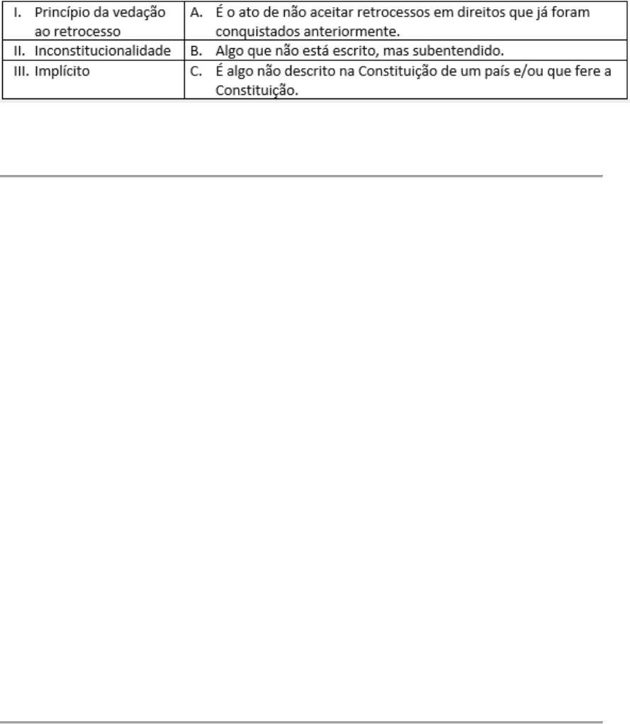 Direitos e seguridade social 1)Leia e associe as duas colunas: Assinale a alternativa que traz a associação correta entre as duas colunas: Alternativas: • I-C; II-B; III-A. • I-A; II-B; III-C. • I-A; II-C; III-B. CORRETO • I-C; II-A; III-B. • I-B; II-A; III-C. Resolução comentada: O princípio da vedação ao retrocesso em direitos, sejam direitos civis ou direitos sociais, diz respeito a não permissão, por parte do judiciário, em impedir desvantagens e/ou perdas em direitos, dentro de uma sociedade. No que diz respeito à utilização do termo “inconstitucionalidade”, é algo que fere diretamente a Lei maior de um país, enquanto a palavra “implícita” diz respeito ao ato de reconhecer algo como verdadeiro, ainda que não esteja escrito ou explícito. Código da questão: 61692 2)Durante o Governo Ditatorial, iniciado em 1964 por meio de golpe, foram usados muitos métodos de repressão contra os opositores ao governo, os quais variadas técnicas desumanas de tortura. Em termos constitucionais atuais, quais direitos foram infringidos e negligenciados durante esse período? Alternativas: • Os Direitos Humanos. CORRETO • O Direito Administrativo. • A Solidariedade Social. • Os direitos que regem o sistema econômico. • O Direito à propriedade. Resolução comentada: A resposta correta é “Direitos Humanos”, pois os Direitos Humanos, por sua vez, são garantias e direitos individuais, sendo os métodos de repressão a via oposta desses princípios. Código da questão: 57053 3)Sobre os Direitos Sociais e a Seguridade Social, aponte a alternativa incorreta: Alternativas: • As pessoas que são impossibilitadas de se sustentarem por conta própria são amparadas pela seguridade social. • Além de outros fatores, um dos pontos em que a Previdência Social e a Assistência Social se diferem é no fator de contribuição. A Previdência exige a contribuição do seu usuário, já a Assistência Social é dedicada àqueles que não possuem condições básicas de subsistência. • Os Direitos do Trabalhador surgem devido ao alto grau de exploração sofrido pelos trabalhadores nos primórdios da industrialização. • Os Direitos Sociais têm sua origem na criação da Assistência Social, a qual permitiu grandes avanços nas políticas sociais. CORRETO • Os Direitos Sociais são a extensão dos Direitos Fundamentais, como a segunda parte constitutiva destes, pois servem como amparo às necessidades da população. Resolução comentada: A alternativa incorreta é “Os Direitos Sociais têm sua origem na criação da Assistência Social, a qual permitiu grandes avanços nas políticas sociais”, tendo em vista que os Direitos Sociais representam uma segunda fração dos Direitos Fundamentais. A Assistência Social, neste contexto, não traz consigo o conceito que origina os Direitos Sociais, já que ela surge para integrar o conceito de Seguridade Social. A questão incorreta apresenta o processo inverso. Código da questão: 57065 4)Com base na interpretação dos aspectos históricos em que as políticas sociais foram criadas, aponte a alternativa que corresponda ao motivo pelo qual os direitos são primeiramente atribuídos à classe trabalhadora em seu início. Alternativas: • As relações de produção estabelecidas tiveram grande importância para a atribuição de direitos aos trabalhadores, pois, para ela existir, são necessários meios dignos para que a classe trabalhadora possa atuar, os dois agem em uma relação de interdependência. Sendo assim, as Políticas Sociais surgem naturalmente com a implementação do sistema capitalista. • O principal motivo é que o capitalismo industrial tinha como engrenagem o trabalho, sendo assim as forças econômicas capitalistas fomentaram a miséria que assolava a classe trabalhadora da época. A articulação dos movimentos sociais e sindicatos que compunham a classe operária, foi a responsável por abrir caminhos para a criação e implementação de direitos que posteriormente se estenderam aos outros grupos sociais. CORRETO • Considerando que a mão-de-obra possui caráter espontâneo em todas as sociedades, os direitos regidos por lei possuíram apenas o caráter de registro, já que a situação em que os trabalhadores se encontravam não presumia uma ação direta do Estado. • Os direitos surgem da necessidade de seguridades da classe operária. O principal motivo é que quando as dinâmicas de produção foram estabelecidas, o Estado reconheceu naturalmente que essa classe era essência, tendo eles prioridade reconhecida pelas instâncias. • Por ter caráter passivo, a classe trabalhadora foi privilegiada pelo olhar estatal, porque as ações de reivindicação não eram bem vistas aos olhos do Poder Público. Resolução comentada: Devido aos movimentos da classe trabalhadora na Europa do século XIX, os direitos foram, pela primeira vez, atribuídos a essa classe. Esse período foi o ponto alto de explicitação do caráter abusivo do Estado, que legitimava as ações degradantes decorrentes do processo de industrialização, as quais recaíam diretamente sobre os trabalhadores. Nesse contexto, a movimentação da classe operária foi essencial. Código da questão: 57070 5)Quanto ao Direito do Idoso, Direito da Criança, do Adolescente e o Direito da Pessoa com Deficiência, podemos afirmar que: I. A criação do ECA (Estatuto da Criança e do Adolescente) possibilitou ao Estado olhar para as crianças como sujeitos de fato, que possuem necessidades e a quem devem ser destinadas políticas públicas diretas. II. Os três respectivos direitos já existiam na norma anterior, mas foram reformulados na nova Constituição Federal, a de 1988, recebendo a devida atenção, conforme as necessidades se atualizaram. III. Os três grupos recebem apenas estatutos que os protegem e responsabilizam o Estado e a sociedade caso haja o descumprimento da lei. IV. O salário mínimo é atribu