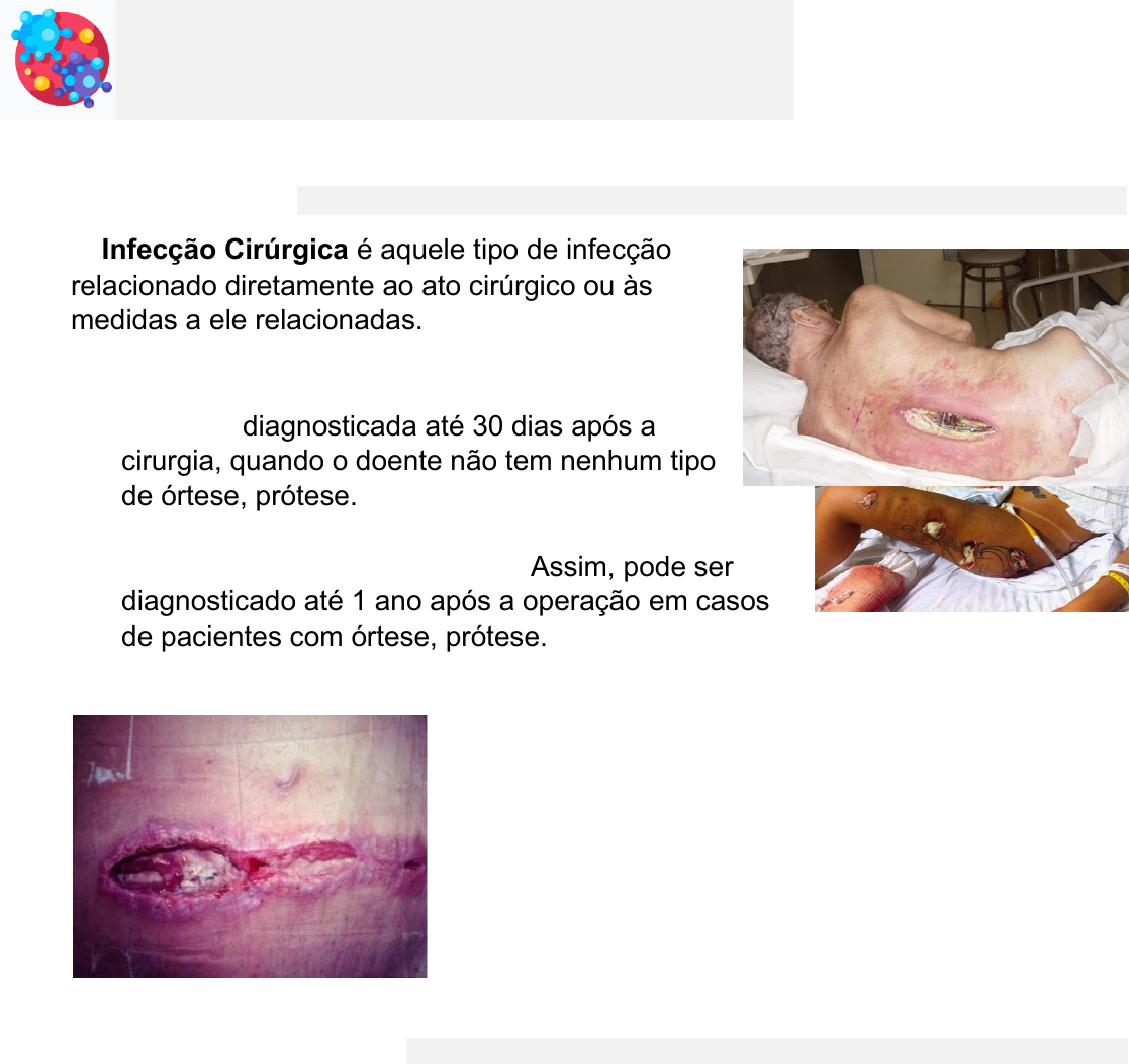 Infecções Cirúrgicas INTRODUÇÃO ✦ Infecção Cirúrgica é aquele tipo de infecção relacionado diretamente ao ato cirúrgico ou às medidas a ele relacionadas. Frequentemente se manifestará após a alta do paciente Pode ser diagnosticada até 30 dias após a cirurgia, quando o doente não tem nenhum tipo de órtese, prótese. - Se ele tiver, pode formar um biofilme ali e ser um local de proliferação bacteriana. Assim, pode ser diagnosticado até 1 ano após a operação em casos de pacientes com órtese, prótese. ✦ Infecções pós operatórias constituem um dos maiores riscos para os pacientes hospitalizados: Grande aumento dos riscos de morbi- mortalidade Aumenta a permanência hospitalar (precisa de mais atenção, mais procedimentos, tem melhora lente, e as vezes precisa trocar o antibiótico) Aumenta os custos TIPOS DE CIRURGIA Toda cirurgia tem bactéria, e tem um certo grau de contaminação, pois a partir do momento que fazemos a incisão as próprias bactérias da pele vão contaminar a ferida, usamos as técnicas de assepsia para que essas bactérias sejam eliminadas ou fiquem em estado de latência durante a cirurgia, para não aumentar a contaminação e lesionar o sitio cirúrgico. 1) Cirurgia Limpa Cirurgias que o único contato é com bactérias da pele, e não com outras cavidades como geniturinário e gastrointestinal. Exp: Tireoidectomia, hernioplastia, mamoplastia As feridas cirúrgicas não são infectadas, sem inflamação, não traumáticas Não ocorre quebra dos princípios de antissepsia e das técnicas cirúrgicas O trato gastrointestinal, urinário ou respiratório não é penetrado 2) Potencialmente contaminadas Durante o ato operatório, ocorreu alguma quebra cirúrgica, e houve contaminação com o conteúdo da cavidade que estava manipulando, mas esse contato foi em uma pequena quantidade, tendo contato com uma flora bacteriana que não é somente aquela das bactérias comuns a pele. Feridas em que houve pequena infração da técnica cirúrgica ou aquelas com dificuldade de antissepsia O trato gastrointestinal, urinário ou respiratório foi penetrado, no entanto a contaminação não foi significativa. Teve lesão de algum vaso, musculatura ou outro órgão. Exp: Colecistectomia, Gastrectomia 3) Contaminada Neste tipo tem uma grande quantidade do conteúdo na cavidade, assim tem grande quantidade de bactérias. Feridas traumáticas recentes (<6 horas do trauma), abertas, presença de processo inflamatório, sem presença de pus Quando tenho processo inflamatório sme presença de pus (como apendicite) Ocorre grandes quebras das técnicas de antissepsia, material não esterilizado ou doente não preparado da forma correta. Houve contaminação por extravasamento grosseiro do trato gastrointestinal, urinário, respiratório. 4) Infectadas Feridas traumática não recentes (+6 horas), com tecidos desvitalizados ou presença de pus, e vísceras perfuradas. Exp: Fratura exposta, Isquemia mesentérica, Peritonite, Úlcera gástrica perfurada (em um primeiro momento cai uma grande quantidade de secreção no TGI e ai vai ter uma contaminação, com bactérias, mas se o paciente fica com esse conteúdo no TGI irritando o peritônio, vai fazer uma proliferação de bactérias, gerando lesão tecidual e evoluindo como peritonite). TIPOS DE INFECÇÃO Infecção da ferida operatória Infecção urinária Infecção respiratória Sepse Abscesso Abdominal e Peritonite ✦ Infecção da Ferida Operatória (ISC) São infecções que ocorrem em qualquer localização do sítio cirúrgico após procedimento operatório. A infecção da ferida é aquela onda há presença de pus (pode ter eritema, edema) Geralmente é diagnostica após a alta (pois existe um tempo de incubação da bactéria até começar a aparecer os sinais da infecção. Começa no 5º dia do pós-operatório, até o 10º e tem o pico no 7º dia – algumas alterações antes disso pode ser normal) Divididas em: Infecção de Sítio cirúrgico Superficial – Acometimento da pele e do tc. Celular subcutâneo (+comuns) Infecção de Sitio cirúrgico Porfunda - + agressivas. Geram maior mortalidade. Acometem fácia e tec. Musculo-aponeurótico. Infecções em tecidos mais vascularizados e por isso tem maior extensão e o tratamento é + radical (geralmente desbridamento + antibioticoterapia) ✦ Infecção Urinária Para fechar o diagnóstico preciso de uma urinocultura que vai vir com resultado de mais de 100000 colônias por cada ml, associado a presença de queixas urinárias. É a segunda infecção pós-operatória mais frequente. Na imagem paciente com sonda vesical de demora – A infecção urinaria em doentes pós-operatório tem mt relação com o uso de sonda vesical, material tem que ser todo estéril, luva estéril, se não carreamos bactérias para dentro do trato urinário que vai ir pra bexiga. Além disso o paciente teve uma cirurgia e já esta mais predisposto a ter infecção. E quanto mais tempo o doente fica com a sonda (corpo estranho), fazendo uma comunicação do meio externo com o meio interno ele esta suscetível a infecção. Paciente com 10 dias ou + do cateter tem 50% mais chance de desenvolver infecção. ISC superficial ISC profunda ✦ Infecção Respiratória Mais temida, maior morbi-mortalidade São divididas em: Infecções altas (Traqueobronquite, Bronquite e Bronquiolite) Tosse produtiva acompanhada ou não de febre, broncoespasmo, roncos e sibilos à ausculta. Rx normal: Sem evidências clínicas e radiológicas de pneumonia Pneumonia É a terceira causa de infecção hospitalar no pós-operatório Tosse produtiva, acompanhada de febre e alterações radiológicas compatíveis, condensação no RX (idoso pode não ter febre) Confirmação bacteriológica é importante Pneumonia com derrame pleural, geralmente é um exsudato Pacientes ficam mt tempo acamados, e isso predispõe a infecções, pois tem acumulo de secreção ali que pode virar um substrato (