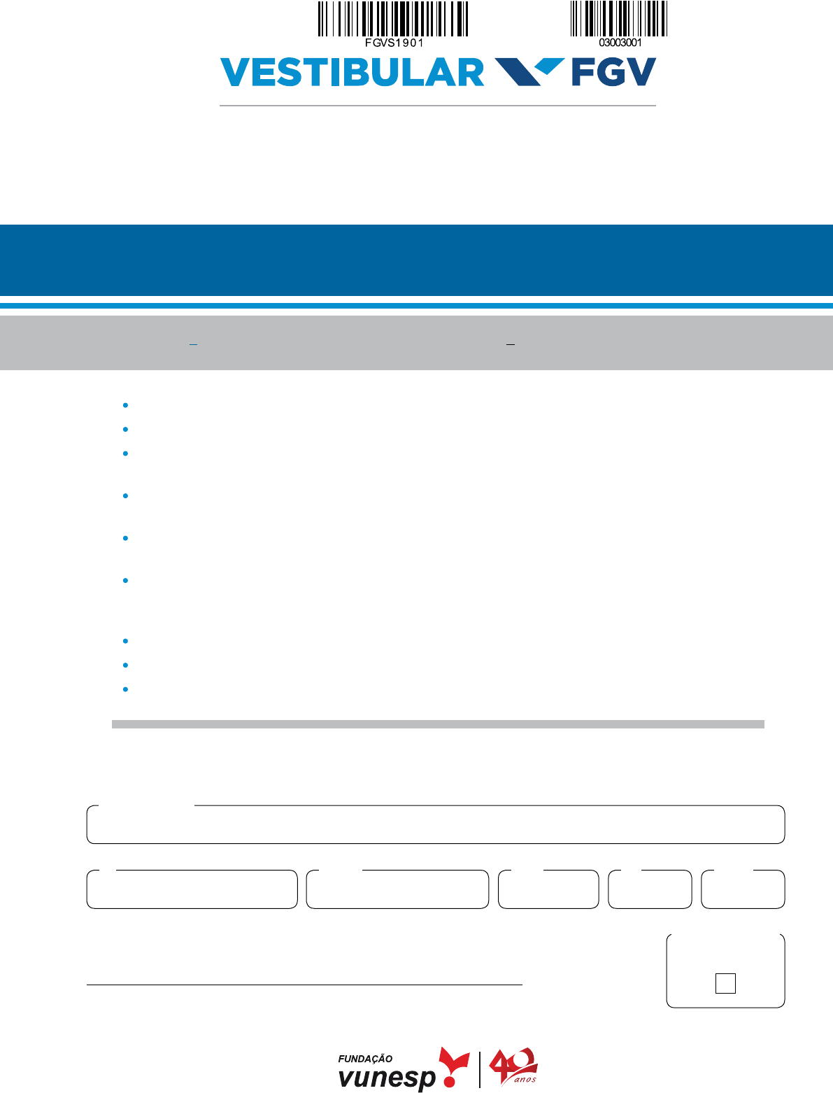 AguArde A ordem do fiscAl pArA Abrir este cAderno de questões. Você recebeu este caderno contendo 4 questões discursivas. Confira seus dados impressos neste caderno. Quando for permitido abrir o caderno, verifique se está completo ou se apresenta imperfeições. Caso haja algum problema, informe ao fiscal da sala. Assine apenas no local indicado. Será atribuída nota zero à questão que apresentar nome, rubrica, assinatura, sinal, iniciais ou marcas que permitam a identificação do candidato. Redija as respostas com caneta de tinta azul ou preta. Os rascunhos não serão considerados na correção. A ilegibilidade da letra acarretará prejuízo à nota do candidato. Esta prova terá duração de 2h, já incluído o tempo para a transcrição das respostas, e o candidato só poderá sair definitivamente da sala depois de transcorridos 30 minutos, contados a partir do início da prova. Os últimos três candidatos deverão se retirar juntos da sala, assinando termo respectivo. Ao sair, você entregará ao fiscal este caderno. Até que você saia do prédio, todas as proibições e orientações continuam válidas. 08.12.2019 | 8h 2a fAse | processo seletivo – 1o semestre de 2020 003. provA de mAtemáticA grAduAção em economiA – sp Ausente uso eXclusivo do fiscAl Assinatura do candidato Nome do candidato Prédio Sala CarteiraInscriçãoRG questão 01 Uma empresa pratica monopólio vendendo o mesmo produto por preços p1 e p2 em dois estados diferentes (1 e 2), como se fosse duas empresas diferentes. Pode-se demonstrar que, nesse caso, essa empresa maximizará seus lucros se con- seguir praticar os preços p1 e p2 de forma que ocorra a igualdade , sendo e1 e e2 as elasticidades da demanda do produto nos dois estados. a) Admita que a elasticidade da demanda do produto no estado 1 seja igual a k e, no estado 2, seja igual a 2k. Em uma situação de maximização de lucros, faça o estudo completo dos sinais de em função de k ≠ 1 e pertencente aos números reais. b) Em uma situação de maximização de lucros na venda do produto nos dois estados, admita que essa empresa esteja praticando os preços, em reais, p1 = 5 e p2 = 6. Tendo –1 < e2 < 0 e sabendo que e1 = (e2) 3, determine e2. 2FGVS1901 | 003-Cad1-Matemática NÃO ASSINE ESTA FOLHA rAs cun Ho Em hipótese alguma será considerado o texto escrito neste espaço. questão 01 3 FGVS1901 | 003-Cad1-Matemática RESolução E RESpoSta Não aSSINE ESta FolHa questão 02 Uma função f(x) é definida nos inteiros positivos por: a) Calcule f(102) – f(101). b) Resolva a equação na incógnita n. 4FGVS1901 | 003-Cad1-Matemática NÃO ASSINE ESTA FOLHA rAs cun Ho Em hipótese alguma será considerado o texto escrito neste espaço. questão 02 5 FGVS1901 | 003-Cad1-Matemática RESolução E RESpoSta Não aSSINE ESta FolHa questão 03 DEFG representa uma folha de papel quadrada, de área igual a 25 cm2. Essa folha foi dobrada, como mostra a figura, forman- do o triângulo FGV. Depois de feita a dobra, a distância entre F e GV é igual a 3 cm. a) Calcule a medida de FV . b) Depois de feita a dobra no papel, admita que θ seja a medida do ângulo agudo . Calcule cos θ. 6FGVS1901 | 003-Cad1-Matemática NÃO ASSINE ESTA FOLHA rAs cun Ho Em hipótese alguma será considerado o texto escrito neste espaço. questão 03 7 FGVS1901 | 003-Cad1-Matemática RESolução E RESpoSta Não aSSINE ESta FolHa questão 04 Uma clínica de idosos conta com 10 médicos contratados. A política de rodízio adotada é a de sempre ter 5 deles em atendimento na clínica, 2 deles em visitas aos pacientes que tiveram alta e 3 deles de reserva, podendo ser chamados a qualquer momento em casos de emergência. a) De quantas maneiras diferentes essa clínica pode distribuir seus dez médicos contratados pelos três grupos? b) Se quatro médicos informam que não desejam estar de reserva e um informa que só poderá ficar de reserva, calcule o novo número de possibilidades de alocação dos médicos nos três grupos contemplando as necessidades desses médicos. 8FGVS1901 | 003-Cad1-Matemática não Assine estA folHA rAs cun Ho Em hipótese alguma será considerado o texto escrito neste espaço. questão 04 9 FGVS1901 | 003-Cad1-Matemática RESolução E RESpoSta Não aSSINE ESta FolHa rAs cun Ho 10FGVS1901 | 003-Cad1-Matemática Em hipótese alguma será considerado o texto escrito neste espaço. não Assine estA folHA rAs cun Ho 11 FGVS1901 | 003-Cad1-Matemática Em hipótese alguma será considerado o texto escrito neste espaço. não Assine estA folHA