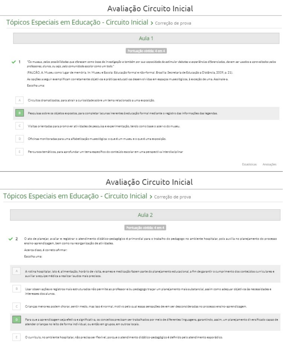 Exercícios Tópicos Especiais em Educação Fev 2020 Exercícios Tópicos Especiais em Educação Fev 2019 1 “Os museus, pelas possibilidades que oferecem como base de investigação e também por sua capacidade de estimular debates e experiências diferenciadas, devem ser usados e aproveitados pelos professores, alunos, ou seja, pela comunidade escolar como um todo.” (FALCÃO, A. Museu como lugar de memória. In: Museu e Escola: Educação formal e não-formal. Brasília: Secretaria de Educação a Distância, 2009, p. 21). As opções a seguir exemplificam corretamente objetivos e práticas educativas desenvolvidas em espaços museológicos, à exceção de uma. Assinale-a. Escolha uma: a. Pesquisas sobre os objetos expostos, para completar lacunas inerentes à educação formal mediante o registro das informações das legendas. Correto b. Oficinas monitoradas para uma alfabetização museológica: o que é um museu e o que é uma exposição. c. Visitas orientadas para promover atividades de pesquisa e experimentação, tendo como base o acervo do museu. d. Percursos temáticos, para aprofundar um tema específico do conteúdo escolar em uma perspectiva interdisciplinar e. Circuitos dramatizados, para atrair a curiosidade sobre um tema relacionado a uma exposição. Feedback Sua resposta está correta. A resposta correta é: Pesquisas sobre os objetos expostos, para completar lacunas inerentes à educação formal mediante o registro das informações das legendas.. 2 O ato de planejar, avaliar e registrar o atendimento didático-pedagógico é primordial para o trabalho do pedagogo no ambiente hospitalar, pois auxilia no planejamento do processo ensino-aprendizagem, bem como na reorganização de atividades. Acerca disso, é correto afirmar: Escolha uma: a. A rotina hospitalar, isto é, alimentação, horário de visita, exames e medicação fazem parte do planejamento educacional, a fim de garantir o cumprimento dos conteúdos curriculares e auxiliar a equipe médica a realizar laudos mais precisos. b. Crianças menores podem chorar, sentir medo, mas isso é normal, motivo pelo qual essas sensações devem ser desconsideradas no processo ensino-aprendizagem. c. Usar observações e registros mais estruturados não permite ao professor e/ou pedagogo traçar um planejamento mais substancial, assim como adequar objetivos às necessidades e interesses dos alunos. d. O currículo, no ambiente hospitalar, não precisa ser flexível, porque o atendimento didático-pedagógico é definido pelo atendimento esporádico. e. Para que a aprendizagem seja efetiva e significativa, os conceitos precisam ser trabalhados por meio de diferentes linguagens, garantindo, assim, um planejamento diversificado capaz de atender crianças no leito de forma individual, ou então em grupos, em outros locais. Correto Feedback Sua resposta está correta. A resposta correta é: Para que a aprendizagem seja efetiva e significativa, os conceitos precisam ser trabalhados por meio de diferentes linguagens, garantindo, assim, um planejamento diversificado capaz de atender crianças no leito de forma individual, ou então em grupos, em outros locais.. 3 O Caderno de Estudos apresentou o programa “Educação nos trilhos” criado em 2000, em parceria com a Fundação Vale do Rio do Doce, no qual transforma a ferrovia num veículo de educação, cujo objetivo é estimular ações de cidadania por meio de um projeto socioeducativo que acontece nas estações e nos trens de passageiros da Companhia Vale do Rio Doce. No projeto destacam-se duas etapas intituladas: Estação Conhecimento e Teletrem. Assinale a seguir qual item não corresponde aos objetivos educativos das etapas desse tipo de projeto: Escolha uma: a. Serviços relacionados às demandas locais de saúde e direito do cidadão. b. Oficinas temáticas de assuntos locais com uma visão abrangente do mundo. c. Abordagem de conteúdos curriculares da Educação Básica. d. Processos de aprendizagem por meio de atividades lúdicas. e. Estratégias de formação profissional atendendo as necessidades da Vale do Rio Doce. Correto Feedback Sua resposta está correta. A resposta correta é: Estratégias de formação profissional atendendo as necessidades da Vale do Rio Doce.. 4 Analise as afirmativas abaixo e depois marque a opção correta: I – O pedagogo empresarial promove ações multidisciplinares nas diversas áreas da empresa, articulando as pessoas e estimulando a gestão de conhecimentos. II – O pedagogo empresarial é o condutor dos processos relacionados à construção do saber prático e da educação como veículo do desenvolvimento humano e social, a ser empregado no cotidiano das organizações. III – O pedagogo empresarial promove a reconstrução de conceitos básicos, como criatividade, espírito de equipe e autonomia emocional e cognitiva. IV – O pedagogo empresarial tem uma função específica que não condiz à implantação de programas de qualificação, requalificação e práticas de treinamento. Está correto o que se afirma em: Escolha uma: a. I, II, III e IV. b. II e IV. c. I e III. d. I, II e III. Correto e. I, III e IV. Feedback Sua resposta está correta. A resposta correta é: I, II e III.. 5 Leia as ideias abaixo e julgue se estão corretas ou incorretas. I – O moderno cenário da educação se destaca no século XXI com novas expectativas para o profissional pedagogo que se insere no mercado de trabalho, sob diversas abrangências, como nos mostra a própria sociedade, que vive um momento particular de discussões sobre globalização, neoliberalismo, terceiro setor, educação on-line etc. Enfim, uma nova estrutura se firma na sociedade. II – A sociedade do conhecimento exige profissionais cada vez mais qualificados e preparados para a atuação neste cenário competitivo. III – A educação em espaços não escolares não confirma a discussão sobre a expansão do mercado de trabalho. O pedagogo restringe sua a