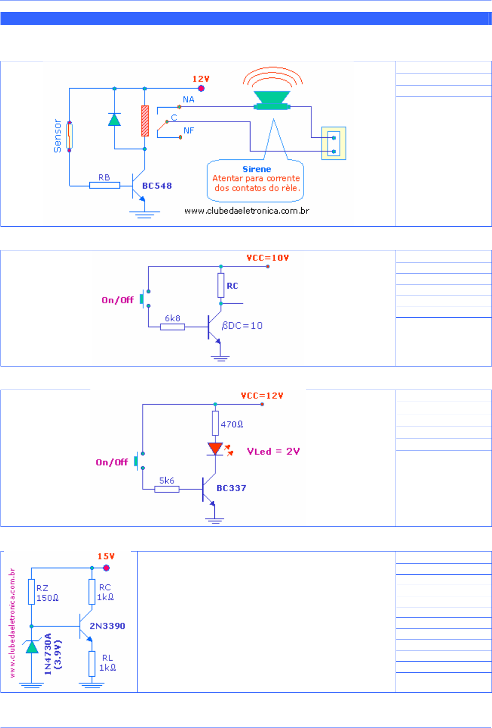 CLUBE DA ELETRÔ NI CA ELETRÔN IC A GER AL Lista de exercícios – Transistor como chave e fonte de corrente – Autor: Clodoaldo Silva – Rev: 25Ago2007. Lista de exercícios – Transistor como chave e fonte de corrente 1- Sabendo-se que o relé necessita de uma corrente de 40mA para comutar seus estados (NA e NF) e que o BC548 satura quando βDC = 10. Calcule o resistor de base. Respostas: RB = 2225Ω 2- Dimensione o resistor de coletor para a chave eletrônica abaixo. Respostas: RC = 731,53Ω 3- Para chave eletrônica abaixo, quais as correntes IC e IB? Respostas: IC = 21,28mA IB = 2,02mA 4- O circuito abaixo funciona como uma fonte de corrente constante para carga RL de 1000Ω. Deseja-se: Respostas: Icarga = 3,2mA IC = 3,2mA VZ = 11,1V IZ = 74mA PZ =288,6mW PR = 821,4mW Vcarga = 3,2V VRC = 3,2V VCE = 8,6V a) Qual a corrente na Carga? b) Qual a corrente no coletor do transistor? c) Qual a tensão no Zener? d) Qual a corrente no zener? e) Qual a potência do zener? f) Qual a potência do resistor (100Ω) limitador do zener g) Qual a tensão na carga? h) Qual a tensão VRC do transistor? i) Qual a tensão VCE do transistor? CLUBE DA ELETRÔ NI CA ELETRÔN IC A GER AL Lista de exercícios – Transistor como chave e fonte de corrente – Autor: Clodoaldo Silva – Rev: 25Ago2007. 5- O circuito abaixo consiste em parte de um sistema de casa inteligente, onde através de um computador o usuário pode acender a lâmpada de sua garagem. Deseja-se saber: a) Qual valor de resistor (R) deve ser usado no opto acoplador? b) Qual valor de resistor (RB) deve ser usado na base do transistor? c) Qual a corrente que circula pelos contatos do relé? Dados ILed = 10mA Vled = 2V I Bobina = 40mA Respostas: R = 300Ω RB = 2825Ω I cont = 787,4mA 6- O circuito abaixo funciona como uma fonte de corrente constante para carga RL de 1000Ω. Deseja-se: Respostas: Icarga = 3,2mA IC = 3,2mA VZ = 11,1V IZ = 74mA PZ =288,6mW PR = 821,4mW Vcarga = 3,2V VRC = 3,2V VCE = 8,6V a) Qual a corrente na Carga? b) Qual a corrente no coletor do transistor? c) Qual a tensão no Zener? d) Qual a corrente no zener? e) Qual a potência do zener? f) Qual a potência do resistor (100Ω) limitador do zener g) Qual a tensão na carga? h) Qual a tensão VRC do transistor? i) Qual a tensão VCE do transistor? 7- Dimensione RC e RB para chave eletrônica abaixo. Escolha IC de saturação = 10mA. Respostas: RC = 1kΩ RB = 9300Ω Dado: VBE = 1,4V Respostas: IB = 10,6mA 8- O circuito ao lado foi projetado e testado para operar com chave eletrônica. Em seu coletor foi colocado um cooler 12V/1A que é ligado quando VBB = 12V. Qual a corrente de base? A disciplina é a parte mais importante do êxito. (Truman Capote, novelista norte-americano) www.clubedaeletronica.com.br