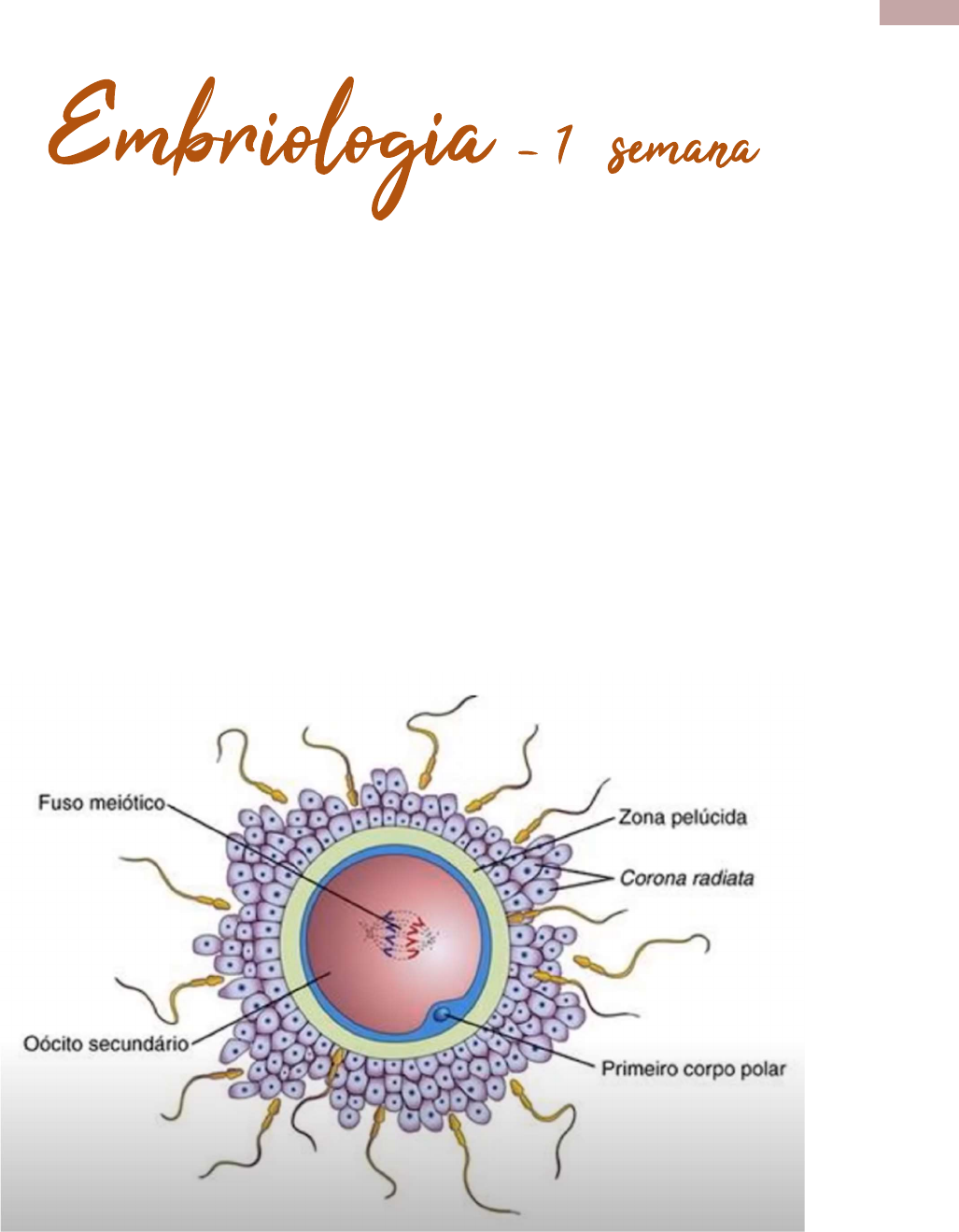 UNIME 1 Danton Dantas Aragão ° Fecundação: - Contato do oócito com o espermatozóide na tuba uterina. Termina quando há mistura dos cromossomos paternos e materno durante a primeira divisão mitótica do ZIGOTO. - O ZIGOTO, nada mais é do que ele tem que transpor várias barreiras até ele conseguir finalmente adentrar não é no oócito para que se é complete o processo da fecundação. Ele não só tem que transpor várias Barreiras como ele ainda compete com os seus pares porque afinal somente um espermatozoide vai conseguir fecundar o oócito. - A primeira Barreira que o espermatozóide tem que vencer é passar pela corona radiata. A corona radiata consiste em 2 a 3 camadas de células foliculares (são células remanescentes do folículo ovariano, essas camadas de células foliculares vêm junto com o rosto e elas estão ligadas a uma camada protetora exterior do óvulo). Então o espermatozóide tem na sua cabeça alumas enzimas que vão agir sobre a corona radiata e sobre a zona pelúcida, de forma a conseguir vencer essa barreira e penetrar na zona pelúcida. - Quando espermatozóide consegue então ultrapassar essas barreiras vai haver uma fusão da membrana plasmática do oócito e do espermatozoide, o que denota o término da segunda divisão meiótica do oócito, formando o PRÓNUCLEO FEMININO (material genético feminino). - Quando o espermatozoide adentra o oócito, há a formação do PRÓNUCLEO MASCULINO. Degenerando a cauda do espermatozoide, unindo os dois prónúcleos, completando o processo de fecundação. UNIME 2 Danton Dantas Aragão - A partir desse momento inicia-se a CLIVAGEM DO ZIGOTO, onde ocorrem inúmeras divisões mitóticas sucessivas. - Uma célula se divide em duas, que se dividem em quatro. - Formação dos blastômeros. Cada vez menores, já que o tamanho total do zigoto não muda pois ainda é envolto pela zona pelúcida. - A medida que se dividem, os blastômeros permanecem mais unidos, dando início a MÓRULA. A mórula se forma 3 dias após a fecundação, chegando então ao útero; - UNIME 3 Danton Dantas Aragão - A partir do 4° dia ocorre o fenômeno de BLASTOGÊNESE. O líquido da cavidade uterina começa a infiltrar dentro da mórula, ocupando a parte central do embrião, empurrando os BLASTÔMEROS para a região periférica. Além do desaparecimento da zona pelúcida, a partir desses eventos começa o crescimento do embrião. Representação de BLASTOCISTO abaixo: UNIME 4 Danton Dantas Aragão - Trofoblasto dá origem a placenta, enquanto o embrioblasto dá origem ao embrião, per si. - A implantação do embrião vai ocorrer em torno de 6 dias após a fecundação, o blastocisto se fixando à porção endometrial; - A partir da implantação no epitélio endometrial através do polo embrionário, começa a diferenciação do trofoblasto (sinciciotrofoblasto, citotrofoblasto, hipoblasto); - SINCICIOTROFOBLASTO: massa protoplasmática multinucleada sem limites celulares observáveis - O sinciciotrofoblasto invade o epitélio endometrial se fizando de forma mais vigorosa; - HIPOBLASTO – ENDODERMA PRIMÁRIO: camada de células que reveste o embrioblasto (7° dia).