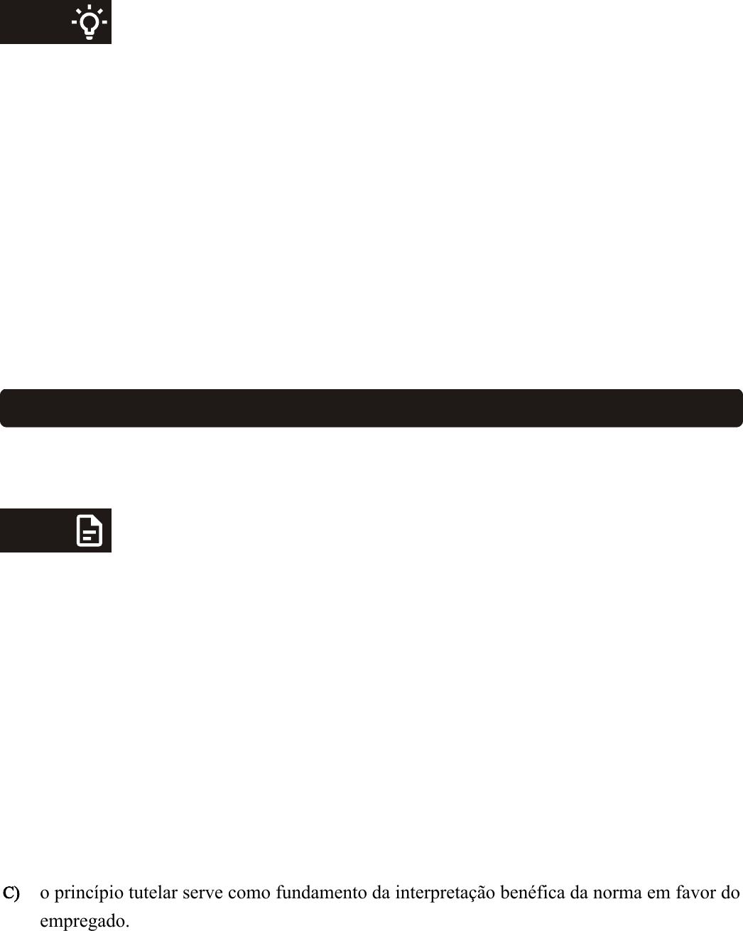 DICA DO PROFESSOR As decisões judiciais da Justiça do Trabalho tornam efetivos os direitos constitucionalmente garantidos aos trabalhadores, razão pela qual o estudo sobre a interpretação do Direito, seus princípios e suas fontes possibilita a compreensão de como ele regerá as situações. O conhecimento sobre o pensamento dos juízes e sobre como eles decidirão os casos torna-se fundamental. Veja, nesta Dica do Professor, como os juízes se posicionaram em relação à Reforma Trabalhista de 2017 e como a Associação Nacional dos Magistrados da Justiça do Trabalho orientou os juízes brasileiros a decidir, especialmente quanto à hierarquia das fontes do Direito do Trabalho. Conteúdo interativo disponível na plataforma de ensino! EXERCÍCIOS 1) Os princípios são vetores axiológicos que auxiliam na interpretação do Direito. Em relação aos princípios, pode-se afirmar que: A) a CLT exclui a possibilidade de utilização do princípio da proteção do trabalhador. B) a proteção do trabalhador é importante como forma de proteção do empregador, tendo caráter de indisponibilidade. C) o princípio tutelar serve como fundamento da interpretação benéfica da norma em favor do empregado. D) o princípio tutelar difere do princípio de proteção do trabalhador, apresentando finalidades diversas. E) o princípio da proteção do trabalhador e o princípio tutelar-protetivo são diferentes entre si. 2) A interpretação da norma pelo juiz tornará o direito do trabalhador efetivo, razão da importância de seu estudo. Na dúvida entre as duas normas, o juiz deve: A) interpretar favoravelmente ao empregador, pois o capital permite a geração de mais empregos. B) interpretar favoravelmente ao empregado, pois este é a parte mais fraca na relação empregatícia. C) interpretar a norma de forma equitativa, pois o Poder Judiciário não pode equiparar eventuais diferenças entre as partes. D) interpretar a norma observando o melhor interesse da empresa, pois a continuidade da relação de emprego não é relevante. E) interpretar conforme os princípios do Direito Civil, que orientam o Juiz quanto às regras de interpretação. 3) O estudo das fontes do Direito é necessário para a criação de direito e compreensão da hierarquia entre elas. Sobre isso, assinale a alternativa correta: A) As fontes materiais são aquelas que levam ao desenvolvimento das fontes formais. B) As fontes formais são a própria expressão do Direito e se confundem com as fontes materiais. C) As fontes formais são as leis e o direito natural, que servem de fundamento do arbítrio humano. D) As fontes formais e as fontes materiais são fundamentais no Direito Civil, não se usando no Direito do Trabalho. E) As fontes formais e materiais não criam direito, servindo como expressão do direito estatal. 4) A hierarquia entre fontes auxilia na interpretação da norma, principalmente considerando os princípios juslaborais. Sobre isso, assinale a alternativa correta: A) A Reforma Trabalhista permitiu que o legislado prevalecesse sobre o negociado a partir de negociação coletiva. B) A Reforma Trabalhista não dispôs sobre a possibilidade de negociação entre empregados e empregadores. C) Os empregados e empregadores não negociam normas relativas ao vínculo empregatício. D) Os empregados e os empregadores podem negociar qualquer regra trabalhista. E) A Reforma Trabalhista permitiu que empregados e empregadores negociem mediante convenção coletiva de trabalho. 5) As decisões trabalhistas consideram as fontes e os princípios na escolha do Direito aplicável ao caso concreto. Afirma-se que: A) os princípios aplicam-se na relação de direito processual, deixando de interferir na relação de direito material. B) os princípios são aplicáveis na relação de direito material e na relação processual. Highlight Highlight C) os princípios influem na relação de direito material, deixando de influir na relação processual. D) os princípios se aplicam na fase de confecção das normas; desconsideram-se os princípios na fase de aplicação do direito. E) quando da confecção das normas trabalhistas, os princípios são desconsiderados. NA PRÁTICA Os Tribunais trabalhistas têm a prática de observância dos princípios de Direito do Trabalho em prol da proteção da parte hipossuficiente da relação empregatícia, considerando a necessidade de equiparação entre as partes da relação processual. O paradigma adotado nos Tribunais brasileiros valoriza a proteção do empregado. Veja, neste Na Prática, que o Tribunal Regional do Trabalho da 4.ª Região está alterando alguns de seus entendimentos sobre algumas matérias, depois da Reforma Trabalhista, relativizando os princípios protetivos aos trabalhadores. Em uma ação que tramita desde 1992, o Tribunal determinou que os reclamantes ajuízem nova demanda para a satisfação de seu crédito.