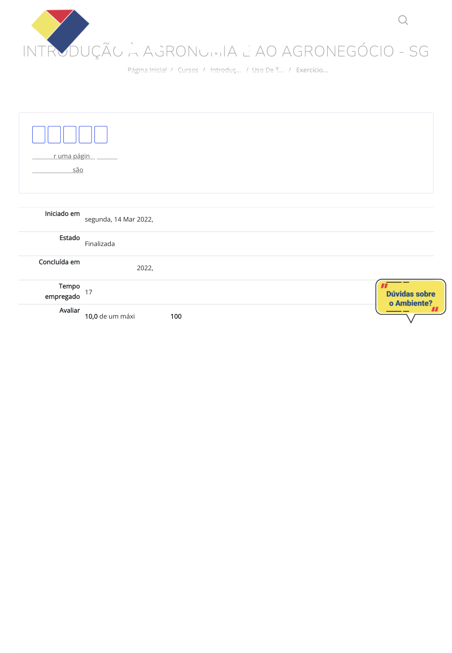 INTRODUÇÃO À AGRONOMIA E AO AGRONEGÓCIO - SG Página Inicial / Cursos / Introduç… / Uso De T… / Exercício… Iniciado em segunda, 14 Mar 2022, 08:52 Estado Finalizada Concluída em segunda, 14 Mar 2022, 09:09 Tempo empregado 17 minutos 37 segundos Avaliar 10,0 de um máximo de 10,0(100%) Mostrar uma página por vez Terminar revisão 1 2 3 4 5 https://cpetead.com.br/ https://cpetead.com.br/course/index.php https://cpetead.com.br/course/view.php?id=2302 https://cpetead.com.br/mod/quiz/view.php?id=56658 https://cpetead.com.br/mod/quiz/review.php?attempt=2049818&cmid=56658&showall=0 https://cpetead.com.br/mod/quiz/view.php?id=56658 https://cpetead.com.br/ QUESTÃO Correto Atingiu 2,0 de 2,0 1 Os sistemas de gerenciamento de propriedades agropecuárias constituem uma tecnologia que pode aumentar a e�ciência da propriedade. A excelência da gestão da propriedade é fundamental para seu sucesso. Qual é o grande diferencial dos sistemas de gerenciamento que explicam sua aplicação em propriedades agrícolas? Escolha uma opção: a. Possibilidade de identi�car talhões da propriedade, apesar de não os identi�car na visualização �nal dos dados. b. Facilidade no registro de grandes informações �nanceiras e técnicas e melhor visualização posterior das informações c. Permite que apenas o produtor tenha conhecimento das informações da propriedade, mantendo o sigilo de suas informações. d. Possibilitar o registro de informações �nanceiras, apesar da complexidade da entrada de dados da maioria dos sistemas e. Maior complexidade das informações �nais, facilitando a tomada de decisão. Sua resposta está correta. A resposta correta é: Facilidade no registro de grandes informações �nanceiras e técnicas e melhor visualização posterior das informações QUESTÃO Correto Atingiu 2,0 de 2,0 2 O milho com a tecnologia Bt tem grande área de cultivo no Brasil e no mundo. Esta biotecnologia é empregada no controle de pragas. Quais pragas essa tecnologia controla? Escolha uma opção: a. Controla todas as pragas e polinizadores da cultura do milho, não apresentando seletividade de ação. b. A biotecnologia apresenta seletividade, controlando apenas as pragas-alvo, que são principalmente lagartas. c. O milho Bt é imune a doenças bacterianas. Desta forma, não ocorre esse tipo de doenças nas cultivares com essa biotecnologia. d. O milho Bt controla apenas a lagarta-do-cartucho, não sendo danoso aos demais insetos presentes na cultura, sendo praga ou não. e. A biotecnologia controla todas as lagartas que atacam a cultura do milho, sem exceção. Sua resposta está correta. A resposta correta é: A biotecnologia apresenta seletividade, controlando apenas as pragas-alvo, que são principalmente lagartas. QUESTÃO Correto Atingiu 2,0 de 2,0 3 Os organismos geneticamente modi�cados apresentam-se como ferramentas no aumento de produtividade com praticidade e manejo. No entanto, o mercado consumidor apresenta resistência ao seu consumo. Qual é o motivo dessa resistência? Escolha uma opção: a. O consumidor não gosta do sabor que os transgênicos têm, pois são alimentos menos saborosos. b. Alimentos que têm ataques de insetos apresentam melhor aparência e são os preferidos pelo consumidor. c. O consumidor prefere que o controle de pragas e doenças seja realizado com agrotóxicos, pois são menos danosos ao meio ambiente. d. O consumidor não tem conhecimento sobre a biotecnologia e acredita que como sendo um produto de manipulação genética, traz riscos à saúde. e. O preço dos produtos transgênicos é maior que os produtos convencionais, pesando no orçamento do consumidor. Sua resposta está correta. A resposta correta é: O consumidor não tem conhecimento sobre a biotecnologia e acredita que como sendo um produto de manipulação genética, traz riscos à saúde. QUESTÃO Correto Atingiu 2,0 de 2,0 4 A adoção das biotecnologias que conferem, simultaneamente, resistência a pragas e herbicidas, é elevada nas culturas do milho e da soja. Qual é o motivo do agricultor dar preferência ao uso dessas biotecnologias? Escolha uma opção: a. O produtor percebe a maior facilidade no manejo da cultura e, então, dá prioridade ao cultivo de cultivares com a biotecnologia. b. O custo da semente de cultivares transgênicas é relativamente inferior ao custo das sementes convencionais. c. O consumidor �nal tem preferência por produtos de origem transgênica, pois são alimentos de melhor qualidade. d. Há menor necessidade do agricultor realizar boas práticas agronômicas, já que a biotecnologia é capaz de resolver todos os problemas da agricultura. e. O uso de cultivares transgênicas aumenta a necessidade de aplicação de agrotóxicos, aumentando expressivamente a produtividade da lavoura. Sua resposta está correta. A resposta correta é: O produtor percebe a maior facilidade no manejo da cultura e, então, dá prioridade ao cultivo de cultivares com a biotecnologia. QUESTÃO Correto Atingiu 2,0 de 2,0 5 A resistência ao herbicida glifosato é uma das principais biotecnologias da atualidade. Com seu advento, o controle de daninhas pós-colheita pode ser realizado também com este herbicida. Quais características do herbicida são responsáveis pela alta taxa de adesão da biotecnologia? Escolha uma opção: a. Controla as principais daninhas dos diversos cultivos, apesar do baixo espectro de ação. b. Baixo perigo para o aplicador, apesar do alto preço do produto c. Alto controle de daninhas e risco ambiental. d. Necessidade de uso de diversos princípios ativos para o controle de daninhas na pós-colheita. e. Baixo preço do produto e amplo espectro de controle. Sua resposta está correta. A resposta correta é: Baixo preço do produto e amplo espectro de controle. ◄ Conteúdo de Curso - Uso de tecnologia para aumentar o desempenho do agronegócio Seguir para... Conteúdo de Curso - Terra: controle e uso ► Quem somos Cursos Certi