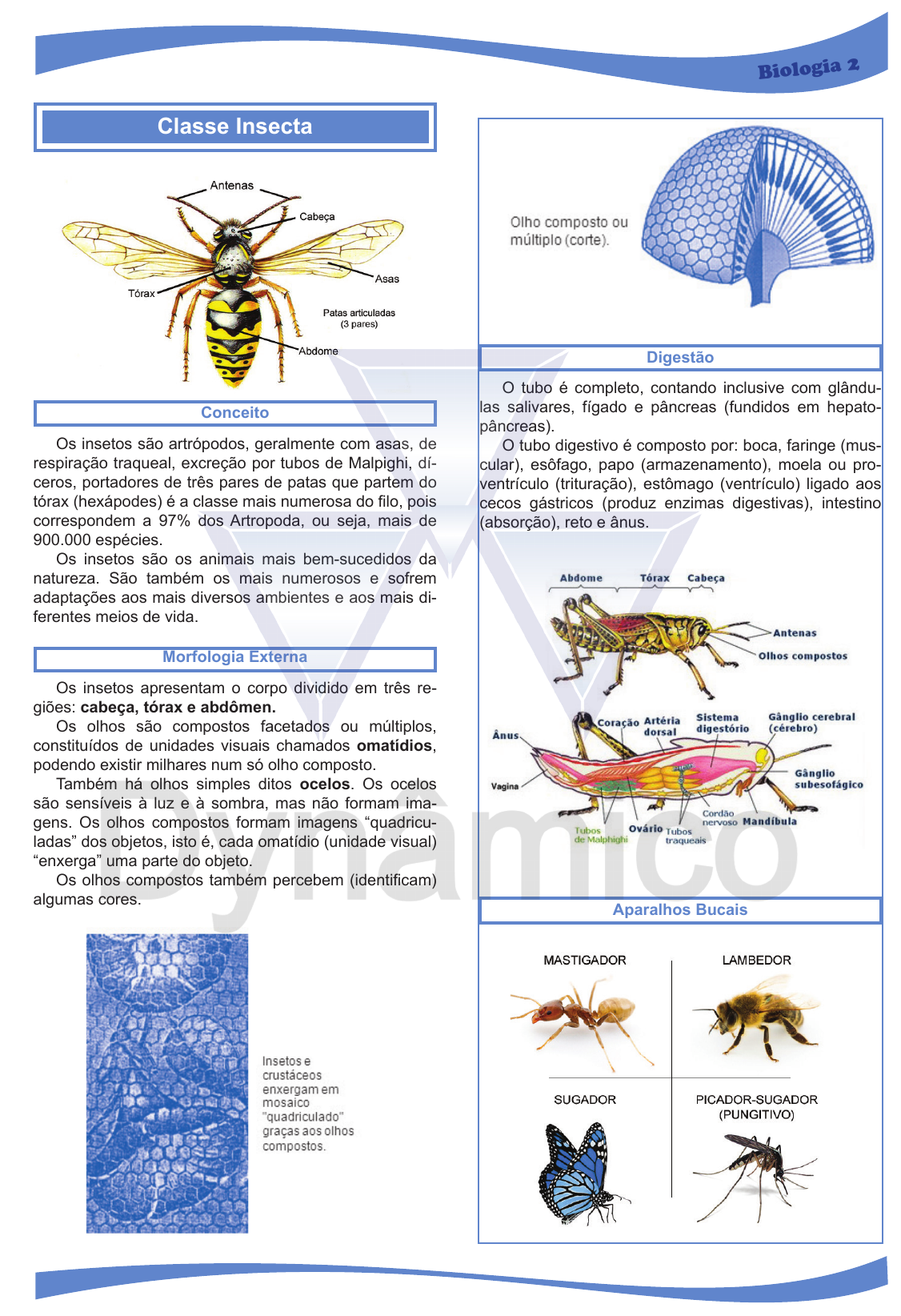 Biologia 2 Classe Insecta Conceito Os insetos são artrópodos, geralmente com asas, de respiração traqueal, excreção por tubos de Malpighi, dí- ceros, portadores de três pares de patas que partem do tórax (hexápodes) é a classe mais numerosa do filo, pois correspondem a 97% dos Artropoda, ou seja, mais de 900.000 espécies. Os insetos são os animais mais bem-sucedidos da natureza. São também os mais numerosos e sofrem adaptações aos mais diversos ambientes e aos mais di- ferentes meios de vida. Morfologia Externa Os insetos apresentam o corpo dividido em três re- giões: cabeça, tórax e abdômen. Os olhos são compostos facetados ou múltiplos, constituídos de unidades visuais chamados omatídios, podendo existir milhares num só olho composto. Também há olhos simples ditos ocelos. Os ocelos são sensíveis à luz e à sombra, mas não formam ima- gens. Os olhos compostos formam imagens “quadricu- ladas” dos objetos, isto é, cada omatídio (unidade visual) “enxerga” uma parte do objeto. Os olhos compostos também percebem (identificam) algumas cores. Digestão O tubo é completo, contando inclusive com glându- las salivares, fígado e pâncreas (fundidos em hepato- pâncreas). O tubo digestivo é composto por: boca, faringe (mus- cular), esôfago, papo (armazenamento), moela ou pro- ventrículo (trituração), estômago (ventrículo) ligado aos cecos gástricos (produz enzimas digestivas), intestino (absorção), reto e ânus. Aparalhos Bucais Biologia 2 Respiração O sistema respiratório dos insetos é do tipo tra- queal. Na parede do corpo (tórax e abdômen) existem ori- fícios, denominados estigmas, ligados a tubos, tra- quéias, muito ramificados e que chegam até as proxi- midades de cada célula do corpo por meio das traquéias e traqueíolas (ramificações finíssimas das traquéias). Alguns insetos possuem sacos aéreos (gafanhotos) - dilatações das traquéias, que servem como reservatório de ar. O ar atmosférico em oxigênio, atinge todas as célu- las do corpo e o gás carbônico por elas produzido se di- funde para o meio ambiente. As traquéias dos insetos A) Troncos grandes e ramos. B) Parede celular de um tubo traqueal e seu filamento espiralado. C) Ramos terminais ao redor de fibras musculares. D) Traqueíolas finas distribuídas sobre fibras musculares. Circulação O sistema circulatório dos insetos é do tipo aberto ou lacunar; o coração é dorsal, mandando sangue (também chamado hemolinfa) às lacunas entre os órgãos. A grande diferença entre o sistema circulatório dos insetos e crustáceos é que nos primeiros não existem pigmentos respiratórios, tais como ao hemocianina pre- sente nos crustáceos. A função do sistema circulatório é transportar ali- mentos e substâncias respiratórias. Portanto, nos inse- tos, o sistema respiratório não está associado ao circulatório, como acontece em outros animais, inclusi- ve em outros artrópodes. Excreção A eliminação das excreções que circulam no san- gue dos insetos é feita através de estruturas filiformes, os túbulos de Malpighi. Estes túbulos estão mergulha- dos na cavidade corporal, em contato com o sangue, de onde removem as excreções (ácido úrico, uréia, sais). Seus dutos excretores desembocam no intestino, onde os produtos de excreção são lançados e sendo então, eliminados com as fezes. Coordenação O sistema nervoso, muito semelhante ao dos anelí- deos, é constituído por gânglios cerebróides e uma ca- deia ganglionar ventral (hiponeuros). Reprodução Os insetos são organismos dióicos. O macho e a fê- mea podem geralmente, ser distinguidos externamente, ou seja, apresentam dimorfismo sexual evidente. A reprodução inicia-se com a cópula. O macho intro- duz o pênis na vagina da fêmea e ejacula, isto é, elimi- na seus espermatozóides. Estes vão até a espermate- ca, onde são armazenados temporariamente. Os óvulos produzidos pelos ovários descem pelos ovidutos e, ao passarem pela espermateca, são fecundados pelos es- permatozóides ali presentes, sendo eliminados em se- guida. A fecundação é, portanto, interna. Em alguns insetos, a porção terminal do abdômen da fêmea forma uma projeção, o ovopositor, que serve para perfurar o solo, frutas ou mesmo outros animais e aí introduzir seus ovos. O desenvolvimento dos ovos dos insetos pode ser direto ou indireto. Durante o desenvolvimento do ovo, a maioria dos insetos sofre metamorfose. Dependendo do grau de metamorfose, eles são classificados em três ti- pos: Ametábolos: Alguns insetos podem eclodir do ovo já com forma semelhante ao adulto. Ocorrem mudas sucessivas durante o seu desenvolvimento, o que é ne- cessário para que possam crescer, já que seu exoes- queleto quitinoso é rígido. Quando atingem o estágio adulto, as mudas cessam. Insetos deste tipo, em que o jovem é muito semelhante ao adulto, são denominados ametábolos (de a = “não” e de metabolé = “mudança”). Exemplo: traça (Lepisma sp.), que pertencente à ordem Thysanura. Biologia 2 Hemimetábolos: Outros insetos podem durante seu desenvolvimento, passar por mudanças graduais ou incompletas. Assim que saem do ovo, são chamados ninfas (sem asas e sem sistema reprodutor mas com olhos compostos), tendo alguma semelhança com o adulto. Com as sucessivas mudas, o jovem vai sofren- do uma metamorfose incompleta que culmina com a transformação no adulto, chamado imago. Insetos que sofrem metamorfose incompleta são chamados hemimetábolos (de hemi = “metade” e de metabolé = “mudança”). Obs: As ninfas aquáticas são ditas náiades, e as ninfas de gafanhoto, saltão. Holometábolos: Em outros insetos, do ovo eclode um pequeno organismo vermiforme com corpo segmen- tado, que pode ou não ter pernas, mas não tem olhos nem asas. Esta fase vermiforme é chamada larva (sem olhos compostos) e passa por sucessivas mudas, trans- formando-se em uma pupa. A pupa difere da larva por apresentar