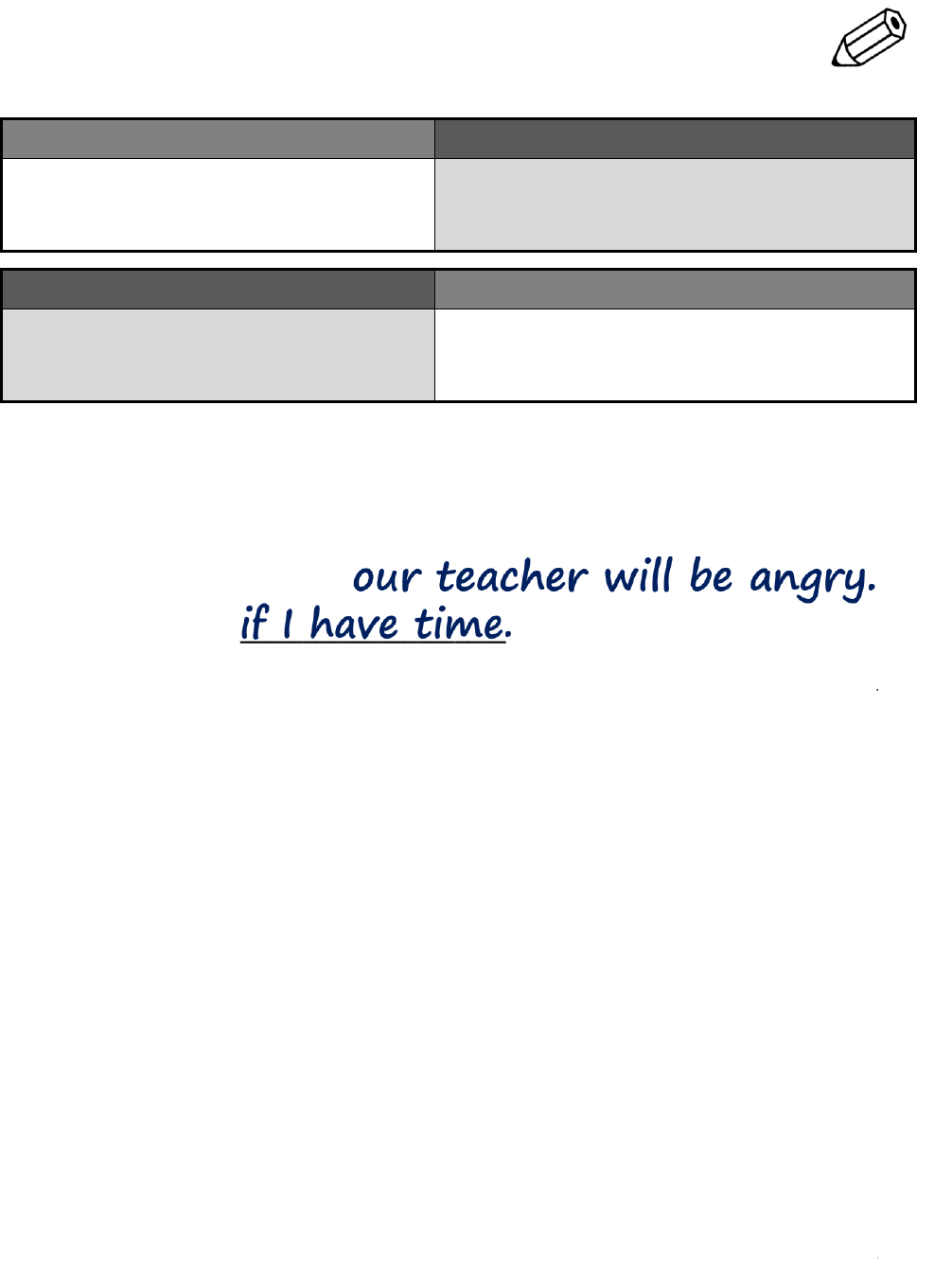 NAME: ________________________ DATE: ________________________ GRAMMAR WORKSHEET FIRST CONDITIONAL “if” clause main clause If it rains, … … he will bring his umbrella. … he won’t play outside. main clause “if” clause He will bring his umbrella… He won’t play outside … … if it rains. The first conditional is used to talk about things that may possibly happen in the future. Complete the sentences below by making First Conditional statements. Use your imagination! 1. If we don’t arrive on time, ______________________________________________ 2. I will watch TV _____________________________________________________ 3. If he gets up at 5 o’clock, ______________________________________________ 4. We will be hungry ___________________________________________________ 5. If the phone rings, ___________________________________________________ 6. I will laugh ________________________________________________________ 7. If our exam isn’t tomorrow, _____________________________________________ 8. They won’t buy a new car _____________________________________________ 9. If you hit me, ______________________________________________________ 10. I’ll give you ten dollars _______________________________________________ 11. If he doesn’t take a bus, ______________________________________________ 12. The glass will break __________________________________________________ 13. If I don’t watch that movie _____________________________________________ 14. My boss will get angry ________________________________________________ 15. If the weather is nice tomorrow, ________________________________________ Permission granted to reproduce for classroom use. © www.allthingsgrammar.com GRAMMAR WORKSHEET ALL Things Grammar Grammar Focus First Conditional Level Intermediate ANSWER KEY Answers will vary. Below are some possible answers. 1. If we don’t arrive on time, our teacher will be angry. 2. I will watch TV if I have time. 3. If he gets up at 5 o’clock, he will be tired. 4. We will be hungry if we don’t eat. 5. If the phone rings, I will answer it. 6. I will laugh if you tell me a funny story. 7. If our exam isn’t tomorrow, it will be on Monday. 8. They won’t buy a new car if they don’t save any money. 9. If you hit me, I will cry. 10. I’ll give you ten dollars if you help me. 11. If he doesn’t take a bus, he’ll take a train. 12. The glass will break if you drop it. 13. If I don’t watch that movie, I’ll read a book. 14. My boss will get angry if I don’t do my work. 15. If the weather is nice tomorrow, I’ll go to the beach. Grades as percentages 15 / 15 = 100% 14 / 15 = 93 13 / 15 = 87 12 / 15 = 80 11 / 15 = 73 10 / 15 = 67 9 / 15 = 60 8 / 15 = 53 7 / 15 = 47 6 / 15 = 40 5 / 15 = 33 4 / 15 = 27 3 / 15 = 20 2 / 15 = 13 1 / 15 = 7 0 / 18 = 0% Permission granted to reproduce for classroom use. © www.allthingsgrammar.com