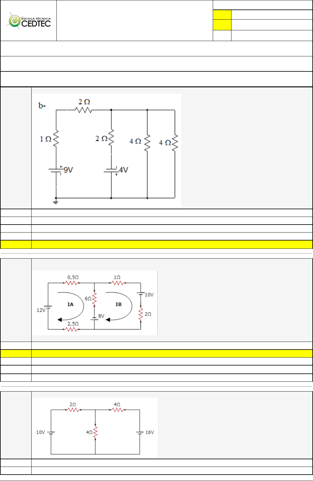 Pincel Atômico - 19/03/2022 09:34:23 1/2 Exercício Caminho do Conhecimento - Etapa 49 (15923) Atividade finalizada em 09/03/2022 15:27:02 (tentativa: 1) LEGENDA Resposta correta na questão # Resposta correta - Questão Anulada X Resposta selecionada pelo Aluno Disciplina: ELETRICIDADE [capítulos - 106] - Avaliação com 4 questões, com o peso total de 4,33 pontos Turma: Curso Técnico: Automação Industrial - Grupo: EAD - FEVEREIRO/22 - EAD AUT [64778] Aluno(a): 91279116 - JOÃO GUILHERME NEVES RIBEIRO - Respondeu 3 questões corretas, obtendo um total de 3,25 pontos como nota Questão 001 Determine as correntes em todos os ramos dos circuitos abaixo, com uso da LKC. 0,350 [A]; 2,750 [A]; 2,375 [A] e 2,450 [A] 0,350 [A]; 2,250 [A]; 2,375 [A] e 2,000 [A] 0,250 [A]; 4,000 [A]; 2,250 [A] e 0,188 [A] 1,350 [A]; 3,000 [A]; 0,870 [A] e 0,188 [A] X -2,750 [A]; 2,375 [A]; 0,188 [A] e 0,188 [A] Questão 002 Determine IA e IB com uso da LKT, no circuito abaixo: IA = 2,000 [A] e IB = 1,600 [A] IA = 1,600 [A] e IB = 0,933 [A] IA = 0,933 [A] e IB = 1,600 [A] X IA = 1,600 [A] e IB = 1,600 [A] IA = 0,833 [A] e IB = 1,700 [A] Questão 003 Determine, com o uso da LKC, as correntes em todos os ramos dos circuitos abaixo: 1,45 [A], 2,56 [A] e 3,45 [A] 2,25 [A], 0,75 [A] e 0,50 [A] Pincel Atômico - 19/03/2022 09:34:23 2/2 0,50 [A], 2,00 [A] e 3,00[A] X 0,50 [A], 2,25 [A] e 1,75 [A] 0,75 [A], 2,00 [A] e 3,00 [A] Questão 004 No circuito abaixo, o gerador e o receptor são ideais e as correntes têm os sentidos indicados. Se a intensidade da corrente i1 é 5 [A], então o valor da resistência do resistor R é: 8 [Ω] 6 [Ω] X 5 [Ω] 4 [Ω] 3 [Ω]