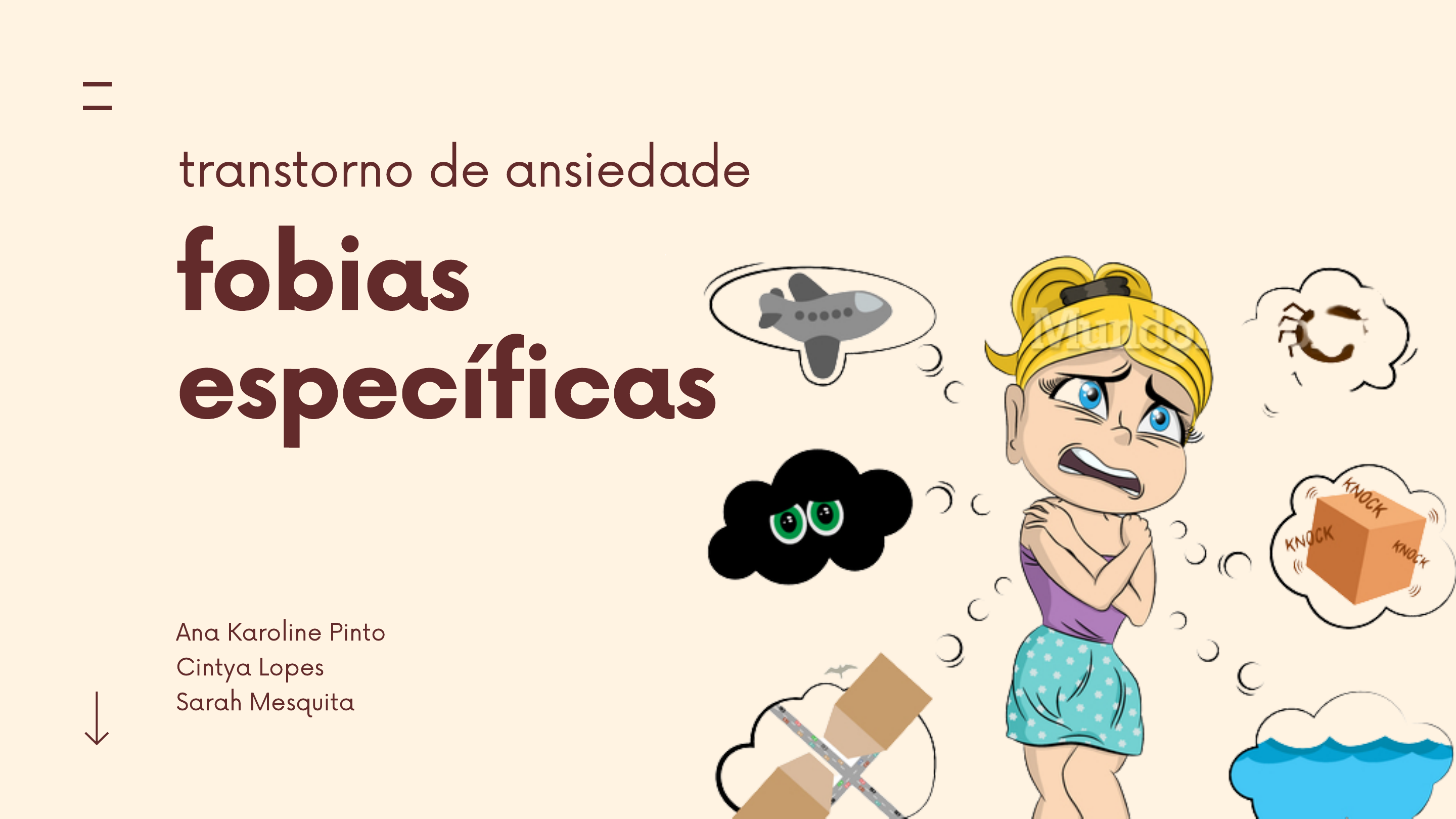 fobias específicas transtorno de ansiedade Ana Karoline Pinto Cintya Lopes Sarah Mesquita o que você sente ao ver essas imagens? características Depende do estímulo fóbico que causa sofrimento ao cliente é caracterizada pelo medo ou ansiedade é desproporcional em relação ao perigo real apresentado pelo objeto (ex: animais) ou situação (ex: ambientes fechados) ou mais intenso do que é considerado necessário. São divididas em subgrupos: fobias de animais, ambientes naturais (altura, tempestades e água), sangue e ferimentos e fobias situacionais (aviões, elevadores, locais fechados etc.) Quadro clínico é caracterizado por medo, ansiedade e esquiva daquele objeto ou situação que causa sofrimento a pessoa DSM-5, 2014 características geralmente se desenvolve no inicio da infância (entre 7 e 11 anos) após evento traumático; por observação de outras pessoas que passam por um evento traumático; por um ataque de pânico inesperado na situação a ser temida ; por transmissão de informações DSM-5, 2014 características se não for devidamente diagnosticada e tratada leva a um sofrimento continuo do cliente, ao qual o mesmo muda de forma consciente, hábitos e comportamentos com o objetivo de evitar ou diminuir o contato com aquele estimulo fóbico: Esquiva ativa. Ex: Pessoas com medo de sangue quer evitam ir ao médico. Genéticos e fisiológicos. Ambientais; Temperamentais; fatores de risco DSM-5, 2014 exemplos o Acrofobia: medo de altura; o Claustrofobia: fobia de lugares fechados; o Zoofobia: medo de animais peçonhentos e outros; o Amaxofobia: medo de dirigir; o Aerofobia: medo de avião/medo de voar; o Tripofobia: medo de padrões geométricos; o Aracnofobia: medo de aranhas; o Catastrofobia: medo de catástrofes e aspectos ambientais; o Glossofobia: medo de falar em público; o Hematofobia: medo de sangue, injeções e feridas; o Monofobia: medo de ficar sozinho; o Nictofobia: medo da noite ou do escuro; o Tanatofobia: medo da morte. tratamento Terapia comportamental: dessensibilização sistemática (terapia de exposição); benzodiazepínicos (p. ex., lorazepam 0,5 a 1,0 mg por via oral) ou betabloqueadores (o propranolol costuma ser preferido — 10 a 40 mg por via oral), idealmente cerca de 1 a 2 h antes da exposição. Tratamento farmacológico: De duração curta, com: Manual MDS, 2020 práticas integrativas e complementares arteterapia é prática expressiva artística, visual; atua como elemento terapêutico na análise do consciente e do inconsciente e busca interligar os universos interno e externo do indivíduo; utiliza a simbologia, favorecendo a saúde física e mental; foco no processo criativo, no fazer, na arte como recurso terapêutico. utiliza pintura, colagem, modelagem, poesia, dança, fotografia, tecelagem, expressão corporal, teatro, sons, músicas ou criação de personagens práticas integrativas e complementares hipnoterapia Conjunto de técnicas que, por meio de intenso relaxamento, concentração e/ou foco, induz a pessoa a alcançar um estado de consciência aumentado que permita alterar uma ampla gama de condições ou comportamentos indesejados,recupera o equilíbrio e a harmonia do organismo visando à promoção da saúde física e mental, ao bem-estar e à higiene; Pode favorecer o autoconhecimento. práticas integrativas e complementares yoga Prática corporal e mental; utiliza técnicas especificas para controlar corpo e mente, associada à meditação (hatha-yoga, mantra-yoga, laya-yoga); trabalha aspectos físico, mental, emocional, energético e espiritual; benefícios: redução do estresse, a regulação do sistema nervoso e respiratório, o equilíbrio do sono, o aumento da vitalidade psicofísica, o equilíbrio da produção hormonal, o fortalecimento do sistema imunológico, o aumento da capacidade de concentração e de criatividade e a promoção da reeducação mental com consequente melhoria dos quadros de humor, o que reverbera na qualidade de vida dos praticantes. cuidados de enfermagem utilizar abordagem calma e tranquilizadora; permanecer com o paciente para promover segurança e diminuir o medo encorajar a família a permanecer com o paciente escutar o paciente com atenção encorajar a expressão de sentimentos, percepções e medos identificar mudanças do nível de ansiedade oferecer atividades de diversão voltadas à redução da tensão ajudar o paciente a identificar situações que precipitem a ansiedade OLIVEIRA, 2020. referências BARNHILL, W. John. Transtornos fóbicos específicos. Manual MDS Para Profissionais da Saúde, 2020. Disponível em https://www.msdmanuals.com/pt-br/profissional/transtornos-psiqui%C3%A1tricos/ansiedade-e-transtornos-relacionados-a- estressores/transtornos-f%C3%B3bicos-espec%C3%Adficos. Acesso em: 13 de setem de 2021. Manual diagnóstico e estatístico de transtornos mentais[recurso eletrônico] : DSM-5 / [American Psychiatric Association ; tradução: Maria Inês Corrêa Nascimento... et al.] ; revisão técnica: Aristides VolpatoCordioli ...[et al.]. – 5. ed. – Dados eletrônicos. – Porto Alegre: Artmed, 2014. BEZERRA, Rosana Mendes. BRANDÃO, Mariana Carvalho. CARVALHO, Tânia Lorrany Alves. Práticas Integrativas e Complementares no tratamento da ansiedade: Competências e desafios do enfermeiro.TCC em Enfermagem. – Centro Universitário de Anápolis., Goiás. P. 38. 2019. Disponível em: http://repositorio.aee.edu.br/handle/aee/8528. Acesso em: 9 de setembro de 2021. BRASIL. Ministério da Saúde. Práticas Integrativas e Complementares (PICS): quais são e para que servem. Brasília: Ministério da Saúde. Disponível em: https://antigo.saude.gov.br/saude-de-a-z/praticas-integrativas-e-complementares. Acesso em: 9 de setembro de 2021. GUIMARÃES, A. M. V., SILVA, Neto, A. C. da, Vilar, A. T. S., Almeida, B. G. da C., Fermoseli, A. F. de O., & Albuquerque, C. M. F. de. (2015). TRANSTORNOS DE ANSIEDADE: UM ESTUDO DE PREVALÊNCIA SOBRE AS FOBIAS ESPECÍFICAS E A I