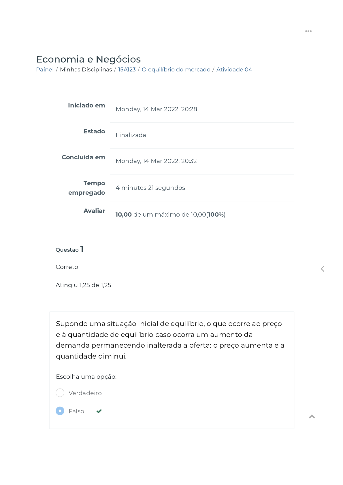 14/03/2022 18:33 Atividade 04 https://ava.politecnicabr.com.br/mod/quiz/review.php?attempt=2753724 1/5 Painel / Minhas Disciplinas / 15A123 / O equilíbrio do mercado / Atividade 04 Economia e Negócios Iniciado em Monday, 14 Mar 2022, 20:28 Estado Finalizada Concluída em Monday, 14 Mar 2022, 20:32 Tempo empregado 4 minutos 21 segundos Avaliar 10,00 de um máximo de 10,00(100%) Questão 1 Correto Atingiu 1,25 de 1,25 Supondo uma situação inicial de equilíbrio, o que ocorre ao preço e à quantidade de equilíbrio caso ocorra um aumento da demanda permanecendo inalterada a oferta: o preço aumenta e a quantidade diminui. Escolha uma opção: Verdadeiro Falso https://ava.politecnicabr.com.br/my/ https://ava.politecnicabr.com.br/course/view.php?id=882 https://ava.politecnicabr.com.br/course/view.php?id=882#section-5 https://ava.politecnicabr.com.br/mod/quiz/view.php?id=23958 https://ava.politecnicabr.com.br/ 14/03/2022 18:33 Atividade 04 https://ava.politecnicabr.com.br/mod/quiz/review.php?attempt=2753724 2/5 Questão 2 Correto Atingiu 1,25 de 1,25 Uma situação em que o preço situe-se acima do preço de equilíbrio retrata: equilíbrio. Escolha uma opção: Questão 3 Correto Atingiu 1,25 de 1,25 O preço de equilíbrio é formado pelo próprio mercado, por meio do livre jogo e interação ente as forças de oferta e de demanda. Escolha uma opção: Verdadeiro Falso Verdadeiro Falso https://ava.politecnicabr.com.br/ 14/03/2022 18:33 Atividade 04 https://ava.politecnicabr.com.br/mod/quiz/review.php?attempt=2753724 3/5 Questão 4 Correto Atingiu 1,25 de 1,25 O preço de equilíbrio determina: a igualdade entre quantidade demandada e quantidade ofertada. Escolha uma opção: Questão 5 Correto Atingiu 1,25 de 1,25 Como um ato contínuo, a oferta de mercado é representada pelas várias quantidades de um determinado bem ou serviço que os produtores querem e podem colocar no mercado, a diversos preços alternativos, em um determinado período de tempo, permanecendo tudo o mais constante. Escolha uma opção: Verdadeiro Falso Verdadeiro Falso https://ava.politecnicabr.com.br/ 14/03/2022 18:33 Atividade 04 https://ava.politecnicabr.com.br/mod/quiz/review.php?attempt=2753724 4/5 Questão 6 Correto Atingiu 1,25 de 1,25 É verdade que a relação inversa entre preço e quantidade demandada e a relação direta entre preço e quantidade ofertada evidenciam o impasse e o con�ito existentes entre as forças de oferta e de demanda. Escolha uma opção: Questão 7 Correto Atingiu 1,25 de 1,25 A demanda de mercado é representada pelas várias quantidades de um determinado bem ou serviço que os consumidores querem e podem adquirir, a diversos preços alternativos, em um determinado período de tempo, permanecendo tudo o mais constante (ceteris paribus). Escolha uma opção: Verdadeiro Falso Verdadeiro Falso https://ava.politecnicabr.com.br/ 14/03/2022 18:33 Atividade 04 https://ava.politecnicabr.com.br/mod/quiz/review.php?attempt=2753724 5/5 © 2020 - Escola Politécnica Brasileira Questão 8 Correto Atingiu 1,25 de 1,25 O preço de equilíbrio é o preço que determina a igualdade entre quantidade ofertada e quantidade demandada. Escolha uma opção: Verdadeiro Falso Entre em Contato https://www.politecnicabr.com.br 0800 084 2627 indisponível devido a pandemia de COVID-19, use outro canal! 0800 084 2627 comercial@politecnicabr.com.br Links Úteis Dicas da nossa Diretora Acadêmica Planner de Estudos Declaração de Matrícula Orientações do AVA Abertura de Ticket Fale com o Tutor Cronograma de Estudos Manual de Estágio Manual de Competência Siga-nos nas redes sociais https://ava.politecnicabr.com.br/mod/quiz/0 https://www.politecnicabr.com.br/ mailto:comercial@politecnicabr.com.br https://soundcloud.com/user-501638417/sets/escola-politecnica-brasileira https://storage.googleapis.com/sirius-pubstore/semestre_plannerdeestudo%20poli.pdf https://storage.googleapis.com/sirius-pubstore/declaracao_matricula.pdf https://storage.googleapis.com/sirius-pubstore/orientacoes_ava.pdf https://storage.googleapis.com/sirius-pubstore/abertura_ticket.pdf https://storage.googleapis.com/sirius-pubstore/fale_com_tutor.pdf https://storage.googleapis.com/sirius-pubstore/cronograma_estudos.pdf https://storage.googleapis.com/sirius-pubstore/manual_estagio.pdf https://storage.googleapis.com/sirius-pubstore/manual_competencia.pdf https://www.facebook.com/politecnicabr https://www.instagram.com/politecnicabr_oficial https://ava.politecnicabr.com.br/