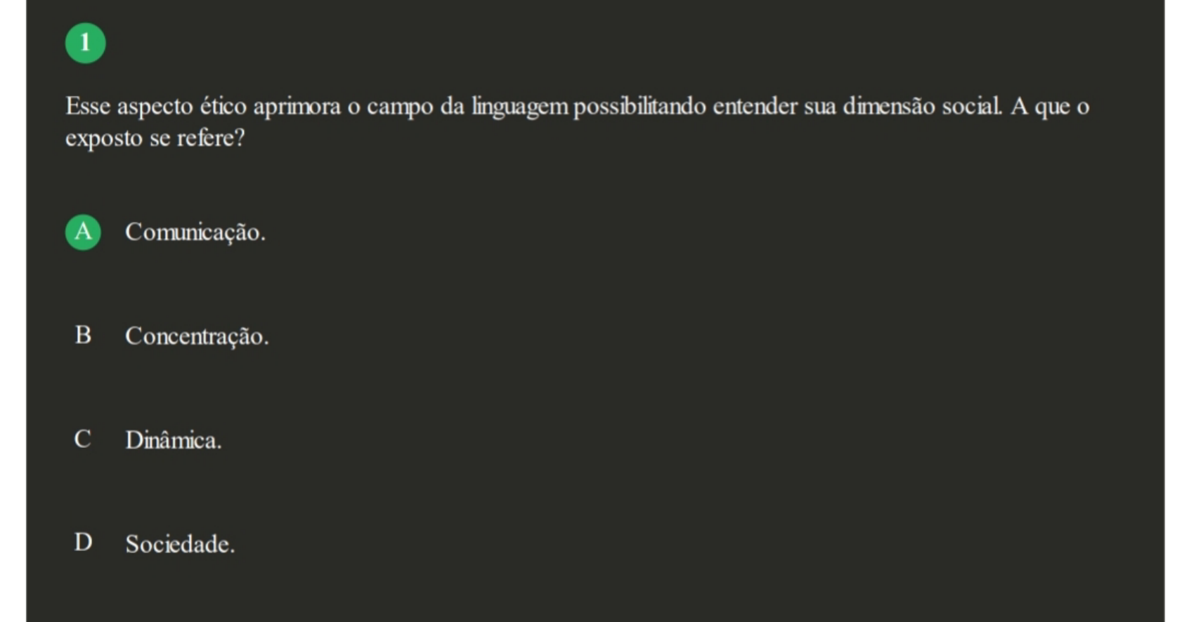 Esse aspecto ético aprimora o campo da linguagem possibilitando entender sua dimensão social. A que o exposto se refere? A) Comunicação. B) Dinâm...