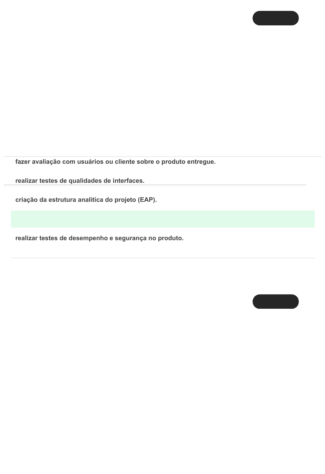Ocultar opções de resposta Comentários Pergunta 1 -- /0 A partir do momento em que se entende o que é qualidade, a Software Quality Assurance (SQA) deve criar um Plano de Garantia da Qualidade de Software para definir as estratégias de uma equipe de software, a fim de garantir de qualidade de software. Fonte: PRESSMAN, R. S. Engenharia de Software: Uma abordagem Profissional. 7.ed Porto Alegre: McGraw-Hill, 2011. Considerando essas informações e o conteúdo estudado relacionado às funções da garantia de qualidade de software, é correto afirmar que é uma dessas funções: fazer avaliação com usuários ou cliente sobre o produto entregue. realizar testes de qualidades de interfaces. criação da estrutura analítica do projeto (EAP). Resposta corretaverificar se os processos de teste, inspeção e auditoria estão sendo executados. realizar testes de desempenho e segurança no produto. Pergunta 2 -- /0 As vantagens de uma equipe de desenvolvimento de software prezar pela qualidade em todas as atividades do desenvolvimento são diminuição do retrabalho; redução da quantidade de reformulações e consequentemente, queda no custo e no tempo para se produzir um software. A Software Quality Assurance (SQA) lida com os processos de desenvolvimento do software que envolve algumas atividades definidas por Pressman, (2011). Fonte: PRESSMAN, R. S. Engenharia de Software: Uma abordagem Profissional. 7.ed Porto Alegre: McGraw-Hill, 2011. Considerando essas informações e o conteúdo estudado, analise as afirmativas a seguir e assinale V para a(s) verdadeira(s) e F para a(s) falsa(s). Ocultar opções de resposta Ocultar opções de resposta I. ( ) Padrões: podem ser adotados por uma organização de engenharia de software ou impostos pelo cliente. II. ( ) Auditorias: é um tipo de revisão efetuado pelo pessoal de SQA com o intuito de assegurar-se de que as diretrizes de qualidade estejam sendo seguidas. III. ( ) Testes: O papel da SQA é garantir que eles sejam planejados e conduzidos de modo que se tenha a maior probabilidade de alcançar seu objetivo. IV. ( ) Qualidade em uso: são definidas a aferição da qualidade na visão do usuário e a facilidade de uso e operação do sistema. Agora assinale a alternativa que apresenta a sequência correta: Resposta corretaV, V, V, F. V, F, V, F. V, V, V, V. V, V, F, F. F, V, V, F. Pergunta 3 -- /0 O controle de qualidade engloba um conjunto de ações da engenharia de software que ajudam a garantir que cada produto resultante de um processo atinja suas metas de qualidade. PRESSMAN (2011) afirma que, para fazer o controle da qualidade, ele deve envolver algumas atividades. Fonte: PRESSMAN, R. S. Engenharia de Software: Uma abordagem Profissional. 7.ed Porto Alegre: McGraw-Hill, 2011. Considerando essas informações e o conteúdo estudado sobre essas atividades definidas pelo autor, pode- se afirmar que: Ocultar opções de resposta Resposta corretauma atividade é realizar teste de software para verificar se os dados de entradas correspondem aos resultados esperados pelos usuários finais. uma atividade é checar se os processos estão sendo executados e melhorados. uma atividade é realizar revisões técnicas, que são realizadas pelo cliente do software com intuito de revelar erros. uma atividade é a aplicação das políticas e procedimentos para garantir que os processos atendam a qualidade. uma atividade é fazer o controle da qualidade do software após a entrega do software ao cliente, que realizará os testes no ambiente de produção. Pergunta 4 -- /0 Segundo Pressman (2011), na qualidade do software, há as atividades de: inspeções, revisões e testes utilizados ao longo do processo de software, para verificar que cada produto satisfaz os requisitos estabelecidos, são atividades que compõem qual conceito seguir. Fonte: PRESSMAN, R. S. Engenharia de Software: Uma abordagem Profissional. 7.ed Porto Alegre: McGraw-Hill, 2011. Considerando essas informações e o conteúdo estudado sobre garantia de qualidade, assinale a alternativa correta referente a atividades que compõem a qualidade de software: reengenharia de processos. garantia de qualidade. Resposta corretacontrole de qualidade. project management institute (PMI). custo da qualidade. Ocultar opções de resposta Pergunta 5 -- /0 O Processo Unificado foi proposto por Booch, Jacobson e Rumbaugh em 1999. Essas três pessoas juntaram o conhecimento que adquiriram durante 30 anos no desenvolvimento de softwares e criaram o Processo Unificado. O seu desenvolvimento foi apoiado nas áreas de conhecimento e fases do PMBOK (Project Management Body of Knowledge). Fonte: GRADY, B. UML: guia do usuário. 1 e 2 ed. Rio de Janeiro: Elsevier, 2005. Considerando essas informações e o conteúdo estudado sobre a qualidade de software no Processo Unificado, pode-se afirmar que: a qualidade é tratada dentro da disciplina ambiente e requisitos. a qualidade é tratada dentro da disciplina modelagem de negócios. a qualidade é tratada dentro da disciplina requisitos. Resposta correta a qualidade é tratada dentro da disciplina gerenciamento de projetos e configuração e mudanças. a qualidade é tratada dentro da área do conhecimento chamada gestão de qualidade. Pergunta 6 -- /0 Apesar dos modelos aplicados na engenharia de software para garantir a qualidade, o principal objetivo de qualidade de um software é garantir um produto final satisfaça as expectativas do cliente dentro daquilo que foi acordado inicialmente e detalhado no levantamento dos requisitos. Considerando essas informações e o conteúdo estudado sobre controle de qualidade de um projeto de software, analise as afirmativas a seguir: I. O Controle de qualidade deve ser realizado antes da entrega ao cliente. Ocultar opções de resposta Ocultar opções de resposta II. O Controle de qualidade deve ser realizado em todas as fases do ciclo de vida de um software. III. O Controle de qualidade deve ser realizado em pro