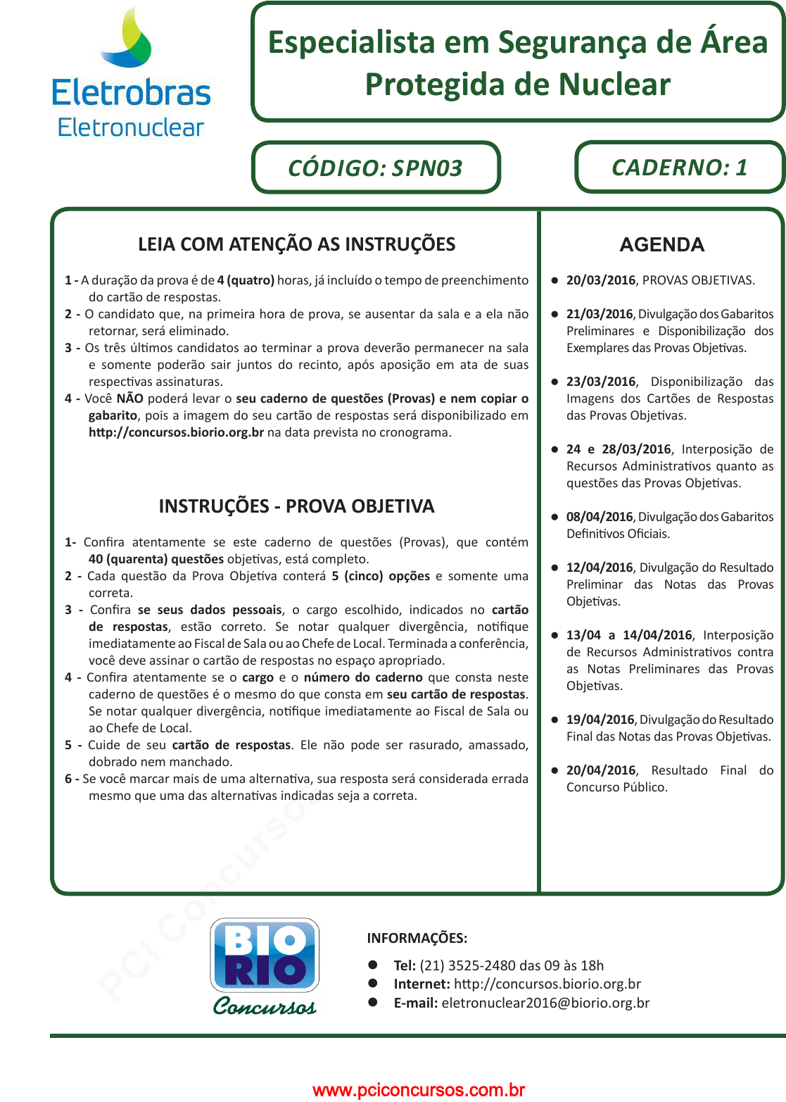 pcimarkpci MDAwMDowMDAwOjAwMDA6MDAwMDowMDAwOmZmZmY6YmFjMTpmMGRi:VGh1LCAyMCBKYW4gMjAyMiAwMTozNjo1MyAtMDMwMA== LEIA COM ATENÇÃO AS INSTRUÇÕES 1 - A duração da prova é de 4 (quatro) horas, já incluído o tempo de preenchimento do cartão de respostas. 2 - O candidato que, na primeira hora de prova, se ausentar da sala e a ela não retornar, será eliminado. 3 - Os três últimos candidatos ao terminar a prova deverão permanecer na sala e somente poderão sair juntos do recinto, após aposição em ata de suas respectivas assinaturas. 4 - Você NÃO poderá levar o seu caderno de questões (Provas) e nem copiar o gabarito, pois a imagem do seu cartão de respostas será disponibilizado em http://concursos.biorio.org.br na data prevista no cronograma. INSTRUÇÕES - PROVA OBJETIVA 1- Confira atentamente se este caderno de questões (Provas), que contém 40 (quarenta) questões objetivas, está completo. 2 - Cada questão da Prova Objetiva conterá 5 (cinco) opções e somente uma correta. 3 - Confira se seus dados pessoais, o cargo escolhido, indicados no cartão de respostas, estão correto. Se notar qualquer divergência, notifique imediatamente ao Fiscal de Sala ou ao Chefe de Local. Terminada a conferência, você deve assinar o cartão de respostas no espaço apropriado. 4 - Confira atentamente se o cargo e o número do caderno que consta neste caderno de questões é o mesmo do que consta em seu cartão de respostas. Se notar qualquer divergência, notifique imediatamente ao Fiscal de Sala ou ao Chefe de Local. 5 - Cuide de seu cartão de respostas. Ele não pode ser rasurado, amassado, dobrado nem manchado. 6 - Se você marcar mais de uma alternativa, sua resposta será considerada errada mesmo que uma das alternativas indicadas seja a correta. AGENDA l 20/03/2016, PROVAS OBJETIVAS. l 21/03/2016, Divulgação dos Gabaritos Preliminares e Disponibilização dos Exemplares das Provas Objetivas. l 23/03/2016, Disponibilização das Imagens dos Cartões de Respostas das Provas Objetivas. l 24 e 28/03/2016, Interposição de Recursos Administrativos quanto as questões das Provas Objetivas. l 08/04/2016, Divulgação dos Gabaritos Definitivos Oficiais. l 12/04/2016, Divulgação do Resultado Preliminar das Notas das Provas Objetivas. l 13/04 a 14/04/2016, Interposição de Recursos Administrativos contra as Notas Preliminares das Provas Objetivas. l 19/04/2016, Divulgação do Resultado Final das Notas das Provas Objetivas. l 20/04/2016, Resultado Final do Concurso Público. CADERNO: 1 Especialista em Segurança de Área Protegida de Nuclear INFORMAÇÕES: l Tel: (21) 3525-2480 das 09 às 18h l Internet: http://concursos.biorio.org.br l E-mail: eletronuclear2016@biorio.org.br CÓDIGO: SPN03 www.pciconcursos.com.br pcimarkpci MDAwMDowMDAwOjAwMDA6MDAwMDowMDAwOmZmZmY6YmFjMTpmMGRi:VGh1LCAyMCBKYW4gMjAyMiAwMTozNjo1MyAtMDMwMA== www.pciconcursos.com.br pcimarkpci MDAwMDowMDAwOjAwMDA6MDAwMDowMDAwOmZmZmY6YmFjMTpmMGRi:VGh1LCAyMCBKYW4gMjAyMiAwMTozNjo1MyAtMDMwMA== 3 SPN03 ESPECIALISTA EM SEGURANÇA DE ÁREA PROTEGIDA DE NUCLEAR CADERNO 1 LÍNGUA PORTUGUESA TEXTO I A INTERNET NOS DEIXA ESTÚPIDOS Eduardo Szklarz, Superinteressante, maio/2015 - Como a internet piora a inteligência dos jovens? Eu me refiro principalmente a quatro elementos: curiosidade intelectual, conhecimento histórico, consciência cívica e hábitos de leitura. Os jovens têm lido cada vez menos nos EUA. E estou dizendo livros, jornais e revistas, que ainda são o principal e o mais importante acesso ao conhecimento. - Mas a web não pode ser útil para o conhecimento? Poderia, mas os garotos não se importam com essas coisas. Eles não visitam um site de um grande museu para ver as pinturas. Preferem visitar seu perfil pessoal na internet ou fazer upload das fotos da última festa, ou escrever em seu blog como odeiam a escola. Segundo o Instituto Nielsen Media Research, 9 entre os 10 sites mais populares entre os adolescentes são redes de relacionamento. É isso que as ferramentas significam para eles: um meio social. QUESTÃO 1 O título dado ao texto: (A) serve como conclusão geral do que foi dito. (B) não mostra relação direta com as palavras da entrevista. (C) contraria as afirmações do texto. (D) significa uma ironia diante do que é afirmado. (E) explica as referências do texto. QUESTÃO 2 A pergunta inicial parte de um pressuposto, que é o de que a internet: (A) só é empregada pelos jovens alienados. (B) tem por finalidade prejudicar os mais jovens. (C) traz prejuízo para a inteligência dos mais jovens. (D) tira a atenção dos estudantes de coisas mais importantes. (E) diminui o prazer da leitura. QUESTÃO 3 O adjetivo abaixo que tem seu significado indicado erradamente é: (A) “curiosidade intelectual” / relativa à cultura. (B) “conhecimento histórico” / relativo à História. (C) “consciência cívica” / relativa aos cidadãos. (D) “grande museu” / relativo à qualidade artística. (E) “perfil pessoal” / relativo às pessoas. QUESTÃO 4 “Eu me refiro”; conjugando esse mesmo verbo com o pronome enclítico, a forma inadequada entre as que estão abaixo é: (A) refiro-me. (B) referes-te. (C) refere-se. (D) referimos-nos. (E) referem-se. QUESTÃO 5 Na primeira resposta dada pelo entrevistado, o problema destacado é: (A) a falta de curiosidade intelectual. (B) a despreocupação com o conhecimento histórico. (C) a ausência de consciência cívica. (D) a queda do valor da inteligência. (E) a diminuição do hábito de leitura. QUESTÃO 6 O segundo período desse segmento tem a finalidade de evitar que o leitor: (A) perceba com clareza a mensagem do entrevistado. (B) considere a afirmação especificamente para os livros. (C) restrinja a opinião a revistas e jornais. (D) desconsidere a importância do fato. (E) despreze a informação como desnecessária. QUESTÃO 7 Há uma série de palavras do texto grafadas em inglês; isso mostra que: (A) a cultura brasileira está dominada