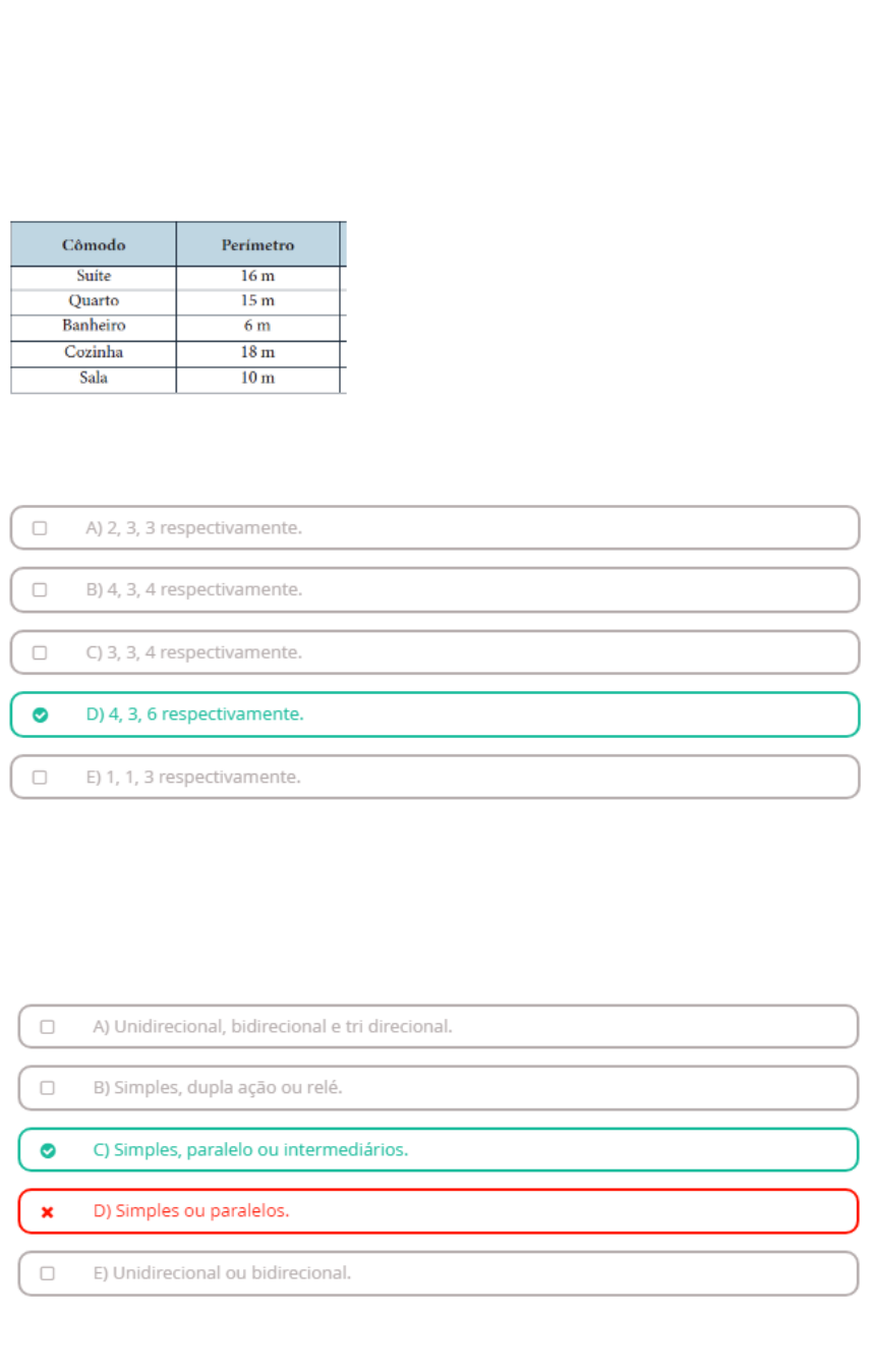 PROVA PRESENCIAL - 1º CHAMADA - INSTALAÇÕES ELÉTRICAS DE BAIXA TENSÃO Questão 1 É necessário realizar o dimensionamento elétrico com a quantidade mínima de TUGs em uma residência. O perímetro de cada cômodo está informado na Figura a seguir. Anexo - Consulte a imagem em melhor resolução no final do cadernos de questões. De acordo com a NBR5410 a quantidade mínima de tomadas na suíte, quarto e cozinha é respectivamente? Questão 2 Toda instalação elétrica tem alguns componentes básicos para dimensionar e utilizar. Os interruptores são elementos de acionamento elétrico, e é através deles que podemos ligar e desligar a iluminação residencial. Os interruptores podem ser do tipo ___________, dependendo do número de pontos de acionamento desejado. Questão 3 Em relação aos conceitos de luminotecnia, a potência de radiação emitida por uma fonte luminosa abrangendo todas as direções do espaço é definida como? Assinale a alternativa correta. Questão 4 A manutenção preventiva e corretiva em instalações elétricas de baixa tensão deve ser realizada de acordo com fatores provenientes da própria instalação, entre esses fatores podemos destacar quais características para cada tipo de manutenção? Assinale a alternativa correta. Questão 5 A NBR 5410, norma brasileira reguladora de instalações elétricas de baixa tensão, especifica a potência mínima para a iluminação residencial com base nas dimensões do cômodo. Imagine um quarto com as seguintes dimensões: 4 metros de largura e 3 metros de comprimento. Calcule a potência de iluminação com base na NBR 5410. Questão 6 Os eletrodutos são utilizados em obras de diversos tamanhos, desde residências até prédios de vários pavimentos. Assim, qual é a distância máxima que o eletroduto pode percorrer usando a seção nominal dimensionada sem a utilização de caixa de passagem? Assinale a alternativa correta: Questão 7 A Norma Regulamentadora (NR10) classifica o profissional dependendo de sua capacitação, qualificação, habilitação e autorização. Qual a classificação do profissional que recebe qualificação, capacitação e autorização da empresa para atuação? Assinale a alternativa correta. Questão 8 O conceito de padrão de entrada está relacionado ao conjunto de componentes que devem ser instalados conforme o tipo de fornecimento solicitado e a especificação das normas técnicas da concessionária local. A especificação dos componentes contidas na figura 1, refere-se a: Anexo - Consulte a imagem em melhor resolução no final do cadernos de questões. Assinale a alternativa que corresponde aos componentes ‘a’ e ‘b’ respectivamente. Questão 9 Todo o equipamento elétrico tem uma potência elétrica associada, medida em Watts. Essa potência (P) está associada diretamente ao produto da tensão pela corrente elétrica. Um secador de cabelo possui uma resistência de 100 Ohms e é alimentado em 127V. Qual o valor da potência aproximada consumida por esse equipamento? Questão 10 Refere-se a norma brasileira que dita os princípios básicos da segurança em atividades e instalações elétricas e tem como objetivo salvaguardar os trabalhadores e leigos contra riscos inerentes à energia elétrica. O escopo apresentado refere-se a normativa? Assinale a alternativa correta. Questão 11 O caminhamento do circuito de distribuição consiste nas etapas envolvidas entre a comunicação do padrão de entrada até o quadro de distribuição do consumidor final. O esquema desse caminhamento está ilustrado na figura a seguir. Anexo - Consulte a imagem em melhor resolução no final do cadernos de questões. Os itens numerados (1), (2), (3) correspondem respectivamente: Questão 12 Para um projeto elétrico de baixa tensão, o projetista determinou que seja realizado o esquemático proposto na figura a seguir. Ele está representado por meio de um diagrama unifilar, e o técnico questionou sobre a função desse esquema. Informe o que o esquemático da figura a seguir representa: Anexo - Consulte a imagem em melhor resolução no final do cadernos de questões. Assinale a alternativa correta: