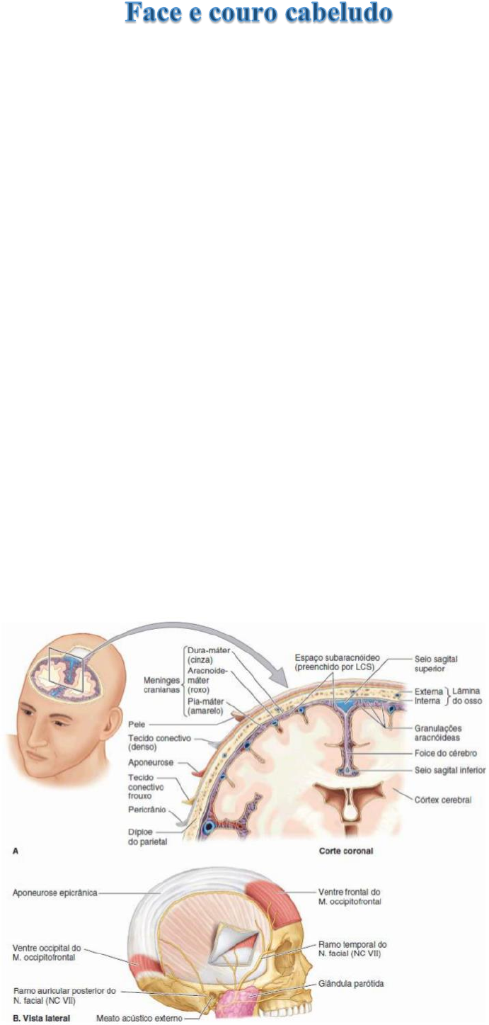 Fernanda Cardoso Vieira A face é a superfície anterior da cabeça, da fronte ao queixo e de uma orelha à outra. Os ossos da face crescem por mais tempo do que os da calvária. O crescimento do etmoide, das cavidades orbitais e das partes superiores das cavidades nasais está quase completo aos 7 anos de idade. A expansão das órbitas e o crescimento do septo nasal deslocam as maxilas em sentido inferoanterior. O couro cabeludo é formado por pele e tecido subcutâneo, que cobrem o neurocrânio desde as linhas nucais superiores no occipital até as margens supraorbitais do frontal. Lateralmente, o couro cabeludo estende-se sobre a fáscia temporal até os arcos zigomáticos. O couro cabeludo tem cinco camadas: Pele: fina, exceto na região occipital; contém muitas glândulas sudoríferas e sebáceas, além de folículos pilosos. A irrigação arterial é abundante e há boa drenagem venosa e linfática Tecido conectivo: forma a tela subcutânea espessa, densa e ricamente vascularizada, bem suprida por nervos cutâneos Aponeurose epicrânica: a lâmina tendínea larga e forte que cobre a calvária e é o local de fixação dos ventres musculares que convergem da fronte e do occipúcio (o músculo occipitofrontal) e dos temporais de cada lado (os músculos temporoparietal e auricular superior). Juntas, essas estruturas constituem o epicrânio musculoaponeurótico. Todas as partes do epicrânio (músculo e aponeurose) são inervadas pelo nervo facial Tecido conectivo frouxo: uma camada esponjosa contendo espaços virtuais, que podem ser distendidos por líquido em caso de lesão ou infecção. Essa camada permite o livre movimento do couro cabeludo propriamente dito sobre a calvária Pericrânio: uma camada densa de tecido conectivo que forma o periósteo externo do neurocrânio. Está firmemente fixado, mas pode ser arrancado com facilidade do crânio de pessoas vivas, exceto nos locais onde é contínuo com o tecido fibroso nas suturas do crânio Fernanda Cardoso Vieira MÚSCULOS DA FACE E DO COURO CABELUDO Os músculos da face movimentam a pele e modificam as expressões faciais para exprimir o humor, atuam mediante a tração da pele, desenvolvem-se a partir do mesoderma nos segundos arcos faríngeos. Os músculos do couro cabeludo, da fronte e dos supercílios. O músculo occipitofrontal e digástricos são planos, e seus ventres occipital e frontal têm um tendão comum, a aponeurose epicrânica. A contração independente do ventre occipital retrai o couro cabeludo e a contração do ventre frontal o protrai. Os ventres frontal e occipital agem sinergicamente, criando a aparência de surpresa. Os músculos da boca,dos lábios e das bochechas ativa ao sorrir, mantém a bochechas tensas, evitando seu pregueamento e lesão durante a mastigação. O músculo orbicular da boca + bucinador + língua, evitam o acúmulo de comida na boca. Ajuda no assopro e na sucção. A fáscia bucofaríngea sofre espessamento e forma a rafe pterigomandibular. * Músculos Elevadores, Afastadores e Eversores do lábio superior; * Músculos Depressores, Afastadores e Eversores do lábio inferior; * Músculos Orbicular da boca, o Esfíncter ao redor da boca; * Músculo Bucinador, na bochecha. Classificaçao dos músculos: Occipitofrontal Ventre frontal Origem: Aponeurose epicrânica Inserçao: Pele e tela subcutânea dos supercílios e da fronte Açao: Eleva os supercílios e enruga a pele da fronte, protrai o couro cabeludo (indicando surpresa ou curiosidade) Ventre occipital Origem: Dois terços laterais da linha nucal superior Inserçao: Aponeurose epicrânica Açao: Retrai o couro cabeludo, aumenta a eficácia do ventre frontal Orbicular do olho (esfíncter orbital) Origem: Margem orbital medial, ligamento palpebral medial, lacrimal Inserçao: Pele ao redor da margem da órbita, lâminas tarsais superior e inferior Açao: Fecha as pálpebras: a parte palpebral com suavidade e a parte orbital com firmeza (piscar) Corrugador do supercílio Origem: Extremidade medial do arco superciliar Inserçao: Pele superior ao meio da margem supraorbital e arco superciliar Açao: Leva o supercílio medial e inferiormente, criando rugas verticais acima do nariz (interesse ou preocupação) Fernanda Cardoso Vieira Prócero mais parte transversa do M. nasal Origem: Fáscia aponeurótica que cobre o osso nasal e a cartilagem nasal lateral Inserçao: Pele da fronte inferior, entre os supercílios Açao: Abaixa a extremidade medial do supercílio, enruga a pele sobre o dorso do nariz (exprimindo desdém ou aversão) Parte da asa do nariz mais M. levantador do lábio superior e asa do nariz Origem: Processo frontal da maxila Inserçao: Cartilagem alar maior Açao: Abaixa a asa lateralmente, dilatando a abertura nasal anterior (“alargando as narinas”) Orbicular da boca (esfíncter oral) Origem: Parte medial da maxila e mandíbula, face profunda da pele perioral, ângulo da boca Inserçao: Túnica mucosa dos lábios Açao: O tônus fecha a rima da boca, a contração fásica comprime e protrai os lábios (ao beijar) ou resiste à distensão (ao soprar) Levantador do lábio superior Origem: Margem infraorbital Inserçao: Pele do lábio superior Açao: Parte dos Mm. dilatadores da boca, retraem (elevam) ou evertem o lábio superior, aprofundam o sulco nasolabial (exprimindo tristeza) Zigomático menor Origem: Face anterior, zigomático Inserçao: Pele do lábio superior Açao: Parte dos Mm. dilatadores da boca, retraem (elevam) ou evertem o lábio superior, aprofundam o sulco nasolabial (exprimindo tristeza) Bucinador (músculo da bochecha) Origem: Mandíbula, processos alveolares da maxila e mandíbula, rafe pterigomandibular Inserçao: Ângulo da boca, orbicular da boca Açao: Pressiona a bochecha contra os dentes molares, atua com a língua para manter o alimento entre as faces oclusais e fora do vestíbulo da boca, resiste à distensão (ao soprar) Zigomático maior Origem: Face lateral do zigomático Inserçao: Ângulo