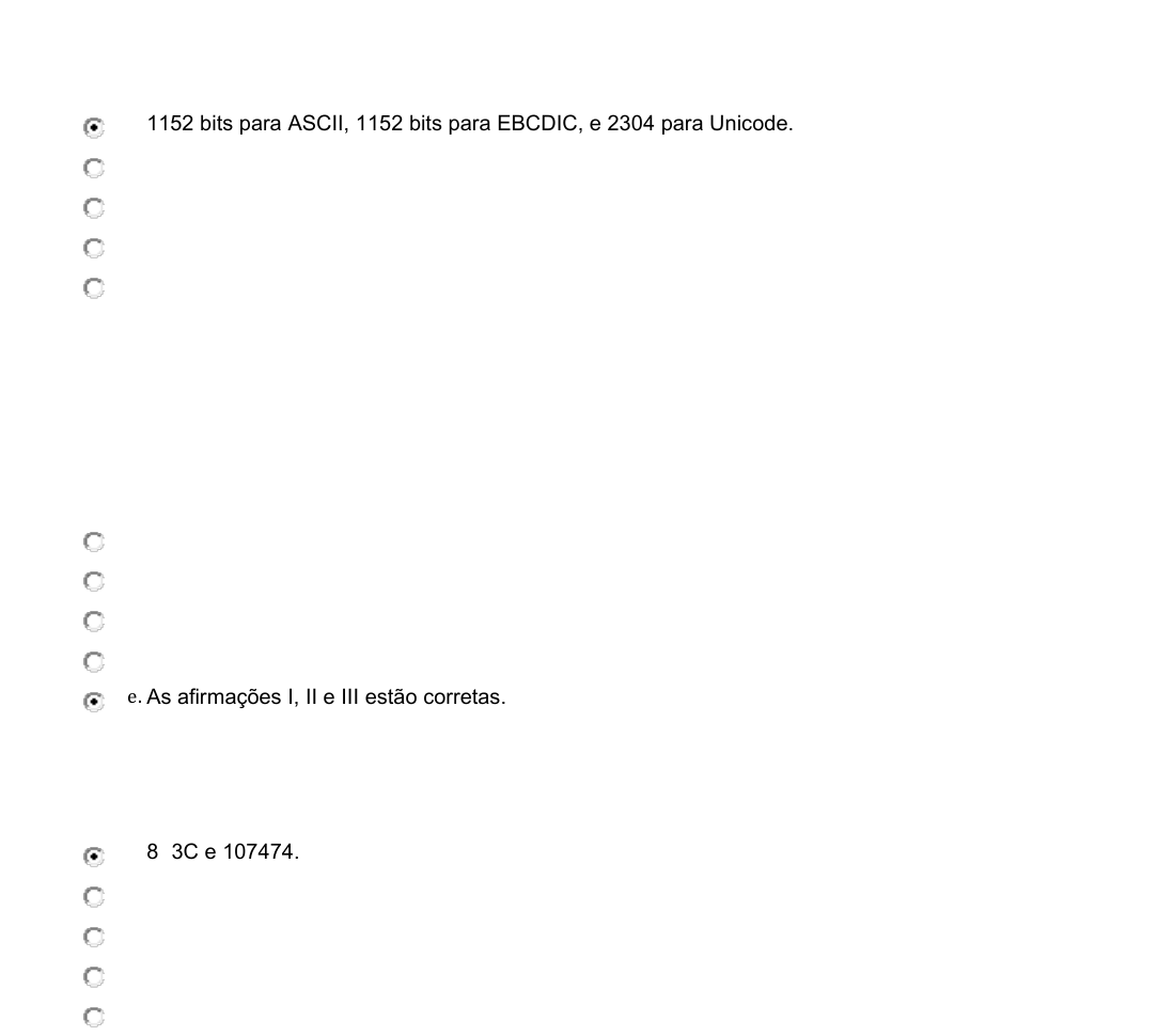 PERGUNTA 1 1. Suponha que um mesmo texto composto por 144 caracteres será escrito utilizando as codificações ASCII, EBCDIC e Unicode. Assinale a alternativa que representa a quantidade de bits necessários para representar este texto em cada uma das codificações mencionadas. a. 1152 bits para ASCII, 1152 bits para EBCDIC, e 2304 para Unicode. b. 144 bits para ASCII, 144 bits para EBCDIC, e 288 para Unicode. c. 1008 bits para ASCII, 1152 bits para EBCDIC, e 2304 para Unicode. d. 1008 bits para ASCII, 1152 bits para EBCDIC, e 1152 para Unicode. e. 7 bits para ASCII, 8 bits para EBCDIC, e 16 para Unicode. PERGUNTA 2 1. A respeito da tríade “dados-informação-conhecimento”, avalie as afirmações I, II e III. I – Dados, observados de forma isolada, não oferecem base para o entendimento de um estado ou situação. II – Informação é fruto da análise e organização dos dados. III – Conhecimento resulta da síntese das informações. Baseado na avaliação realizada, selecione a alternativa correta: a. Apenas I e III estão corretas. b. Apenas I e II estão corretas. c. Apenas II e III estão corretas. d. Apenas III está correta. e. As afirmações I, II e III estão corretas. PERGUNTA 3 1. Seja 1000111100111100 um número inteiro representado na base binária. Assinale a alternativa que corresponde à representação deste mesmo número nas bases hexadecimal e octal, respectivamente. a. 8F3C e 107474. b. 814312 e 107474. c. C3F8 e 474701. d. 814312 e 474701. e. 36668 e 107474. Highlight Highlight Highlight Highlight