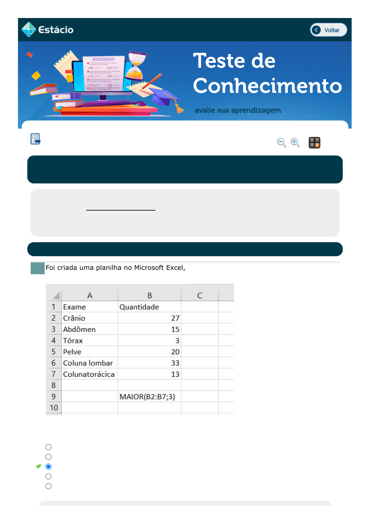 22/03/22, 08:26 Estácio: Alunos https://simulado.estacio.br/alunos/ 1/6 Teste de Conhecimento avalie sua aprendizagem Foi criada uma planilha no Microsoft Excel, em sua configuração original. Indicado a quantidade de exame radiográficos diário. Assinale a alternativa com o resultado correto da fórmula =MAIOR(B2:B7;3), a ser inserida na célula A8. CONTROLE DA QUALIDADE EM EQUIPAMENTOS Lupa Calc. SDE4463_201901134679_TEMAS Aluno: ISABELLA ALVES MIRANDA BASTOS Matr.: 201901134679 Disc.: CONT. DA QUAL. EM 2022.1 - F (GT) / EX Prezado (a) Aluno(a), Você fará agora seu TESTE DE CONHECIMENTO! Lembre-se que este exercício é opcional, mas não valerá ponto para sua avaliação. O mesmo será composto de questões de múltipla escolha. Após responde cada questão, você terá acesso ao gabarito comentado e/ou à explicação da mesma. Aproveite para se familiarizar com este modelo de questões que será usado na sua AV e AVS. ESTATÍSTICA APLICADA AO CONTROLE DA QUALIDADE EM EQUIPAMENTOS 1. 27 3 20 33 13 Data Resp.: 22/03/2022 08:23:47 javascript:voltar(); javascript:voltar(); javascript:diminui(); javascript:aumenta(); javascript:calculadora_on(); 22/03/22, 08:26 Estácio: Alunos https://simulado.estacio.br/alunos/ 2/6 Foram realizados diversos testes para ajustar o protocolo de crânio em um tomógrafo. As doses médias em múltiplos cortes (MSAD) obtidas durante o teste par ao ajuste estão expressas a seguir. 59 mGy 69 mGy 55 mGy 64 mGy 67 mGy 70 mGy 71 mGy 72 mGy 73 mGy A mediana, em mGy, para o MSAD é: Durante uma avaliação de rotina de um equipamento emissor de raios X, observou-se que a leitura de uma câmara de ionização apresentava as seguintes leituras: 7,2 mGy 8,3 mGy 9,7 mGy 9,4 mGy 10 mGy Determine a média da amostra. A curva característica correlaciona a densidade óptica, que é a fração de luz transmitida através do filme por meio da exposição. A figura a seguir exibe essa correlação. Podemos observar que, no eixo vertical, estão dispostos os valores representativos da densidade óptica (DO) e, no eixo horizontal, os valores do logaritmo da exposição relativa (LER). A região linear da curva característica é que fornecerá informações a respeito de contraste, latitude e velocidade. Na curva característica, estão dispostos os valores ordenados para a LER e DO. Por exemplo, o primeiro valor apresentado no gráfico é o LER, e o segundo o valor é a DO. Por exemplo, (1,8;2,17). O LER é 1,8 R e a DO é 2,17. Explicação: A resposta correta é: 20 2. 59 64 69 73 71 Data Resp.: 22/03/2022 08:24:50 Explicação: Como os números não estão ordenados, primeiro, vamos ordená-los: 55, 59, 64, 67, 69, 70, 71, 72, 73. Como o total de números é 9, ou seja, um número ímpar, a mediana será o número mais central, que é o 69. 3. 24,86 mGy 24,06 mGy 25 mGy 24 mGy 23,86 mGy Data Resp.: 22/03/2022 08:24:57 Explicação: Para calcular a média, basta somar cada elemento e dividir pelo total de elementos: (n1 + n2 + n3 + n4 + n5) / 5 CÂMARA ESCURA 4. 22/03/22, 08:26 Estácio: Alunos https://simulado.estacio.br/alunos/ 3/6 Determine a velocidade, em R-1, do receptor de imagem quando a densidade óptica for igual a 0,77. Uma câmara escura deve estar equipada com iluminação de segurança adequada, e os filtros aplicados à lâmpada devem ser adequados à sensibilidade dos filmes conforme a recomendação dos fabricantes. Além disso, a iluminação deve ter a potência adequada e estar posicionada a pelo menos 1,20 m da bancada de trabalho. Qual a função do filtro da luz de segurança? Os filmes radiográficos são dispositivos sensíveis à luz visível e a fótons de raios X. Assinale a faixa de sensibilidade dos filmes radiográficos. 0,67 0,95 0,78 0,52 0,98 Data Resp.: 22/03/2022 08:25:05 Explicação: A resposta correta é: 0,67 5. O uso do filtro diminui o brilho da lâmpada de segurança. O filtro aplicado à luz de segurança não é fundamental no processo de revelação, pois a ausência dele não interfere nem influencia o aumento da densidade óptica. Altera a velocidade de propagação da luz visível, desse modo, não interfere no processo de revelação. Filtrar a transmissão dos componentes do espectro da luz visível para os quais a emulsão do filme radiográfico é mais sensível. Filtrar a transmissão do comprimento-onda do infravermelho do espectro da luz visível para o qual a emulsão do filme radiográfico é mais sensível. Data Resp.: 22/03/2022 08:25:14 Explicação: A resposta correta é: Filtrar a transmissão dos componentes do espectro da luz visível para os quais a emulsão do filme radiográfico é mais sensível. 6. Os filmes radiográficos não apresentam sensibilidade nas regiões compreendidas entre 200 nm e 360 nm. Os filmes radiográficos apresentam sensibilidade no intervalo do espectro da luz 22/03/22, 08:26 Estácio: Alunos https://simulado.estacio.br/alunos/ 4/6 Uma clínica radiológica solicitou que realizasse o teste de radiação de fuga do cabeçote. Sabe-se que o kVp máximo do aparelho é de 125 kVp. A técnica empregada para realizar o teste foi: 80 kVp e corrente de 300 mA. As leituras obtidas foram as seguintes: L1= 48 mGy/h L2= 43,2 mGy/h L3= 105,8 mGy/h L4= 1098,65 µGy/h Assinale a alternativa correta. Radiação de fuga ou de vazamento é a radiação não pertencente ao feixe útil, mas que consegue atravessar o cabeçote ou sistema de colimação do equipamento. O limite estabelecido pela RDC 330/IN52 é: visível compreendido entre 360 nm e 550 nm, o qual correspondem às regiões do ultravioleta próximo, azul e verde. Os filmes radiográficos apresentam sensibilidade apenas nas regiões do ultravioleta próximo, azul e verde. Os filmes radiográficos apresentam sensibilidade no intervalo do espectro da luz visível compreendido entre 360 nm a 780 nm, que corresponde às regiões do ultravioleta próximo, azul e verde. Os filmes radiográficos apresentam sensibilidade apenas nas regiões d