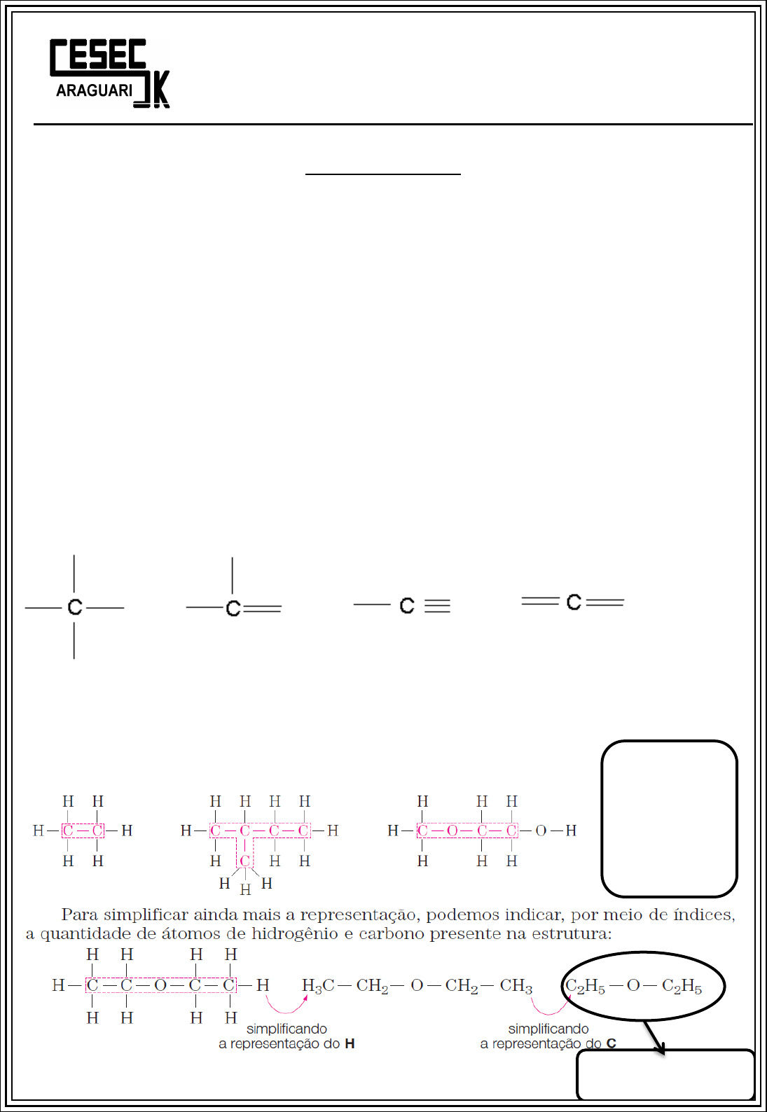 Centro Estadual de Educação Continuada – CESEC JK – Araguari Química – Samuel Brito – 2021 Módulo 6 Química Orgânica A Química Orgânica é a parte da Química que irá estudar os compostos que possuem o elemento carbono (C) em suas estruturas, além deste, os principais elementos presentes na maioria dos compostos são o hidrogênio (H), o oxigênio (O), o nitrogênio (N), halogênios (grupo 17) e o enxofre (S). O átomo de carbono apresenta certas particularidades que o tornam diferente dos demais elementos químicos; esse fato foi percebido na metade do século XIX, inicialmente por Kekulé, e possibilitou uma melhor compreensão da estrutura das substâncias orgânicas, que veremos agora: - O carbono é tetravalente: Todo átomo de carbono precisa de 4 ligações para se estabilizar. Essas quatro ligações podem ocorrer da seguinte forma: 4 simples 2 simples e 1 dupla 1 dupla e 1 tripla 2 duplas - Capacidade de formar cadeias: Os átomos de carbono têm a propriedade de se unir formando estruturas denominadas cadeias carbônicas. Essa propriedade é a principal responsável pela existência de milhões de compostos orgânicos. Veja alguns exemplos de cadeias: Nota-se que quando o carbono não possui as 4 ligações, ele completa-as com o elemento Hidrogênio (H). Não iremos utilizar essa representação !!! Fórmula Molecular (FM): É a contagem de todos os elementos presentes nas cadeias carbônicas. Segue a seguinte estrutura: CxHyOz..... FM: C2H6 FM: C5H12 FM: C3H8O2 Classificação do átomo de carbono: Conforme a posição em que se encontram na cadeia, os átomos de carbono classificam-se de quatro maneiras. OBSERVAÇÃO: APENAS átomos de carbono e ligação entre carbonos são classificados. Classificação da cadeia carbônica: A existência de uma grande variedade de cadeias orgânicas nos obriga a classificá-las segundo vários critérios: - Quanto ao fechamento da cadeia: - Quanto à disposição dos átomos: - Quanto ao tipo de ligação: - Quanto à natureza dos átomos: Funções Orgânicas De acordo com os elementos que são apresentados nas cadeias carbônicas elas possuem nomes diferentes conforme apresentado na tabela abaixo: Exercícios 1) Classifique os carbonos da cadeia abaixo. 2) Refaça a estrutura da questão 1 e complete as ligações com os hidrogênios que forem necessários. 3) 4) 5) 6) Enumere os carbonos e classifique-os: 7) 8) 9) 10) 11) 12) 13) 14) 15) 16)