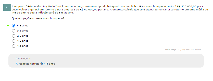 A empresa Brinquedos Toy Mode está querendo lançar um novo tipo de brinquedo em sualinha Esse novo brinquedo custará R 220 000,00 para desenvolver e gerará um retornopara a empresa de R 45 000,00 por