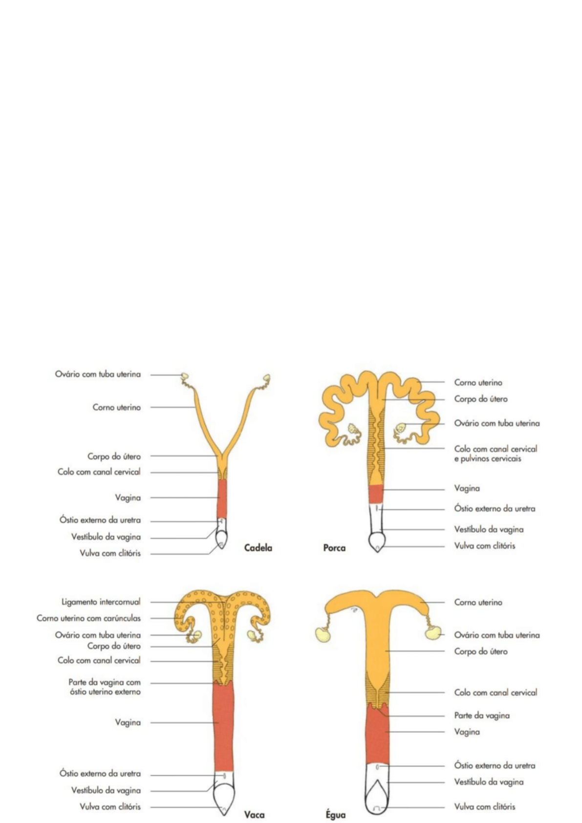 SITEMA REPRODUTOR - FÊMEA -Ovários; -Tubas uterinas; -Útero; -Órgão copulatório: vagina vestíbulo de vagina vulva OVÁRIO: POSIÇÃO - Parte dorsal do abodme, caudal aos rins (car); - Metade do abodme (su); - 8 a 10cm no sentido ventral à parede dorsal do abdome (eq); - próximos à parede abdominal ventral, cranial à abertura pélvica cranial (ru) Forma: - elipsoides com folículos e corpos lúteos grandes; - em forma de rim e superfície regular na égua. TUBA UTERINA: - recebe e transporta os ovócitos para o útero; - suspensa pela mesossalpinge; - extremidade ovariana - infundíbulo com fímbrias na margem livre; - óstio abdominal leva à ampola e ao istmo; - se abre no corno uterino através do óstio uterino. LIGAMENTO LARGO DO ÚTERO: - mesométrio; - mesovário; - mesossalpinge; > BOLSA OVARIANA; > LIGAMENTO SUSPENSOR DO OVÁRIO; > LIGAMENTO PRÓPRIO DO OVÁRIO; ÚTERO CARNÍVOROS: - Dorsal ao intestino delgado; - Colo e corpo curtos; - Cornos delgados e longos; - Canal cervical com pregas longitudinais; - Cornos alcançam os ovários no sentido caudal aos rins. PORCA - Colo longo; - Corpo curto; - Cornos longos suspensos por ligamentos largos extensos; - Canal cervical com pregas mucosas que formam os pulvinos cervicais entrelaçados RUMINANTES - Cornos se enrolam ventralmente; - Cornos unidos pelo ligamento intercornual; - Canal cervical obstruído por pregas mucosas circulares. ÉGUA - Corpo amplo; - Cornos se levam em direção ao teto do abdome, acima da massa intestinal; - Colo pequeno (palpável retalmente) - Canal cervical com pregas mucosas longitudinais. ÓSTIO UTERINO INTERNO - Abertura cranial do canal cervical para o corpo uterino. ÓSTIO UTERINO EXTERNO - Abertura caudal do canal cervical para a vagina. - se projeta no lúme vaginal e é cercado por um espaço anular (bo, eq); - se alarga para continuar na vagina (su,ca); - se abre em uma elevação que se projeta na vagina (fe). PAREDE TURINA: > ENDOMÉTRIO - camada mucosa > MIOMÉTRIO - camada muscular > PERIMÉTRIO - camada serosa ENDOMÉTRIO - espessura variável de acordo com o ciclo fértil; apresenta glândulas tubulares; em ruminantes tem a superfície marcada pelas carúnculas uterinas. MIOMÉTRIO - camada longitudinal externa; camada circular interna mais espessa; separadas por camada de tecido conjuntivo vascularizado. PERIMÉTRIO - membrana serosa contínua com ligamento largo; paramétrio com vários vasos sanguíneos e fibras nervosas. VAGINA - desde o óstio uterino externo até o óstio externo da uretra; - longa de paredes finas; - se situa em uma posição mediana no interior da cavidade pélvica entre o reto e a vesícula urinária. VESTÍBULO - parte caudal do órgão copulatório; desde o óstio externo até a vulva externa; combina funções reprodutoras e urinárias; parede com glândulas vestibulares; paredes laterais com veias (bulbo vestibulares) VULVA - formada por dois lábios que se encontram em uma comissura dorsal e outra ventral circundando a abertura vulvar vertical; a comissura dorsal é arredondada e a ventral é aguda, exceto na égua, cujo padrãoé invertido; o clitóris se posiciona na comissura ventral. MÚSCULOS - constituem partes da abertura pélvica caudal; parte ventral, o diafragma urogenital que causa a oclusão da abertura pélvica caudal ao redor do vestíbulo; - os músculos do vestíbulo e a vulva compreendem os seguintes músculos estriados; > m. constritor do vestíbulo; > m. constritor da vulva; > m. isquiocavernoso