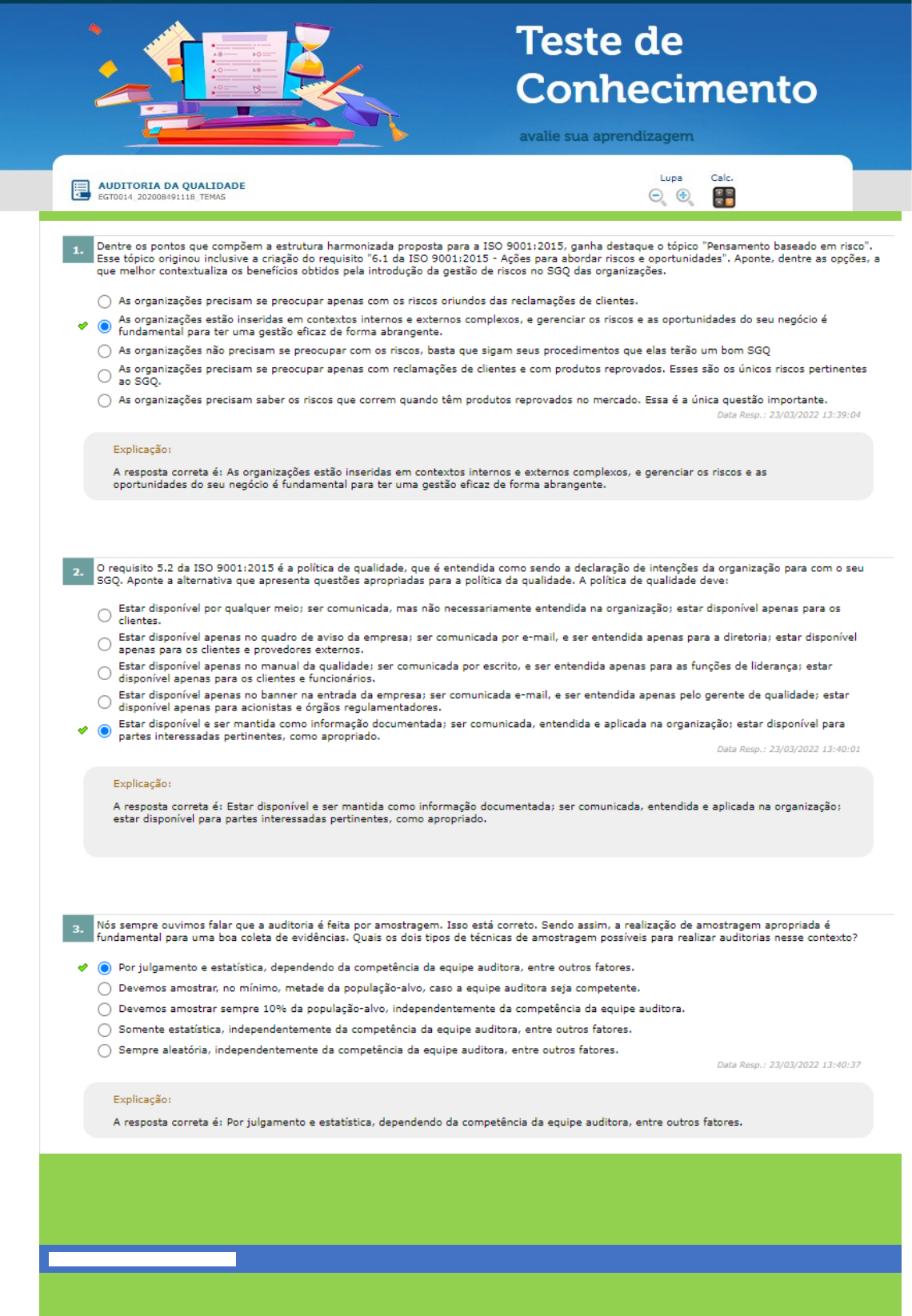 Dentre os pontos que compõem a estrutura harmonizada proposta para a ISO 9001:2015, ganha destaque o tópico "Pensamento baseado em risco". Esse tópico originou inclusive a criação do requisito "6.1 da ISO 9001:2015 - Ações para abordar riscos e oportunidades". Aponte, dentre as opções, a que melhor contextualiza os benefícios obtidos pela introdução da gestão de riscos no SGQ das organizações. As organizações precisam se preocupar apenas com os riscos oriundos das reclamações de clientes. As organizações estão inseridas em contextos internos e externos complexos, e gerenciar os riscos e as oportunidades do seu negócio é fundamental para ter uma gestão eficaz de forma abrangente. As organizações não precisam se preocupar com os riscos, basta que sigam seus procedimentos que elas terão um bom SGQ As organizações precisam se preocupar apenas com reclamações de clientes e com produtos reprovados. Esses são os únicos riscos pertinentes ao SGQ. As organizações precisam saber os riscos que correm quando têm produtos reprovados no mercado. Essa é a única questão importante. Data Resp.: 23/03/2022 13:39:04 Explicação: A resposta correta é: As organizações estão inseridas em contextos internos e externos complexos, e gerenciar os riscos e as oportunidades do seu negócio é fundamental para ter uma gestão eficaz de forma abrangente. 2. O requisito 5.2 da ISO 9001:2015 é a política de qualidade, que é entendida como sendo a declaração de intenções da organização para com o seu SGQ. Aponte a alternativa que apresenta questões apropriadas para a política da qualidade. A política de qualidade deve: Estar disponível por qualquer meio; ser comunicada, mas não necessariamente entendida na organização; estar disponível apenas para os clientes. Estar disponível apenas no quadro de aviso da empresa; ser comunicada por e-mail, e ser entendida apenas para a diretoria; estar disponível apenas para os clientes e provedores externos. Estar disponível apenas no manual da qualidade; ser comunicada por escrito, e ser entendida apenas para as funções de liderança; estar disponível apenas para os clientes e funcionários. Estar disponível apenas no banner na entrada da empresa; ser comunicada e-mail, e ser entendida apenas pelo gerente de qualidade; estar disponível apenas para acionistas e órgãos regulamentadores. Estar disponível e ser mantida como informação documentada; ser comunicada, entendida e aplicada na organização; estar disponível para partes interessadas pertinentes, como apropriado. Data Resp.: 23/03/2022 13:40:01 Explicação: A resposta correta é: Estar disponível e ser mantida como informação documentada; ser comunicada, entendida e aplicada na organização; estar disponível para partes interessadas pertinentes, como apropriado. 3. Nós sempre ouvimos falar que a auditoria é feita por amostragem. Isso está correto. Sendo assim, a realização de amostragem apropriada é fundamental para uma boa coleta de evidências. Quais os dois tipos de técnicas de amostragem possíveis para realizar auditorias nesse contexto? Por julgamento e estatística, dependendo da competência da equipe auditora, entre outros fatores. Devemos amostrar, no mínimo, metade da população-alvo, caso a equipe auditora seja competente. Devemos amostrar sempre 10% da população-alvo, independentemente da competência da equipe auditora. Somente estatística, independentemente da competência da equipe auditora, entre outros fatores. Sempre aleatória, independentemente da competência da equipe auditora, entre outros fatores. Data Resp.: 23/03/2022 13:40:37 Explicação: A resposta correta é: Por julgamento e estatística, dependendo da competência da equipe auditora, entre outros fatores. 4. A auditoria de terceira parte (certificação) é importante para declarar para uma terceira parte que o SGQ de uma organização está adequado e conforme com a ISO 9001:2015. Essa auditoria, quando é realizada por um organismo certificador acreditado, confere mais credibilidade ao processo. Aponte o organismo acreditador brasileiro. Procon - Órgão de Defesa do Consumidor Anvisa - Agência Nacional de Vigilância Sanitária Inmetro - Instituto Nacional de Metrologia, Qualidade e Tecnologia ABNT - Associação Brasileira de Normas Técnicas ISO - Organização Internacional para Normalização Data Resp.: 23/03/2022 13:41:41 Explicação: A resposta correta é: Inmetro - Instituto Nacional de Metrologia, Qualidade e Tecnologia 5. O auditor líder é um elemento central das auditorias, de modo que as responsabilidades atribuídas ao auditor líder são inúmeras e importantes. Assinale a alternativa que cita duas dessas responsabilidades, se considerarmos as boas práticas de auditoria de qualidade. Definir a relação de documentos que serão auditados e as questões logísticas relacionadas à auditoria sem entrar em consenso com o auditado Definir os valores a serem cobrados para a auditoria e a duração da auditoria. Definir a relação de auditados que deverá responder as questões da auditoria e a forma de acesso à documentação da auditoria. Definir a relação de equipamentos e instalações que serão auditados e os requisitos regulamentares que deverão ser auditados. Definir os detalhes de contato do auditado, os locais, o período e a duração das atividades de auditoria, bem como as informações necessárias para avaliar a abordagem adotada para os riscos e oportunidades identificados para o alcance dos objetivos de auditoria. Data Resp.: 23/03/2022 13:43:27 Explicação: A resposta correta é : Definir os detalhes de contato do auditado, os locais, o período e a duração das atividades de auditoria, bem como as informações necessárias para avaliar a abordagem adotada para os riscos e oportunidades identificados para o alcance dos objetivos de auditoria. 6. Avaliar e garantir a viabilidade da realização da auditoria é im