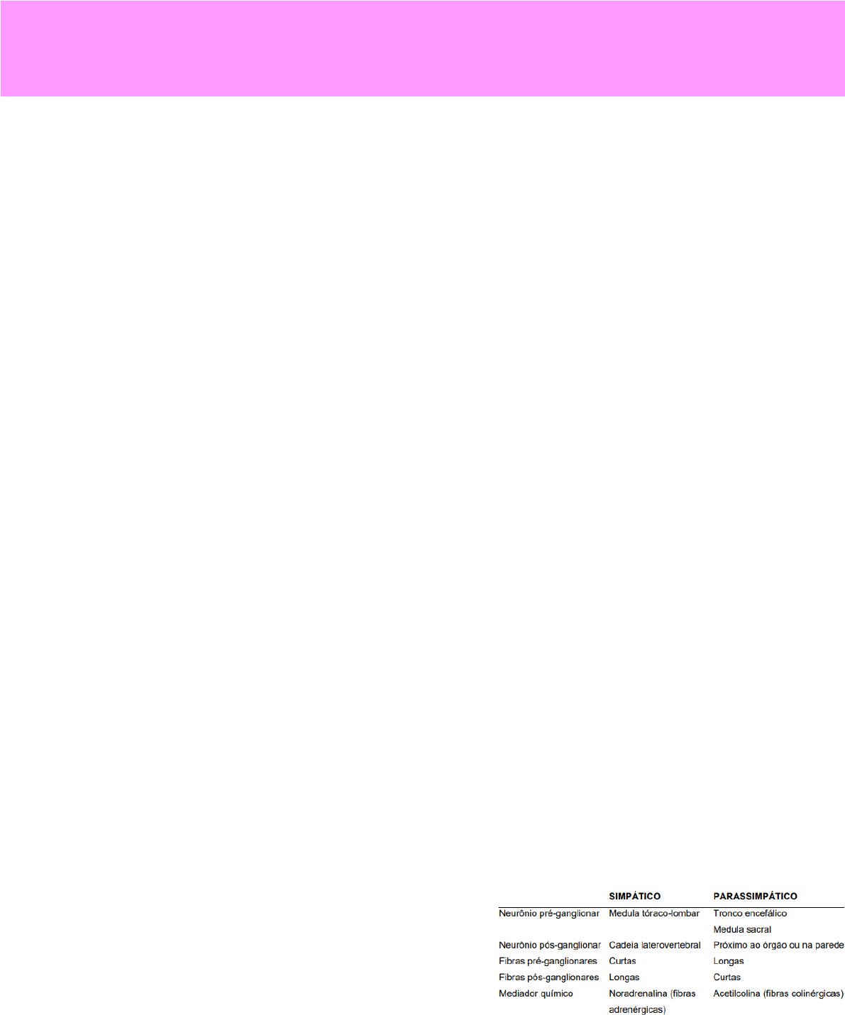 • Pode ser dividido de modo geral em somático e visceral. • Sistema nervoso somático: denominado de sistema nervoso da vida de relação, pois é aquele que se relaciona com o meio. • Parte aferente conduz aos centros nervosos impulsos originados em receptores periféricos. • Parte eferente leva impulsos aos músculos esqueléticos. • Sistema nervoso visceral: também denominado vida vegetativa, relaciona-se com a inervação das estruturas viscerais. Importem para a integração da atividade das vísceras na manutenção da constância do meio interno. ➝ seu componente aferente conduz impulsos nervosos originados das vísceras (visceroceptores). Essas fibras acompanham nervos predominantemente viscerais, juntamente com as fibras do sistema nervoso autônomo. ➝ Grande parte das fibras viscerais conduz impulsos que não se tornam conscientes, como os impulsos que informam sobre a pressão arterial e o nível de O2 no sangue. ➝ seu componente eferente do sistema nervoso visceral traz impulsos de certos centros nervosos até suas terminações em glândulas, músculos lisos ou músculo cardíaco. Essa parte é denominada sistema nervosos autônomo e suas fibras são classificadas como eferentes viscerais gerais (EVG). Diferenças entre o sistema nervoso somático eferente e o sistema nervoso visceral eferente: • O primeiro é voluntário e o segundo é involuntário. • Uma diferença muito importante é vista pelo modo anatômico, que diz respeito ao número de neurônios que ligam o sistema nervoso central (medula ou tronco encefálico) e o órgão efetor (músculo ou glândula). • Sistema somático: apenas um neurônio • Sistema nervosos autônomo apresenta dois tipos distintos de neurônios: Pré e pós-ganglionares, que são elementos fundamentais na organização da parte periférica deste sistema. O primeiro tipo encontra-se no tronco encefálico ou na medula espinhal e é denominado neurônio pré-ganglionar. ➝ O axônio deste neurônio é a fibra pré- ganglionar. ➝ o segundo tipo de neurônio encontra- se nos gânglios autônomos (corpos de neurônios que estão fora do sistema nervoso central), chamado neurônio pós- ganglionar e seu axônio é a fibra pós- ganglionar. ➝ corpos dos neurônios pré-ganglionares localizam-se no tronco encefálico e medula espinhal. ➝ Tronco encefálico: formam os núcleos de origem de alguns pares cranianos: - IIIº oculomotor; - VIIº facial; -IXº glossofaríngeo; - Xº vago. ➝Medula: localizam-se na região tóraco-lombar e neste ponto se agrupam formando o corno lateral da medula espinhal, e outra parte na medula sacral. ➝ cadeia laterovertebral simpática: serie de gânglios e suas interligações. Estão localizados ao longo da porção vetrolateral dos corpos das vértebras. ➝Gânglios periféricos ou gânglios terminas: estão na divisão craniossacral e são localizados perifericamente, na estrutura inervada. • O sistema nervoso autônomo divide-se em: simpático e parassimpático. Principais diferenças entre o simpático e o parassimpático: • Os efeitos do simpático e do parassimpático são antagônicos, ou seja, regulam e ajustam a ação da víscera. • O parassimpático estimula atos para preservar o corpo como diminuir os batimentos cardíacos (bradicardia), Sistema nervoso autônomo constrita a pupila e aumenta o peristaltismo. • O simpático serve para defender o corpo nas crises. Sua estimulação causa dilatação da pupila, aumenta o batimento cardíaco (taquicardia), eleva a pressão sanguínea e incrementa a circulação sanguínea para os músculos somáticos. Simpático • Neurônios pré-ganglionares localizados na região tóraco-lombar no corno lateral da medula. • As fibras saem no corno ventral junto com a raiz ventral do nervo espinhal e fazem sinapse na cadeia laterovertebral simpática. • A fibra pós-ganglionar pode chegar ao órgão de três maneiras diferentes: - Sozinha, como um nervo independente. - Acompanhando uma artéria - Acompanhando um nervo espinhal ou craniano. Principais gânglios no cão: Parte cervical 1. Gânglio vertebral – próximo à origem da artéria vertebral, na extremidade cranioventral da alça da subclávia. Inerva estruturas do tórax e lança os nervos cardíacos vertebrais que vão para o plexo cardíaco. 2. Gânglios intermediários – observados caudal a alça da subclávia, no cão e no gato. 3. Gânglio cervical médio – não é visto com frequência, podendo suas células estarem nos gânglios vertebral ou cervical cranial. 4. Gânglio cervical cranial - ventralmente à bula timpânica, de formato fusiforme e recebe ramos pré-ganglionares que surgem dos primeiros 4 ou 5 gânglios torácicos. partem fibras pós- ganglionares que acompanham a artéria carótida comum, os nervos cranianos glossofaríngeo, vago, acessório e hipoglosso e, ainda os três primeiros nervos espinhais, levando inervação para as estruturas da cabeça. Parte Torácica Os gânglios situam-se bilateralmente às articulações costovertebrais, desde o cervicotorácico (junto à emergência da artéria subclávia) até o pilar do diafragma. 1. Gânglio cervicotorácico – Formado pela fusão do cervical caudal e dos três primeiros torácicos. Está na extremidade proximal da alça da subclávia, ao nível do primeiro ou segundo espaço intercostal. Inerva coração, pulmão, traqueia, etc. Lança os nervos cardíacos cérvico- torácicos até o plexo cardíaco. 2. Gânglios torácicos – Está em cada espaço intercostal a partir do terceiro ou quarto caudalmente. Lançam os nervos cardíacos torácicos para o plexo cardíaco, e ainda ramos para os grandes vasos, esôfago e pulmões. Formam a cadeia laterovertebral simpática. Parte Abdominal 1. Nervo esplâncnico maior – constituído de fibras que emergem a partir do 12º ou 13º gânglio torácico. Penetra na cavidade abdominal e termina no plexo adrenal e celíaco- mesentérico, levando inerv