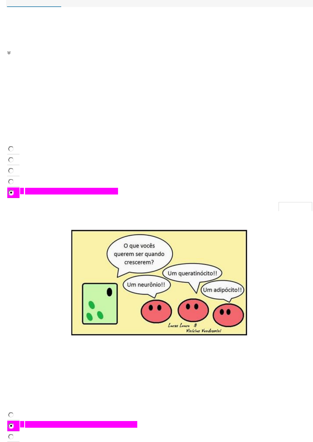 Informações do teste Descrição Instruções Várias tentativas Este teste permite 2 tentativas. Esta é a tentativa número 1. Forçar conclusão Este teste pode ser salvo e retomado posteriormente. Suas respostas foram salvas automaticamente. Estado de Conclusão da Pergunta: PERGUNTA 1 1. A camada mais externa do blastocisto, o trofoblasto, é considerado o primeiro dos anexos embrionários. É formado por duas camadas de células: o sinciciotrofoblasto e o citotrofoblasto. O citotrofoblasto constitui a camada mais interna de células (mononucleadas). Dele se deriva o sinciciotrofoblasto (camada mais externa de células), através da perda das membranas intercelulares. O sinciciotrofoblasto forma então um infiltrado de células no endométrio. Aos poucos, lacunas se formam e essas são preenchidas com fluidos e secreções uterinas. Com o crescimento dessas lacunas e o crescimento do sinciciotrofoblasto para dentro da parede uterina, capilares do endométrio são atingidos, e sangue materno passa a preencher esses espaços.” Disponível em <http://www.embryology.ch/anglais/fplacenta/fecond03.html>. Acesso em 15 abr. 2019. Por volta da segunda semana de gestação, dando sequência ao que foi descrito acima, é estabelecida a: a. a placenta b. maturação do encéfalo c. Mórula d. formação dos anexos da pele e. circulação uteroplacentária primitiva 0,25 pontos PERGUNTA 2 1. Observe a charge a seguir: Disponível em <http://vidatroncocelular.blogspot.com/2015/04/charge-sobre-o-papel-das-celulas-tronco.html>. Acesso em 15 abr. 2019. Sobre o processo representado na charge, foram feitas as seguintes afirmativas: I – A diferenciação celular inicia-se durante a gastrulação, com a formação dos folhetos embrionários e reposicionamento celular. II – Os processos de transcrição e expressão gênica são indispensáveis para a diferenciação celular. III – Células já diferenciadas podem voltar a se tornar células totipotentes, se necessário para regeneração do organismo. Agora, assinale a alternativa correta: a. Apenas as alternativas II e III estão corretas. b. Apenas as afirmativas I e II estão corretas. c. As alternativas I, II e III estão corretas. https://bb.cruzeirodosulvirtual.com.br/webapps/assessment/take/launch.jsp?course_assessment_id=_770511_1&course_id=_774533_1&content_id=_10526854_1&step=null d. Apenas a alternativa I está correta. e. Apenas a afirmativa II está correta. 0,25 pontos PERGUNTA 3 1. “Técnica também conhecida como "bebê de proveta", a fertilização in vitro (FIV) é um processo em que a fertilização do óvulo com espermatozoide é feita em laboratório. Os espermatozoides, com os óvulos, são colocados numa cultura especialmente preparada e mantida em condições ideais de temperatura em ambiente que simula as trompas. Se o processo evoluir favoravelmente, os pré-embriões são transferidos para o útero da mãe.[...] a transferência de embriões para o interior do útero da mulher, realizada após cinco dias de desenvolvimento embrionário in vitro”. Disponível em <https://www.hospitalsiriolibanes.org.br/hospital/especialidades/centro-reproducao-humana/Paginas/reproducao- humana-fertilizacao-in-vitro.aspx>. Acesso em 15 abr, 2019. Com base no exposto, podemos dizer que o embrião é implantado no útero quando atinge o formato de: a. nêurula, uma vez que o embrião implantado já está desenvolvendo o tubo neural. b. gástrula, pois podemos identificar os folhetos germinativos no embrião implantado. c. blastocisto, pois nesse período o embrião é uma estrutura conhecida como mórula. d. blastocisto, pois é nesta fase que ocorre a implementação do embrião no útero, facilitando o processo. e. gástrula, pois podemos observar a formação do blastóporo, que dará origem ao ânus. 0,25 pontos PERGUNTA 4 1. Podemos definir folhetos germinativos como camadas de células formadas durante o desenvolvimento embrionário. Nos seres humanos, surgem durante a gastrulação, a partir de células tronco totipotentes, que vão se tornando mais restritas até que seu desenvolvimento se torna determinado para a formação de uma das três camadas: ectoderme, mesoderme e endoderme. Estas camadas, por sua vez, desenvolvem-se em tecidos e órgãos, num processo conhecido como organogênese. Sobre estas camadas, foram feitas as seguintes afirmativas. Julgue-as, assinalando V para as afirmativas verdadeiras e F para as falsas: ( ) A pele humana é formada pela epiderme e pela derme, estruturas que se originam da ectoderme e da endoderme, respectivamente. ( ) Células pulmonares são formadas a partir da endoderme. ( ) O sistema nervoso central e o sistema nervoso periférico são formados a partir de células mesodérmicas. ( ) O sistema circulatório e o tecido sanguíneo são formados pela mesma camada embrionária. Agora, assinale a alternativa correta: a. V – F – F – V. b. V – F – V – F. c. F – F – V – V. d. F – V – F – V. e. V – V – F – F.