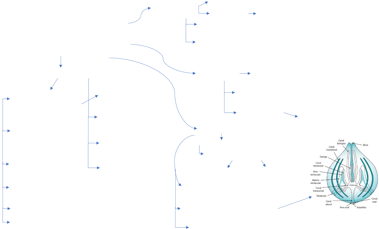 Filo Ctenophora Morfologia externa Tentáculos com coloblastos DIVISÃO DO CORPO Simetria birradial Possui um infundíbulo, oito canais meridionais e alguns canais acessórios (canais paragástricos, transversais, tentaculares, anais, interradiais, adradiais e canal oral), todos de origem endodérmica COLORAÇÃO Não possuem fase fixa ou séssil Musculatura formada por células mesenquimais bioluminescentes Cefalização – capacidade de orientação e percepção do caminho LOCOMOÇÃO e SUSTENTAÇÃO A parede do corpo é formada por dois epitélios: a epiderme externa e a gastroderme, não possuem sistema circulatório, respiratório e excretor. Possui uma única cavidade no corpo: cavidade gastrovascular algumas espécies que vivem em águas mais profundas são fortemente pigmentadas ESTRUTURA DO CORPO Possuem 8 fileiras de pentes (placas ciliadas) tentacular estomodeal Eixo corporal oral-aboral são animais de consistência gelatinosa dada pela mesogleia São monórficos Separados por um mesogleia celular As espécies que vivem perto da superfície são incolores e quase transparentes Consistência gelatinosa dada pela mesogleia é causada pela ativação de um complexo de proteínas de cálcio denominadas fotoproteínas Possuem dois planos perpendiculares: Principal mecanismo de locomoção: os batimentos metacrônico das placas ciliadas Diploblásticos O sistema nervoso é composto por uma rede de nervos ou plexo. Sistema gastrovascular de um ctenoforo O sistema gastrovascular é composto por um estomodeu REFERÊNCIAS Oliveira, O.M.P., Mianzan, H., Migotto, A.E. & Marques, A.C. Chave de identificação dos Ctenophora da costa brasileira. Biota Neotrop. Sep/Dez 2007 vol. 7, no. 3. Moreira, Alexandre Paulo Teixeira. Zoologia de invertebrados I/Alexandre Paulo Teixeira Moreira. – Florianópolis: BIOLOGIA/EAD/UFSC, 2009. 213 p. Disponível em: https://uab.ufsc.br/biologia/files/2020/08/Abertura.pdf. OLIVEIRA, Otto Muller Patrão de. Ctenoforos da costa brasileira: considerações taxonômicas e biológicas. 2007. Tese (Doutorado em Zoologia) - Instituto de Biociências, Universidade de São Paulo, São Paulo, 2007. doi:10.11606/T.41.2007.tde- 26102007-094502. Acesso em: 2021-12-16. Disponível em: https://www.teses.usp.br/teses/disponiveis/41/41133/tde-26102007- 094502/publico/Otto_Oliveira.pdf https://uab.ufsc.br/biologia/files/2020/08/Abertura.pdf https://www.teses.usp.br/teses/disponiveis/41/41133/tde-26102007-094502/publico/Otto_Oliveira.pdf https://www.teses.usp.br/teses/disponiveis/41/41133/tde-26102007-094502/publico/Otto_Oliveira.pdf