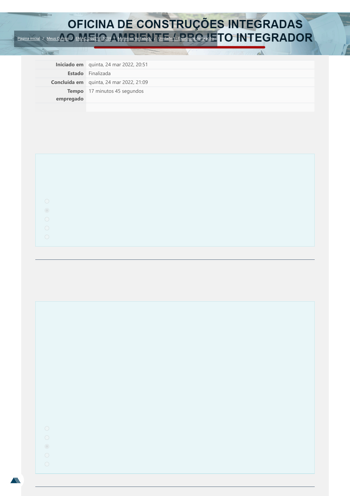 Página inicial / Meus Cursos / ENIAC_20221E_1259 / Materiais de Estudo / Unidade 1 - Exercícios de �xação Iniciado em quinta, 24 mar 2022, 20:51 Estado Finalizada Concluída em quinta, 24 mar 2022, 21:09 Tempo empregado 17 minutos 45 segundos Notas 10,00 de um máximo de 10,00(100%) Questão 1 Correto Atingiu 0,50 de 0,50 Questão 2 Correto Atingiu 0,50 de 0,50 O clima é um fator que afeta a forma como as civilizações vivem. Um projeto de arquitetura que visa boa adaptação e conforto em relação ao clima deve levar em consideração alguns fatores climáticos, tais como: a. a temperatura e o posicionamento solar em relação ao sul. b. os ventos predominantes, a umidade do ar, a posição solar e temperatura. c. a relação entre temperatura local e pressão do ar. d. a temperatura local, que é o único fator climático necessário. e. os ventos oriundos do nordeste e a posição solar da edi�cação. A vegetação é um fator essencial para a sobrevivência dos seres vivos neste planeta, garantindo recursos fundamentais para toda a sociedade. Nesse contexto, relacione as colunas abaixo e apresente a ordem de respostas correta. I- Microclima II- Vegetação III- Massa de vegetação ( ) Utilizada como barreira natural para a perda de calor por in�ltração durante o inverno. ( ) A vegetação pode vir a adaptá-lo, sendo utilizada como estratégia para atender a quali�cação de projeto ambiental. ( ) Utilizada para barrar os ventos incidentes, impossibilitando a passagem direta pelo interior da edi�cação. a. I – III – II b. III – II – I c. II – I – III d. II – III – I e. III – I – II https://portalacademico.eniac.edu.br/ https://portalacademico.eniac.edu.br/course/view.php?id=16053 https://portalacademico.eniac.edu.br/course/view.php?id=16053#section-1 https://portalacademico.eniac.edu.br/mod/quiz/view.php?id=382334 https://atendimento.eniac.edu.br/ LENOVO Realce LENOVO Realce LENOVO Realce Questão 3 Correto Atingiu 0,50 de 0,50 Questão 4 Correto Atingiu 0,50 de 0,50 A arquitetura sustentável visa à redução dos impactos ambientais causados pela construção e uso das edi�cações. A imagem a seguir apresenta a fotogra�a de três torres com pele de vidro em todas as fachadas. A partir da ótica da sustentabilidade, o que é possível a�rmar sobre as edi�cações da foto? a. Edi�cações altas são vantajosas em climas quentes, pois produzem sombra no entorno, ajudando o conforto da vizinhança. b. A forma arquitetônica das edi�cações deve ter sido pensada para melhor direcionamento da ventilação local. c. As fachadas recebem o mesmo tratamento independentemente da posição solar, causando excesso de sol e calor na fachada mais exposta. d. Por serem feitas de vidro, devem ser edi�cações de clima frio, visto que o sol consegue atingir todas as partes da edi�cação. e. A pele de vidro é o elemento ideal para arquitetura de climas quentes, pois permite maior quantidade de aberturas, dispensando uso de bloqueio do sol. Uma das questões da sustentabilidade é a redução de impactos ambientais por meio da utilização de energias limpas. Sobre a relação entre energia e sustentabilidade, o que se pode a�rmar? a. A energia limpa é baseada na busca de fontes não renováveis alternativas. b. A energia limpa visa à utilização de recursos renováveis e não poluentes. c. A geração de uma energia limpa se baseia em não utilizar tecnologias. d. A energia limpa é uma forma de viver sem utilizar energia elétrica. e. As fontes de uma energia limpa são baseadas em combustíveis fósseis. https://atendimento.eniac.edu.br/ Questão 5 Correto Atingiu 0,50 de 0,50 Questão 6 Correto Atingiu 0,50 de 0,50 Questão 7 Correto Atingiu 0,50 de 0,50 Uma das certi�cações ambientais que vem se destacando no ramo da arquitetura sustentável é o LEED. Sobre esse selo, é possível a�rmar que: a. É aplicado principalmente em edi�cações do Estado por ser obrigatório. b. É um selo de origem brasileira em vigor desde os anos 1990. c. Analisa apenas os materiais utilizados nas edi�cações. d. Tem quatro tipos de selo conforme a quantidade de medidas sustentáveis. e. Está voltado exclusivamente para a construção de novas edi�cações. O acesso à água é fundamental para que ocorra o desenvolvimento sustentável, a erradicação da pobreza, o crescimento econômico e a sustentabilidade ambiental. Quais os mecanismos a serem incentivados para que seja garantido a todos o acesso à água? a. Cooperação internacional, proteção a corpos d’água e compartilhamento de tecnologias para o tratamento da água. b. Tratamento de e�uentes. c. Extração em grandes quantidades. d. Erradicação da pobreza. e. Sistema de compra e venda. A geração de energia para suprir as necessidades humanas pode ser feita mediante fontes renováveis e fontes não renováveis. Essas fontes estão relacionadas com o recurso utilizado na geração da energia. Considere as seguintes fontes de energia: I – Movimentos dos rios e carvão mineral II – Calor do sol e petróleo III – Matéria orgânica e urânio Apresenta(m) exemplos de recurso renovável e recurso não renovável, respectivamente: a. Apenas II e III. b. Apenas I e III. c. I, II e III. d. Apenas II. e. Apenas I. https://atendimento.eniac.edu.br/ Questão 8 Correto Atingiu 0,50 de 0,50 Questão 9 Correto Atingiu 0,50 de 0,50 Questão 10 Correto Atingiu 0,50 de 0,50 As energias limpas devem ser pensadas juntamente com os projetos sustentáveis. De que maneira as energias limpas podem ser incorporadas na arquitetura sustentável? a. Os governos podem incentivar o uso do transporte particular, aumentando o uso de energia limpa. b. A energia limpa só pode ser promovida pelos órgãos públicos, mediante troca do sistema energético do país ou de uma região. c. As edi�cações podem conter painéis solares ou turbinas eólicas para gerar a própria energia. d. As energi