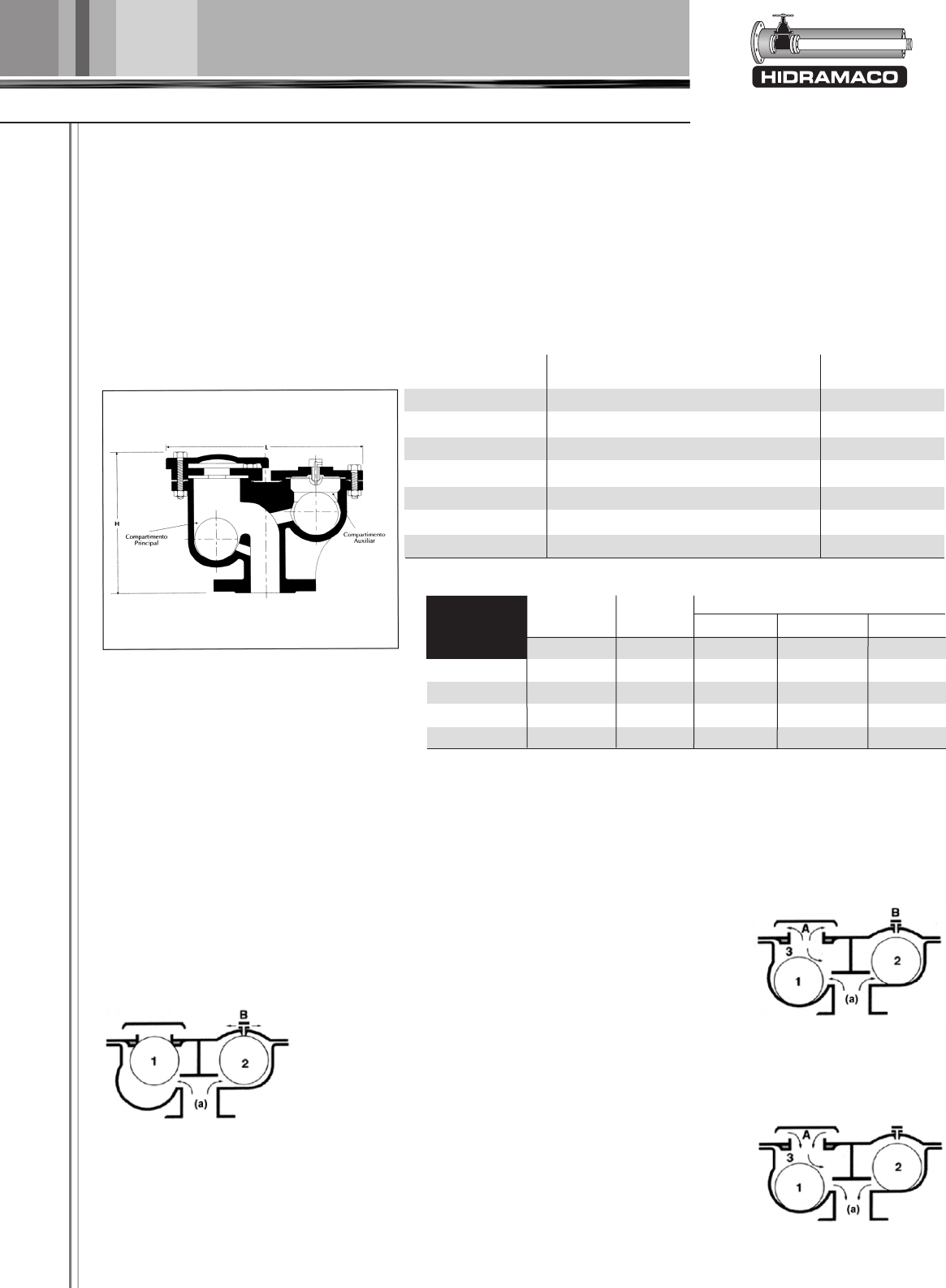 Descrição As ventosas de tríplice função, constituídas por um corpo dividido em dois compartimentos (o principal e o auxiliar), cada um contendo um flutuador esférico em seu interior, tem por finalidades específicas: expelir o ar deslocado pela água durante o enchimento da linha (compartimento principal), admitir quantidade suficiente de ar, durante o esvaziamento da linha, a fim de evitar depressões e o conse- quente colapso da rede (compartimento principal), expelir o ar proveniente das bombas em operação e difuso na água, funcionando como uma ventosa simples (compartimento auxiliar). Ventosas Tríplice Função Dimensões e Massas Funcionamento Tabela de Referência DN PN Referência 50 10/16/25 VTF25 100-150 10/16 VTF16 100-150 25 VTF25 200 10 VTF10 200 16 VTF16 200 25 VTF25 mm mm Kg Kg Kg 50 285 200 21 21 21 100¹ 360 315 52 52 52,5 150 480 500 86 86 87 200 755 565 145 146 147 L MassaHDiâmetro Nominal DN PN 10 PN 16 PN 25 (1) Esta ventosa pode opcionalmente ser fornecida com flange DN 75 ou DN 80. Durante o esvaziamento ou a ocorrência de uma depressão na canaliza- ção, o flutuador 1 desce sob ação do próprio peso, liberando a entrada de ar (a) pelo orifíco A. Uma ventosa de tríplice função constitui-se de duas câmaras: uma com um orifício A bastante grande que permite grandes vazões de ar e trabalha com baixas pressões, a outra com um pequeno orifício B, que trabalha como uma ventosa simples realizando a eliminação do ar formado durante a operação das bombas. Durante o enchimento da canalização, o volume de água cresce len- tamente. O ar (a) escapa pelo orifício A com um volume equivalente à quantidade de água que entra na canalização. Durante a operação das bombas, o ar (a) que se acumula na canalização é eliminado pelo orifício B, como na ventosa simples. VENTOSAS VÁLVULAS Ventosas Tríplice Função (modelo 1) Características Construtivas No Componentes Materiais 1 Corpo Ferro dúctil NBR 6916 classe 42012 2 Suporte maior Ferro dúctil NBR 6916 classe 42012 3 Tampa Ferro dúctil NBR 6916 classe 42012 4 Suporte menor Ferro dúctil NBR 6916 classe 42012 5 Flutuador maior Borracha EPDM ou Alumínio 6 Flutuador menor Borracha EPDM 7 Niple de descarga Latão 8 Anel de vedação maior Borracha 9 Anel de vedação menor Borracha 10 Compartimento principal 11 Compartimento auxiliar Pressão Máxima de Serviço Pressão de Teste Pressão Mínima de Serviço MPa MPa MPa 2,5 2,7 0,1 Revestimento Pintura epóxi poliamida, interna e externamente. Pressões Flanges Gabaritos de furação conforme NBR 7675 (ISO 2531), nas classes PN 10, PN 16 e PN 25. Função Flange DN Classes Expelir o ar deslocado pela água durante o enchimento da linha. Admitir ar durante o esvaziamento da linha. Expelir continuamente o ar acumulado durante a operação da rede. PN 10 PN 16 NBR 7675 50 100 150 VENTOSAS VÁLVULAS Ventosas Tríplice Função Características Construtivas Descrição A ventosa tríplice função é constituída por um corpo dividido por dois compartimentos (principal e o auxiliar), cada um contendo um flu- tuador esférico em seu interior, tendo por finalidades específicas: Expelir o ar deslocado pela água durante o enchimento da linha (com- partimento principal); Admitir quantidade suficiente de ar, durante o esvaziamento da linha, a fim de evitar depressões e o conseqüente colapso da rede (compartimento principal); Expelir continuamente o ar acumulado durante a operação da rede. PRESSÃO MAXIMA DE SERVIÇO: 25 Kg/cm² | PRESSÃO MINIMA DE SERVIÇO: 10 Kg/cm² TESTE HIDROSTÁTICO: 27 Kg/cm² | FLANGES: NBR 7675 - ISO 2531 No Componentes Materiais 1 Corpo FºFº Nodular FE – 42012(NBR6916) 2 Tampa Maior FºFº Nodular FE – 42012(NBR6916) 3 Flutuador Maior Borracha EPDM (esférico ou copo) 4 Niple de Descarga Latão 5 Flange FºFº NODULAR FE – 42012(NBR6916) 6 Anel de Vedação Borracha EPDM 7 Parafusos Aço carbono galvanizada 8 Niple de Descarga Latão 9 Anel de Vedação Anel O’Ring 10 Flutuador Menor Borracha EPDM (esférico ou copo) 11 Tampa menor FºFº Nodular FE – 42012(NBR6916) FLANGE PN 10 PN 16 PN 25 DN L H Massa D C F NF D C F NF D C F NF mm Kg mm mm mm 50 170 180 11 165 125 19 4 165 125 19 4 165 125 19 4 100 180 220 23 220 180 19 8 220 180 19 8 235 190 23 8 150 280 250 26,6 285 240 23 8 285 240 23 8 300 250 28 8 VENTOSAS VÁLVULAS Ventosas Tríplice Função - D50 Características Construtivas Descrição Ventosa combinada (tríplice função) de alta performance para uso com água bruta ou água tratada. Sua função cinética permite a expulsão de grandes volumes de ar no início de operaçõa do sistema (enchimento de linha) e admite grandes volumes de ar ao término da operação (esvaziamento de linha). Com o sistema pressurizado, permite a expulsão de borbulhas de ar (função automática). Seu mecanismo de elevada eficiência e projeto avançado, permitem operação segura e confiável, protegen- do a rede contra a ocorrência de golpes de aríete e efeitos de vácuo. Especificação Técnica Básica Válvula Ventosa de tríplice função, para água bruta/tratada, corpo e tampa em ferro fundido ASTMA-48 CL.35B, revestimento interno e externo em epóxi ou poliéster aplicado a fogo, extremidade flangeada conforme norma ABNT 7675, PN 16 ou roscada BSP (para o DN 50 mm). Formato compacto, com passagem interna aerodinâmica. Corpo com cesto metálico protetor de arraste para evitar fechamento prema- turo com ar e garantir fluxo contínuo em pressões diferenciais de até 8 metros. Assento do orifício cinético em bronze ASTM B-62 B271 C83600 com vedação EPDM vulcanizado. Vedação absoluta com água com pressão a partir de 0,2 Kgf/cm2. Vedação do corpo através de oring em BUNA-N. Tampa com saída lateral para o dreno do ar e água. Bóia cinética com formato esférico; em policarbonato para os diâmetros de 2”, 3” e 4” ou aço inox para os diâmetros de 6” a 8”. Guia inferior na bóia ciné