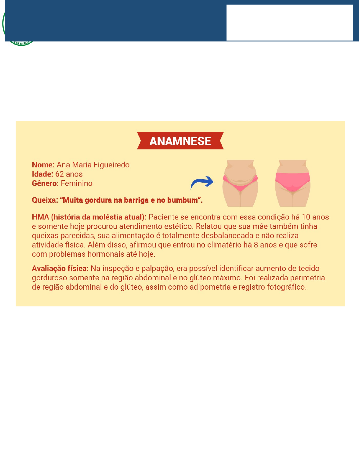 ( ESTUDO DE CASO )ESTUDO DE CASO O tratamento estético mediante as disfunções que envolvem o tecido adiposo vem ganhando muito espaço e ranqueando muitas técnicas e manuseios para tal, pois a procura aumenta devido ao estilo de vida da população. Fazendo uma boa avaliação, você está apto a realizar boas condutas com seus pacientes e trazer ótimos resultados. Assim, veja o caso clínico a seguir: Você faz parte de um centro de estética de seu Município. Uma paciente de meia-idade se apresenta com algumas queixas durante sua anamnese, e seu exame físico contrasta com a disfunção de lipodistrofia localizada. Analise o caso e, em seguida, busque responder aos questionamentos propostos. Considerando a avaliação e os dados informados, responda às perguntas: a) Qual disfunção pode ser encontrada na paciente? Justifique sua resposta. b) Quais os melhores tratamentos a serem utilizados nesse caso? Quais os objetivos de cada um deles? c) Quais orientações devem ser dadas à paciente? R: a )Caixa de gordura localizada na barriga e no bumbum que foi vista na avaliação física e da história que ela contou B) Criolipólise A criolipólise é um procedimento estético que utiliza baixas temperaturas para eliminar a gordura localizada. Ao encostar o aparelho na superfície da pele, a gordura é congelada. As células de gordura se rompem ao atingirem uma temperatura negativa, isso faz com que o organismo expila essas células de forma natural. Com a criolipólise é possível eliminar até 25% da gordura na região submetida ao procedimento após três meses de tratamento. A criolipólise é contraindicada para: • Gestantes; • Pessoas alérgicas ao frio; • Áreas com alta flacidez; • Áreas com tumor. Radiofrequência A radiofrequência é um procedimento estético que pode ser realizado no corpo e no rosto. O procedimento é realizado através de um laser que aumenta a temperatura da pele até 42 °C. Esse aquecimento atinge as camadas de colágenos, fibras musculares e células de gordura. A radiofrequência torna a pele mais saudável e queima a gordura localizada da região. Durante o procedimento, as células de gordura ficam menores, o que faz com que seja notável a diminuição de medidas. A radiofrequência é contraindicada para: • Áreas com tumor; • Gestantes; • Pessoas com prótese; • Pessoas com DIU de cobre. Ultrassom Os procedimentos estéticos por meio de utrassom emitem ondas sonoras que causam vibrações mecânicas nos tecidos subcutâneos. Essa vibração aumenta a circulação sanguínea no local e com isso alteram a permeabilidade das células de gordura, fazendo com que o conteúdo dessas células seja eliminado pelo organismo. Os procedimentos estéticos que utilizam ultrassom são contraindicados para gestantes e pessoas com: • Próteses metálicas; • Marca-passo; • Tecidos neoplásicos; • Diabetes. C) Recomendamos que antes de realizar um dos procedimentos estéticos citados acima para eliminar a gordura localizada, E procurar fazer uma alimentação balanceada com o acompanhamento de uma nutricionista e praticar atividade física.