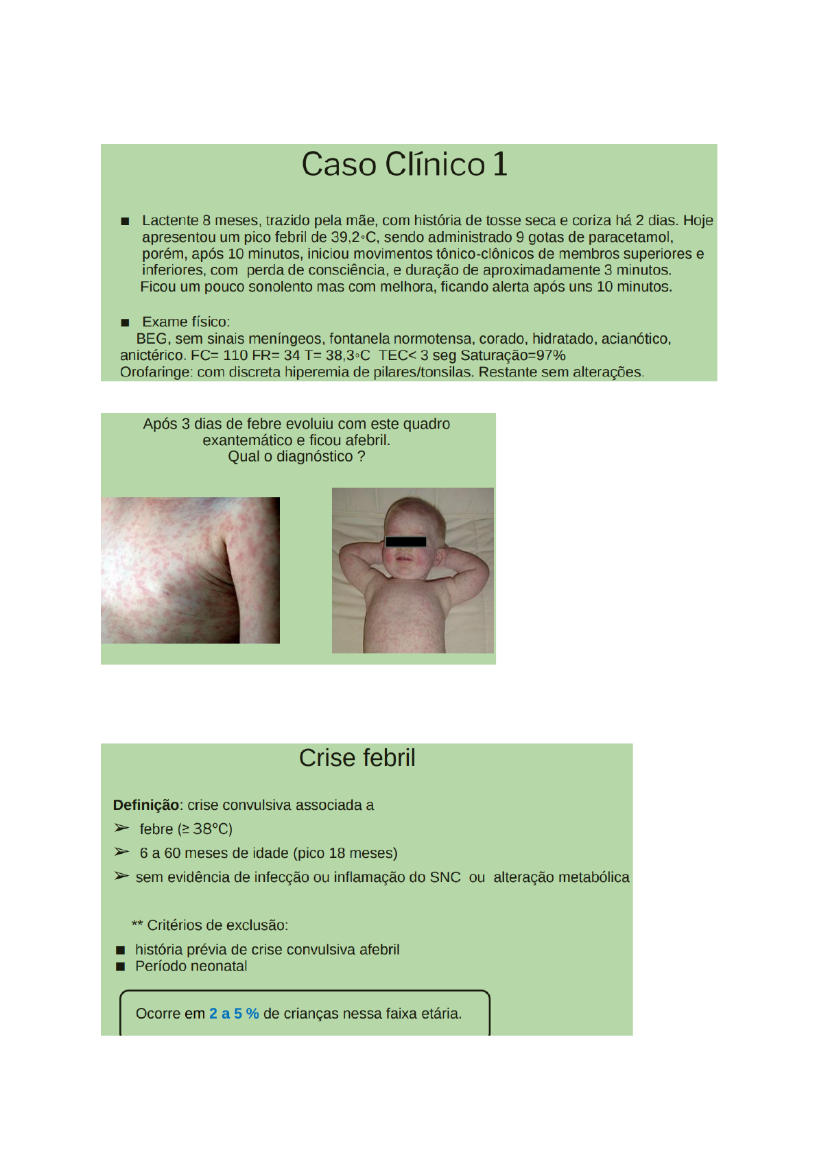 Crise Febril hipotese diagn: crise febril Roséola (faixa etária de 6m a 3 anos de idade); Sintomas: febre, e depois de alguns dias aparece exantema máculo papular, róseo. Apareceu exantema, febre desaparece rapidamente. febre: A partir de 37,8 ºC - Precisa ter certeza que não há infecção de sistema nervoso central (ex-meningite) ou alteração metabólica. - Rośeola-febre alta e súbita SCR (tríplice)- pode ter febre um dia ou dois depois. (diferente de sarampo que pode dar 1 semana depois). pós ictal- pós convulsão. 80% das crises convulsivas nao se repetem em 24h na crise febril simples (benigna) Benigna= crise febril simples mais de 5 minutos- potencial de lesão neuronal e mais resistente a medicação. recorrência- ter febre de novo e convulsionar a partir de 1 ano tem sinais mais claros. precisa saber esse slide preocupação constante: saber se é crise febril ou se há infecção de SNC sinais meníngeos- a partir dos 6 meses. - Necessário ver as vacinas- Pneumo 10, Meningo C, Hib (penta tem Hib) uso de antibiótico- vc mascara a evolução da meningite e demora a dar diagnóstico de meningite. posição bem correta, sentir espaço que vai puncionar. - fontanela abaulada tb é sinal de meningite aumento da HIC: cefaleia, vômito Ressonância é a melhor imagem para ver SNC mas se só tiver TC, pode fazer hipoglicemia pode dar crise convulsiva. antitérmico- importante para baixar a febre e evitar crises recorrentes naquele dia. nao usar nada; se tiver anticonvulsivante nao usar pois pode causar depressão respiratória. - Crise febril simples (ou benigna) - perguntar se teve crise afebril anterior? (crise afebril antes de uma crise febril, pode sugerir epilepsia. Entao precisa saber) - tem alguma doença neurológica? - observar se está associado a SNC - Olhar vacinação (vacinas podem cursar c febre- Pertusis dia anterior e sarampo uma semana) - exame fisico- se ha sinais meníngeos (se nao tiver, nao precisa colher liquor) - observação por 24h