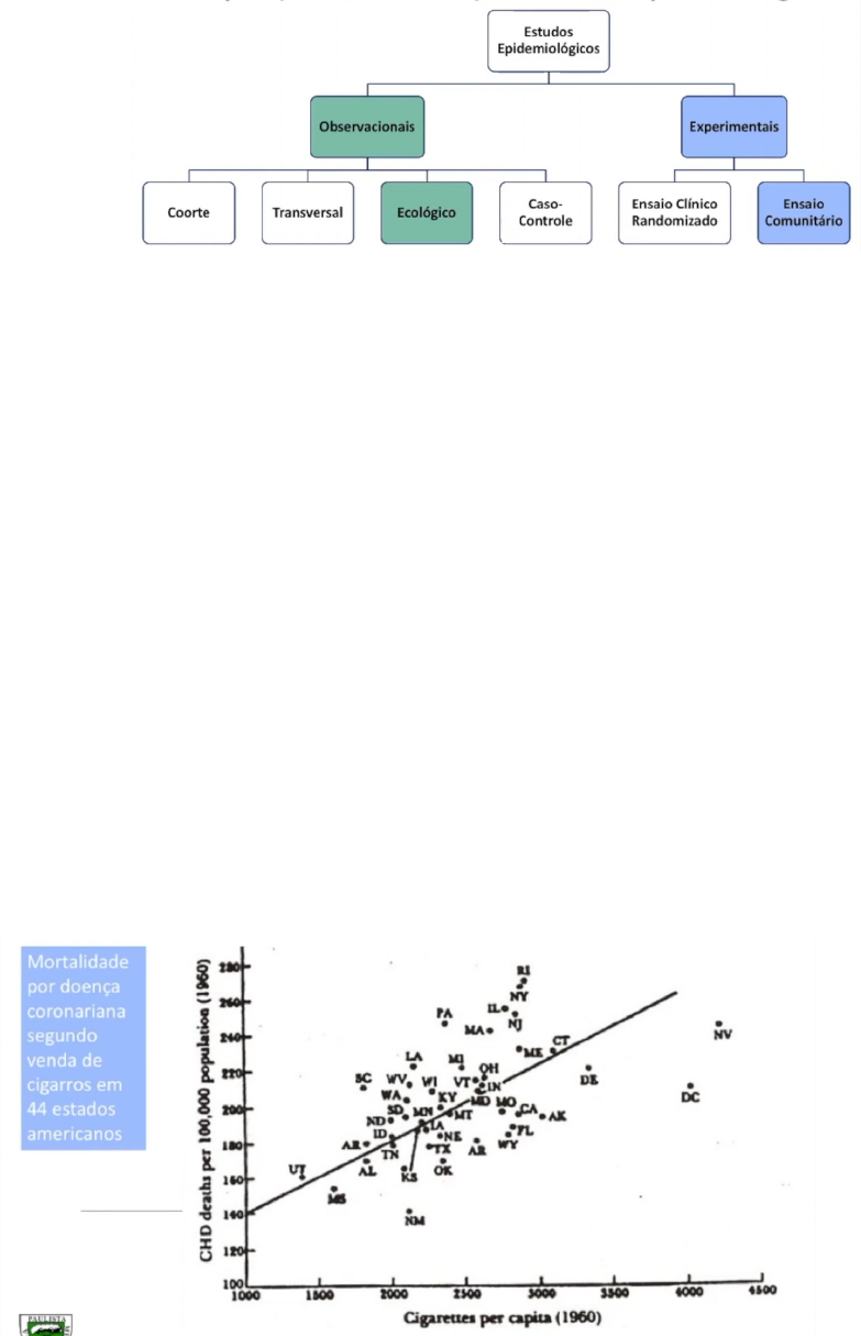 Estudos ecológicos Tipos de estudos epidemiológicos Uso de banco de dados para obter informações da população. Observacional - ecológico: pesquisador não interfere na exposição. Experimental - ensaio comunitário: melhoria da situação de saúde pública. Estudos ecológicos ou agregado Unidade de análise: populações (não são indivíduos). A sobre exposição e o desfecho são obtidos de forma agregada e se referem a grupos populacionais (ex.: bairros, cidades, países, escolas etc). Frequentemente são utilizados dados colhidos rotineiramente. Esse estudo pode ser equivalente a diferentes áreas geográficas comparadas num mesmo ponto no tempo ou a uma única área geográfica acompanhada em tempos diferentes. Classificações: observacional, ecológico, descritivo/analítico e transversal/prospectivo. Consiste na etapa exploratória na investigação de uma possível relação causal entre uma exposição e um desfecho, sendo apropriada para monitorar a efetividade de intervenções populacionais. Exemplo: Essa observação inicial contribuiu para a formulação da hipótese de que o tabagismo poderia causar doença coronariana. Tipos de variáveis Medidas agregadas: resumem características dos indivíduos de um grupo: valores médios e proporção de população/grupo de interesse de determinada característica. Exemplos: taxa de incidência de uma doença, prevalência de tabagismo e renda média. Medidas ambientais: representam características físicas da localidade geográfica onde reside o grupo de interesse, sendo que os indivíduos da mesma localidade podem apresentar diferentes graus de exposição a uma característica. Exemplos: intensidade da poluição e horas diárias de sol. Medidas globais: representam características do grupo que não são redutíveis a características individuais, ou seja, não apresentam análogos no nível individual. Exemplos: sistema político, tipos de sistema de saúde, acesso aos serviços de saúde, regulamentos, leis, desigualdades e iniquidades. Medidas de associação O coeficiente de correlação quantifica a relação linear entre exposição e doença e reflete a extensão em que cada variável consegue predizer a outra, ou seja, para cada mudança de uma unidade no nível de exposição, a frequência da doença aumenta (ou diminui) proporcionalmente. O valor do coeficiente pode variar de: r = - 1 (perfeita correlação negativa) a r = + 1 (perfeita correlação positiva). Estudos ecológicos segundo a unidade de análise Exemplos: Achados do estudo ecológico acima: média de consumo de sódio no país relacionada à prevalência de hipertensão no país. Quanto cada indivíduo ingere de sódio? Em quem a doença incidiu? Terá sido o sódio o responsável pela diferença observada nas prevalências? Falácia ecológica Estudos coletivos fornecem informações valiosas sobre variações no tempo e espaço, porém podem estar sujeitos à falácia ecológica, ou seja, a conclusão observada no nível agregado pode não ser verdadeira no âmbito individual. Viés de agregação e falácia ecológica Nesses estudos, a relação “exposição-doença”, observada a nível do grupo, dificilmente reflete a relação “exposição-doença” a nível individual. A observação da existência de uma relação entre duas variáveis a nível populacional não implica que a mesma relação se mantenha a nível individual. Exemplos: Estudo ecológico, série temporal, descritivo: Ensaio comunitário Política de fortificação das farinhas de trigo e milho com ácido fólico para prevenção da má-formação do tubo neural. Fluoretação da água de abastecimento público. Obrigatoriedade do uso de cinto de segurança no automóvel. Resumindo…